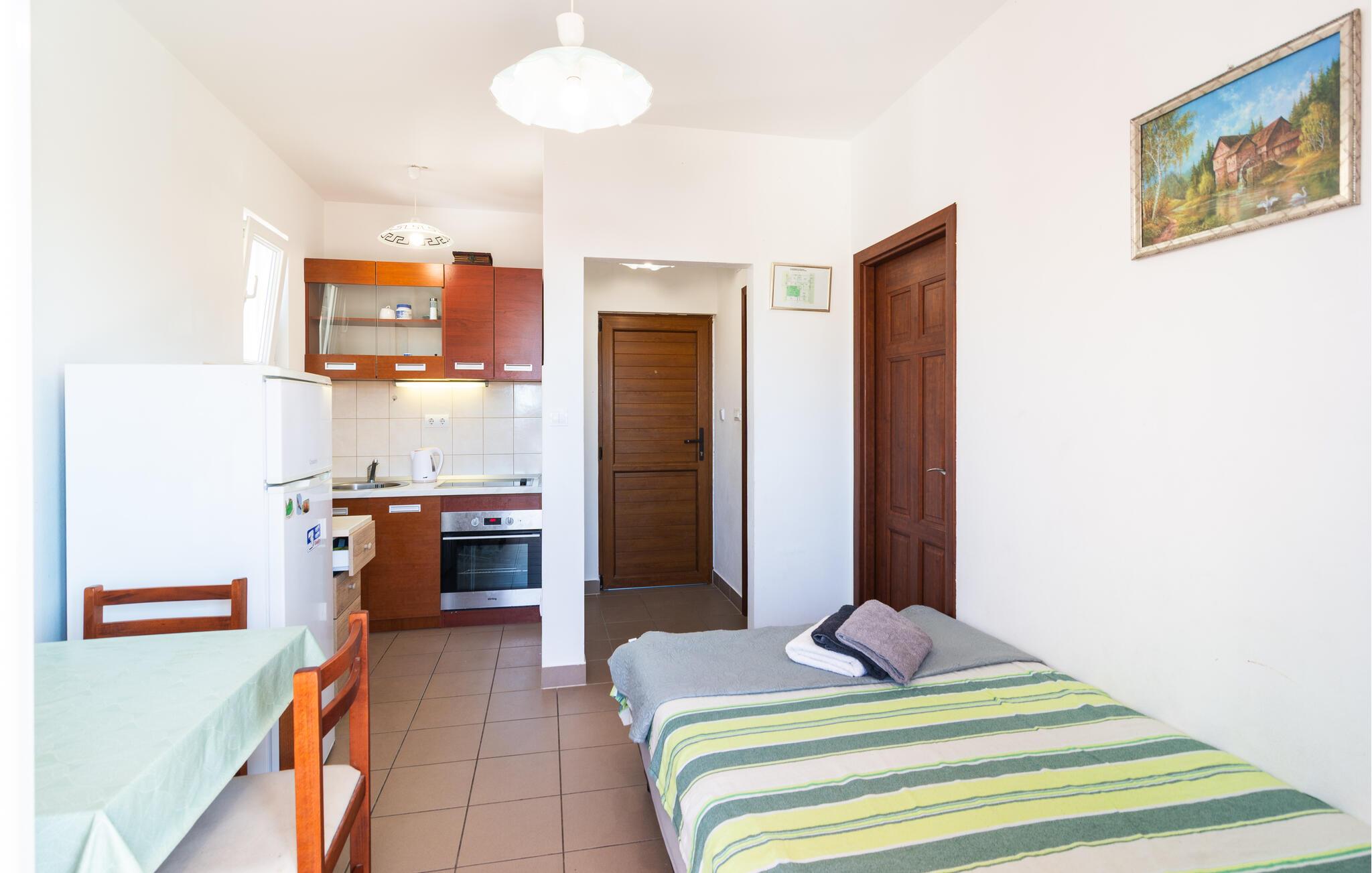Freuen Sie sich auf Ihre Auszeit in dieser kompakten Ferienwohnung, die Ihnen eine gute Basis für schöne Ausflüge an das Meer bietet. Nutzen Sie die kleine Küchenzeile, um unkomplizierte Mahlzeiten zuzubereiten, nehmen Sie am Esstisch Platz und genießen Sie Ihre freie Urlaubszeit in geselliger Runde. Entspannen Sie auf dem Sofa, das gleichzeitig als Schlafmöglichkeit dient, und verbringen Sie ruhige Abende vor dem Fernseher.