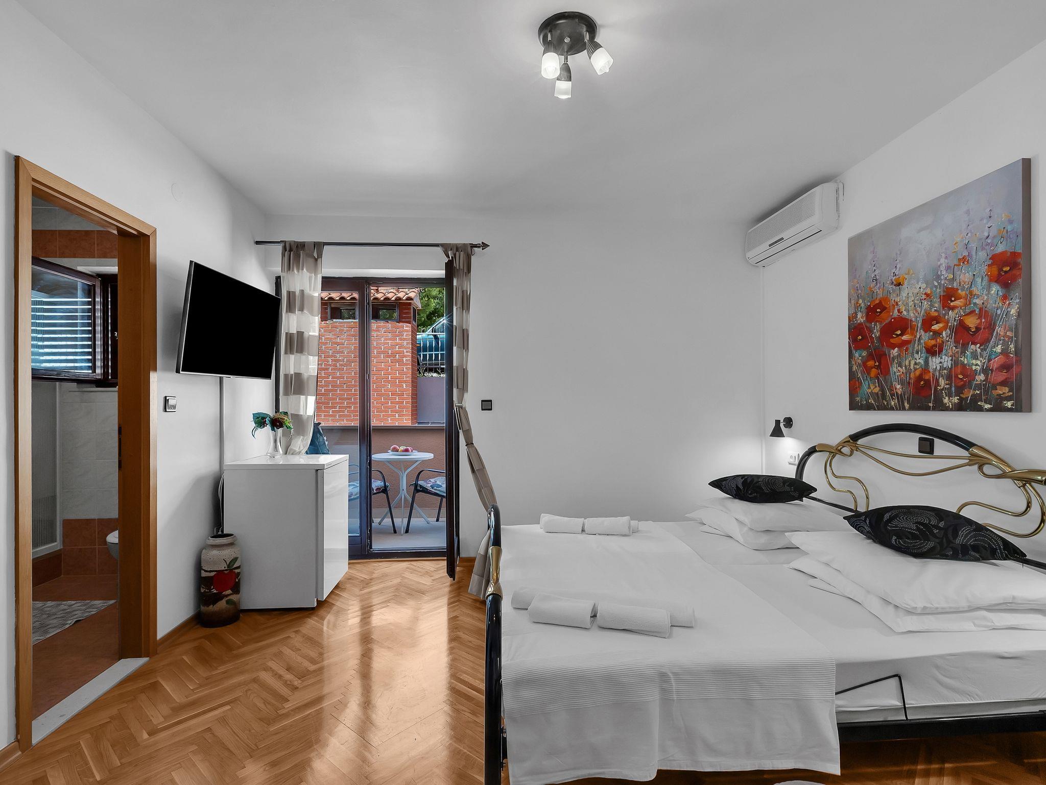 Zimmer bietet Platz für 3 Gäste. Die Betten sind in Schlafzimmern, die es 1 gibt, innerhalb einer Gesamtfläche von 19m2, angeordnet. Die Gäste haben einen eigenen Balkon zur Verfügung, auf der sie in warmen Sommernächten genießen können. In der Unterkunftseinheit besteht die Möglichkeit des Mitbringens von Haustieren gegen Aufpreis. Die reservierte Unterkunftseinheit ist ein Zimmer mit eigenem Badezimmer ohne die Möglichkeit der Nutzung einer Küche. IM PREIS INBEGRIFFEN: Kurtaxe, Endreinigung, Klimatisierung, Parkplatz, Internet, Bügeleisen, Bügelbrett, Föhn. VERBINDLICHE ZUSÄTZLICHE KOSTEN: Aufzahlung für Kurzaufenthalte (prozentualer Zuschlag pro Nächtigungsanzahl: 30% - 1, 20% - 2, 10% - 3). UNVERBINDLICHE ZUSÄTZLICHE KOSTEN: Haustiere (10,00 € pro Nacht). Die Verfügbarkeit zusätzlicher Dienstleistungen in Ihrem reservierten Termin und die Preise derselben (falls nicht aufgeführt) müssen im Voraus überprüft werden. Zusätzliche Dienstleistungen die in der Zahlungsaufforderung nicht aufgeführt sind werden direkt beim Vermieter bezahlt, angenommen der Gast nutzt auch diese. Ermäßigung auf den Grundpreis: Gratistag 14=13 (bei einem Aufenthalt von 14 Tagen oder mehr erhalten Sie einen Gratistag für den Aufenthalt bis 31.12.26).