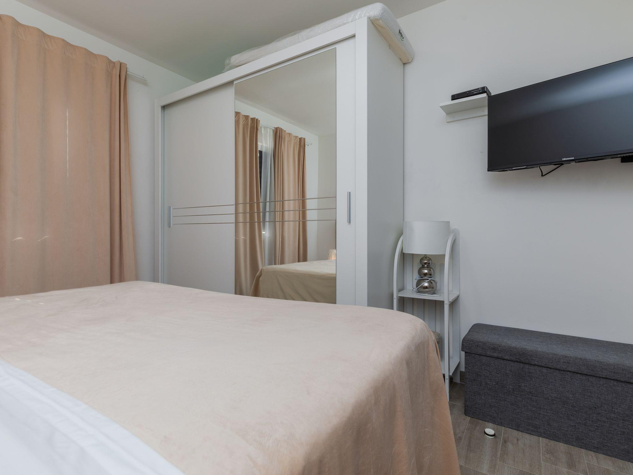 Ferienwohnung bietet Platz für 4 Gäste. Die Betten sind in Schlafzimmern, die es 2 gibt, innerhalb einer Gesamtfläche von 81m2, angeordnet. Die Gäste haben eine eigene Terrasse zur Verfügung, auf der sie in warmen Sommernächten genießen können. Das Apartment bietet Meerblick. Für vollen Genuss und Entspannung gibt es einen privaten Grill für Gäste dieser Unterkunft. IM PREIS INBEGRIFFEN: Kurtaxe, Endreinigung, Klimatisierung, Parkplatz, Internet, Kinderbett, Bügeleisen, Bügelbrett, Föhn, Sonnenschirm. VERBINDLICHE ZUSÄTZLICHE KOSTEN: Aufzahlung für Kurzaufenthalte (prozentualer Zuschlag pro Nächtigungsanzahl: 30% - 1, 20% - 2, 10% - 3). Die Verfügbarkeit zusätzlicher Dienstleistungen in Ihrem reservierten Termin und die Preise derselben (falls nicht aufgeführt) müssen im Voraus überprüft werden. Zusätzliche Dienstleistungen die in der Zahlungsaufforderung nicht aufgeführt sind werden direkt beim Vermieter bezahlt, angenommen der Gast nutzt auch diese.