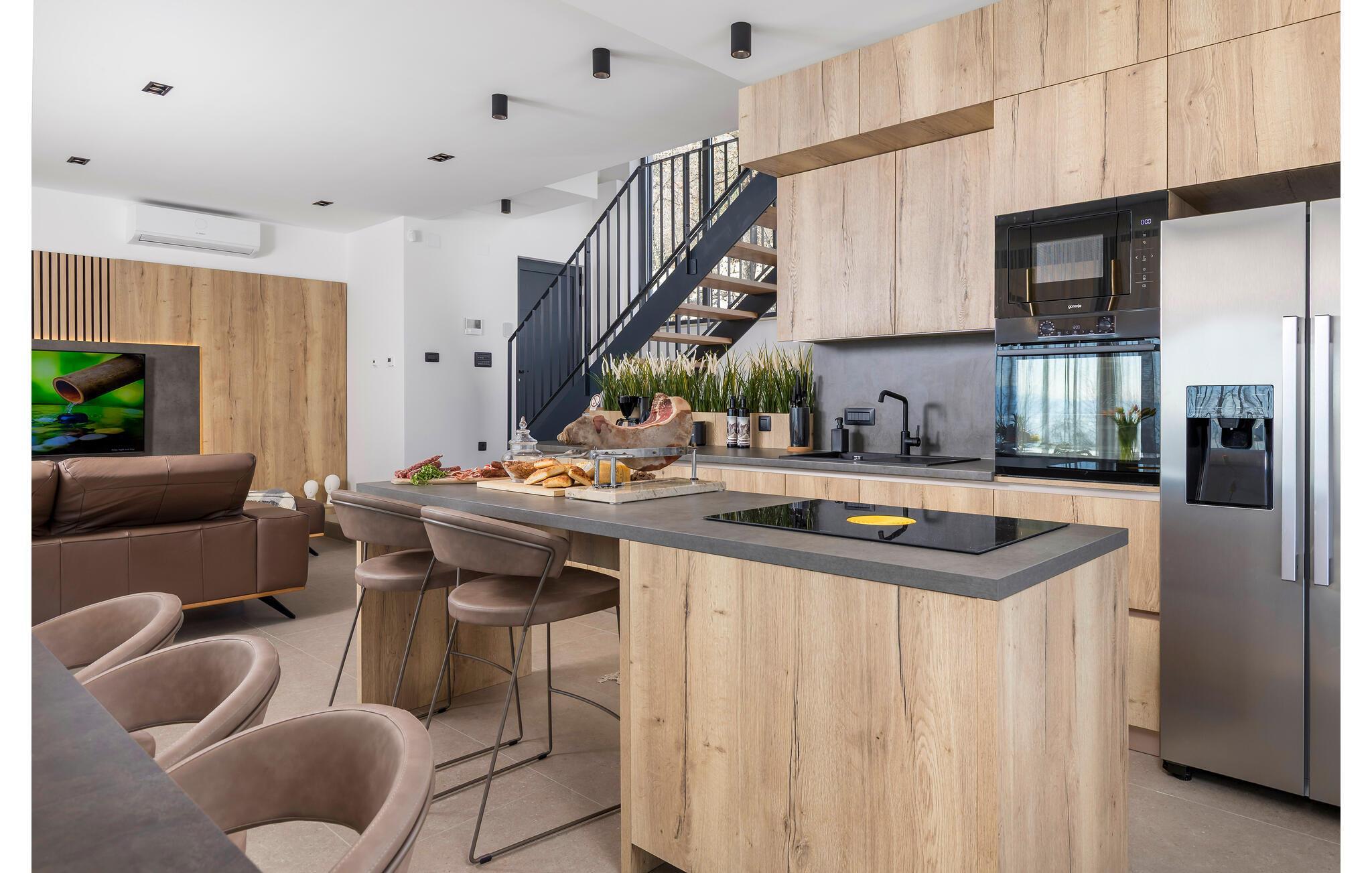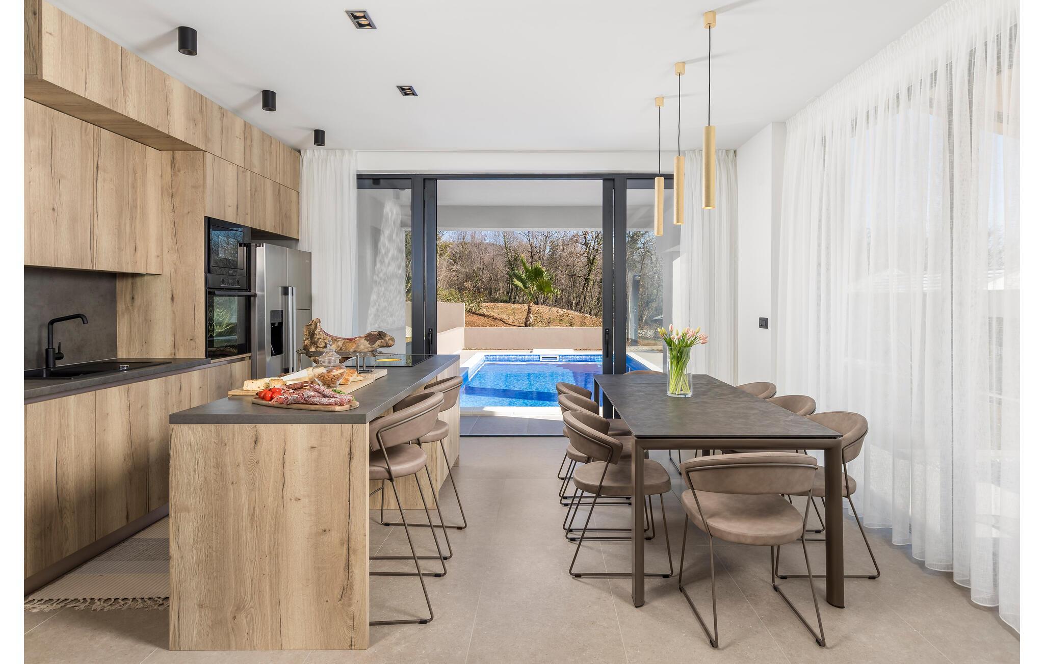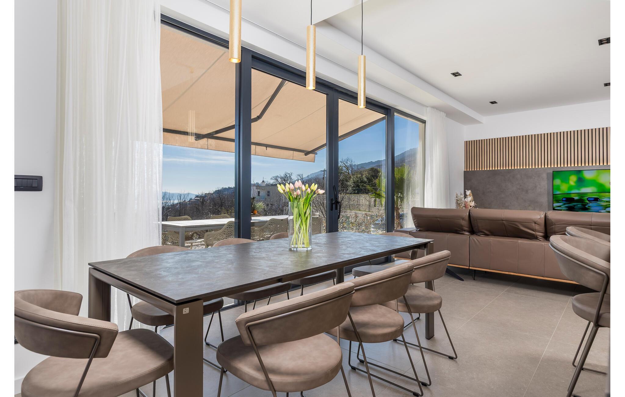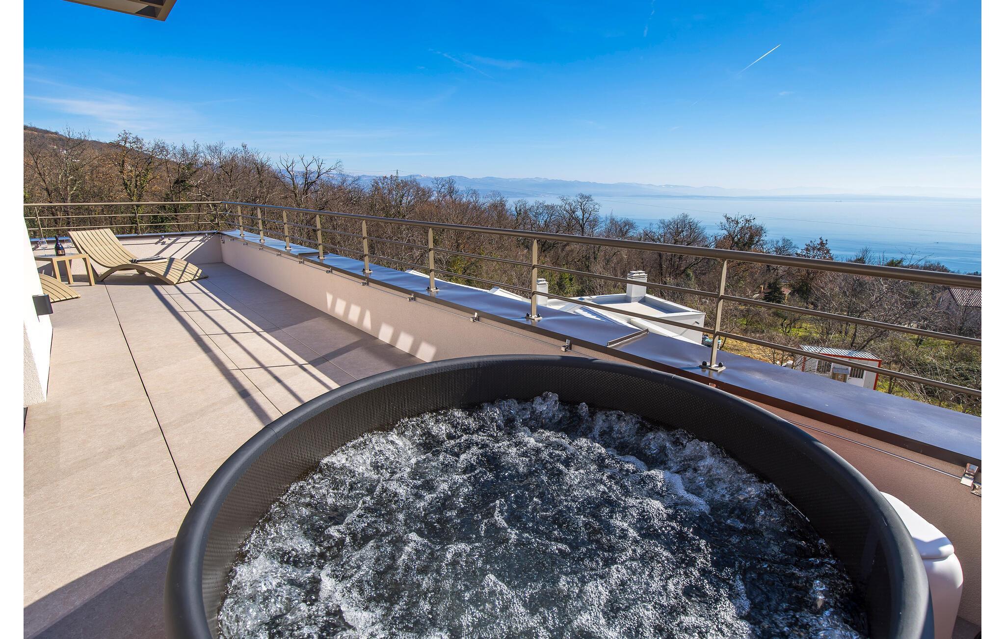 In erhabener Lage auf den Hügeln oberhalb des berühmten Opatija genießen Sie in diesem exklusiven Domizil einen sensationellen Blick auf die Kvarner Bucht und die Inseln Krk und Cres. Das hochwertig und geschmackvoll eingerichtete Interieur wird durch bodentiefe Fenster mit Licht durchflutet und schafft eine elegante, einladende Atmosphäre. Genießen Sie gesellige Abende am großzügigen Esstisch oder entspannen Sie sich auf dem komfortablen Sofa bei einem Film. Gönnen Sie sich Ruhe in der Sauna oder trainieren Sie im Fitnessraum.