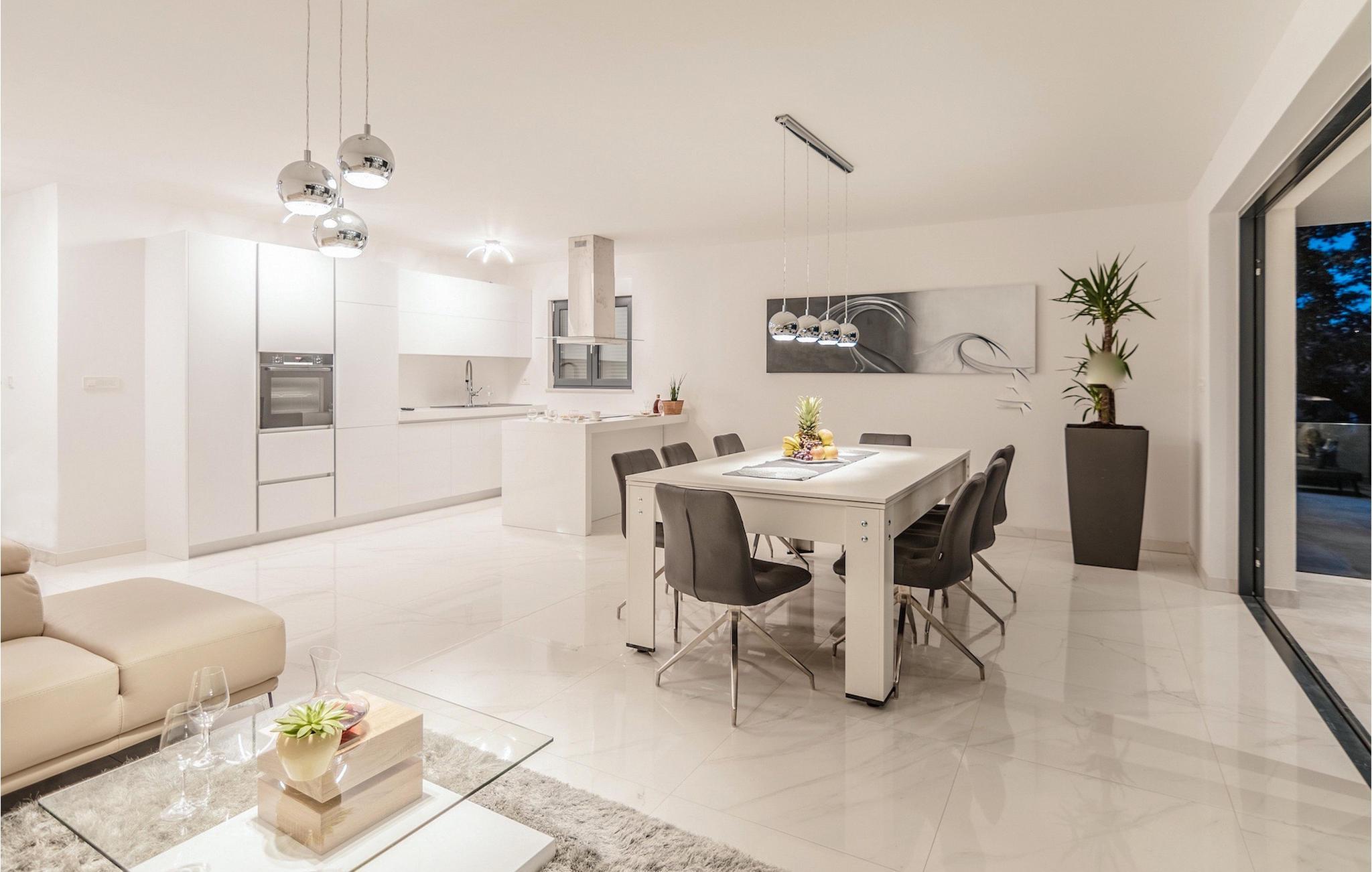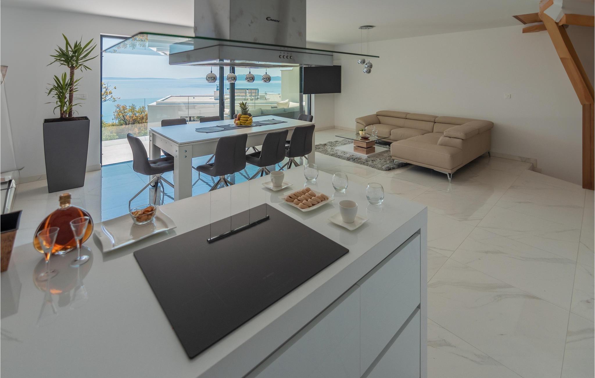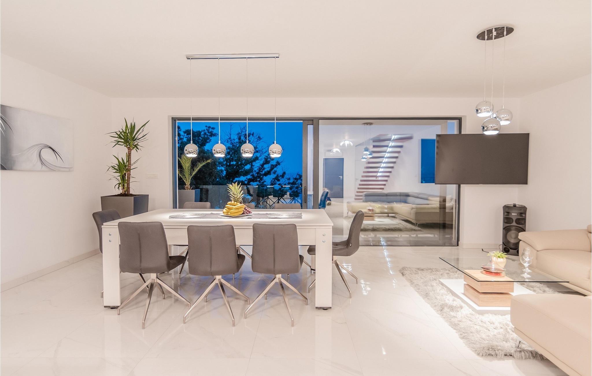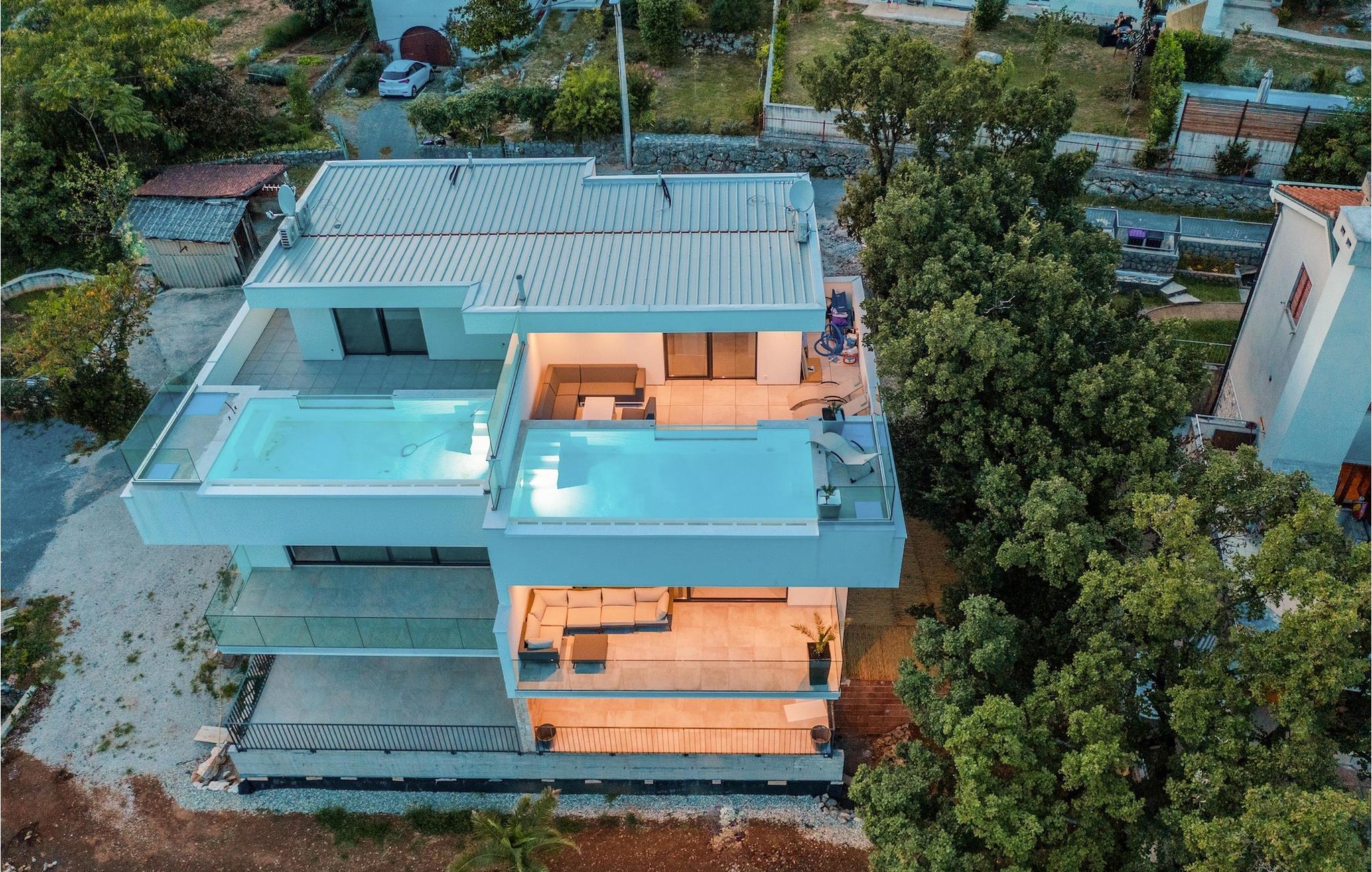 Die Villa ist in drei Ebenen unterteilt. Im Erdgeschoss befinden sich zwei Doppelbettzimmer mit jeweils eigenem Bad mit Dusche, TV und Klimaanlage. Im ersten Stock befinden sich ein moderner Wohn- und Essbereich mit Küche und ein Badezimmer. Der Esstisch lässt sich leicht zu einem Billardtisch umwandeln. Auf derselben Etage gibt es ein Extrazimmer für zwei Kinder mehr auf Anfrage. Die imposante Holztreppe führt zu einem weiteren Schlafzimmer mit Doppelbett im zweiten Stock. Das Zimmer verfügt über eigenes Badezimmer, TV und Klimaanlage. Auf jeder Etage dieser Villa steht Ihnen jeweils eine Terrasse zur Verfügung, auf der Sie mit Familie und Freunden die Sonne oder den Sternenhimmel genießen können. Den Pool auf dem Dach der Villa, der zum Schwimmen über den Wolken der Kvarner Bucht einlädt, werden Sie nur ungern verlassen.