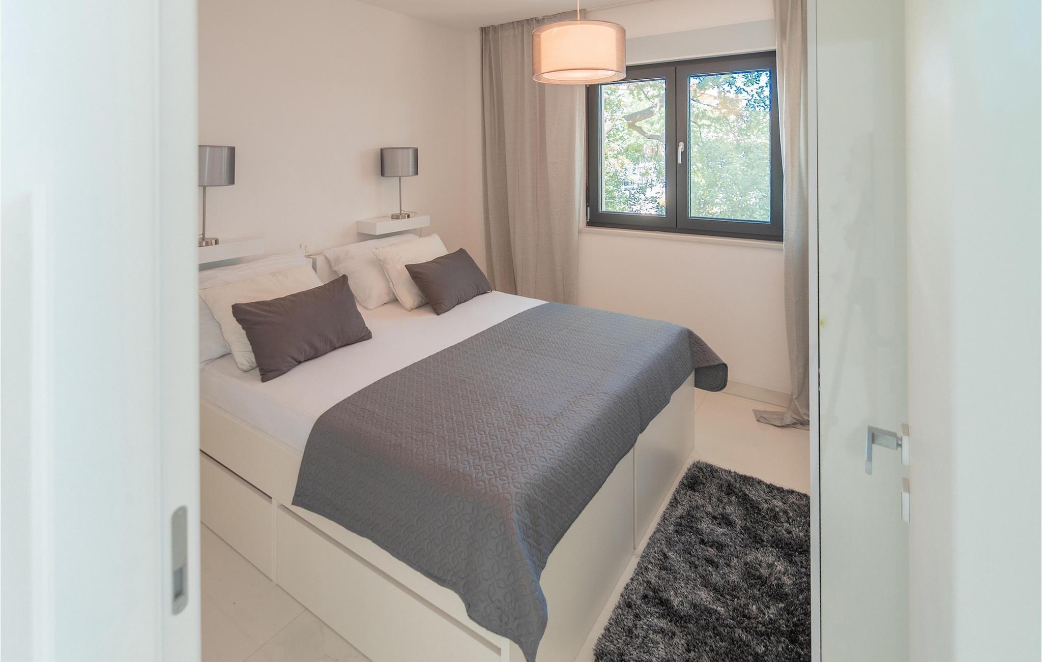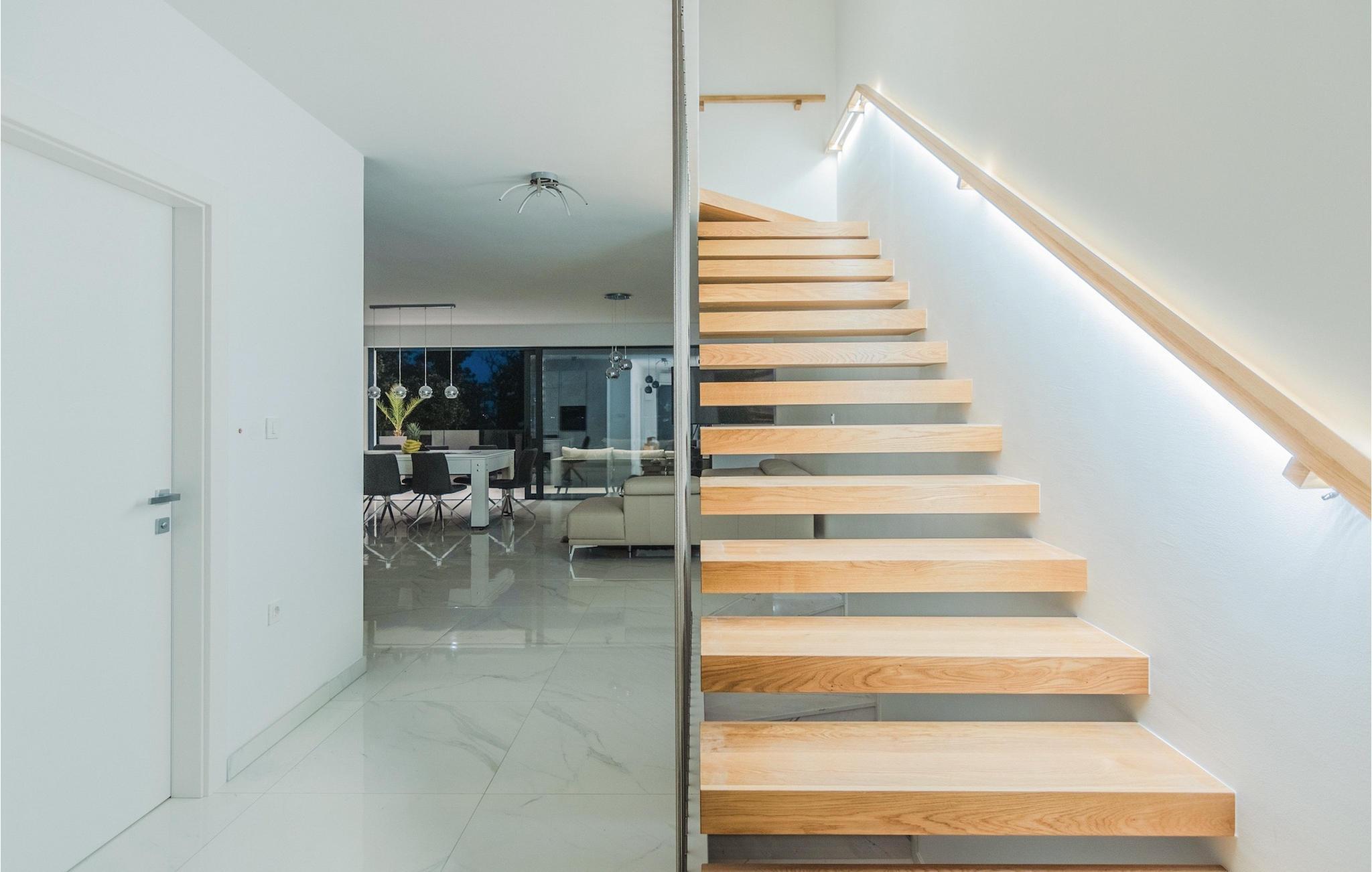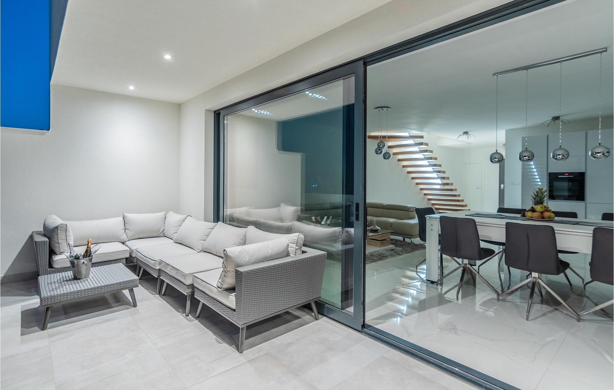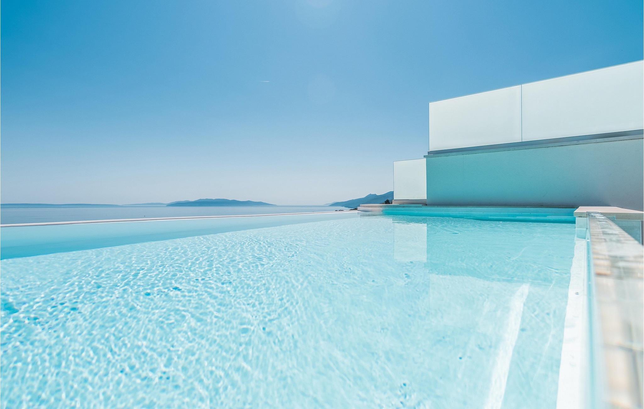 Die Villa ist in drei Ebenen unterteilt. Im Erdgeschoss befinden sich zwei Doppelbettzimmer mit jeweils eigenem Bad mit Dusche, TV und Klimaanlage. Im ersten Stock befinden sich ein moderner Wohn- und Essbereich mit Küche und ein Badezimmer. Der Esstisch lässt sich leicht zu einem Billardtisch umwandeln. Auf derselben Etage gibt es ein Extrazimmer für zwei Kinder mehr auf Anfrage. Die imposante Holztreppe führt zu einem weiteren Schlafzimmer mit Doppelbett im zweiten Stock. Das Zimmer verfügt über eigenes Badezimmer, TV und Klimaanlage. Auf jeder Etage dieser Villa steht Ihnen jeweils eine Terrasse zur Verfügung, auf der Sie mit Familie und Freunden die Sonne oder den Sternenhimmel genießen können. Den Pool auf dem Dach der Villa, der zum Schwimmen über den Wolken der Kvarner Bucht einlädt, werden Sie nur ungern verlassen.