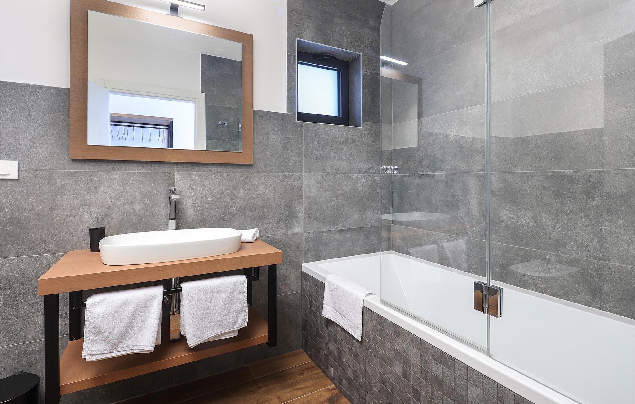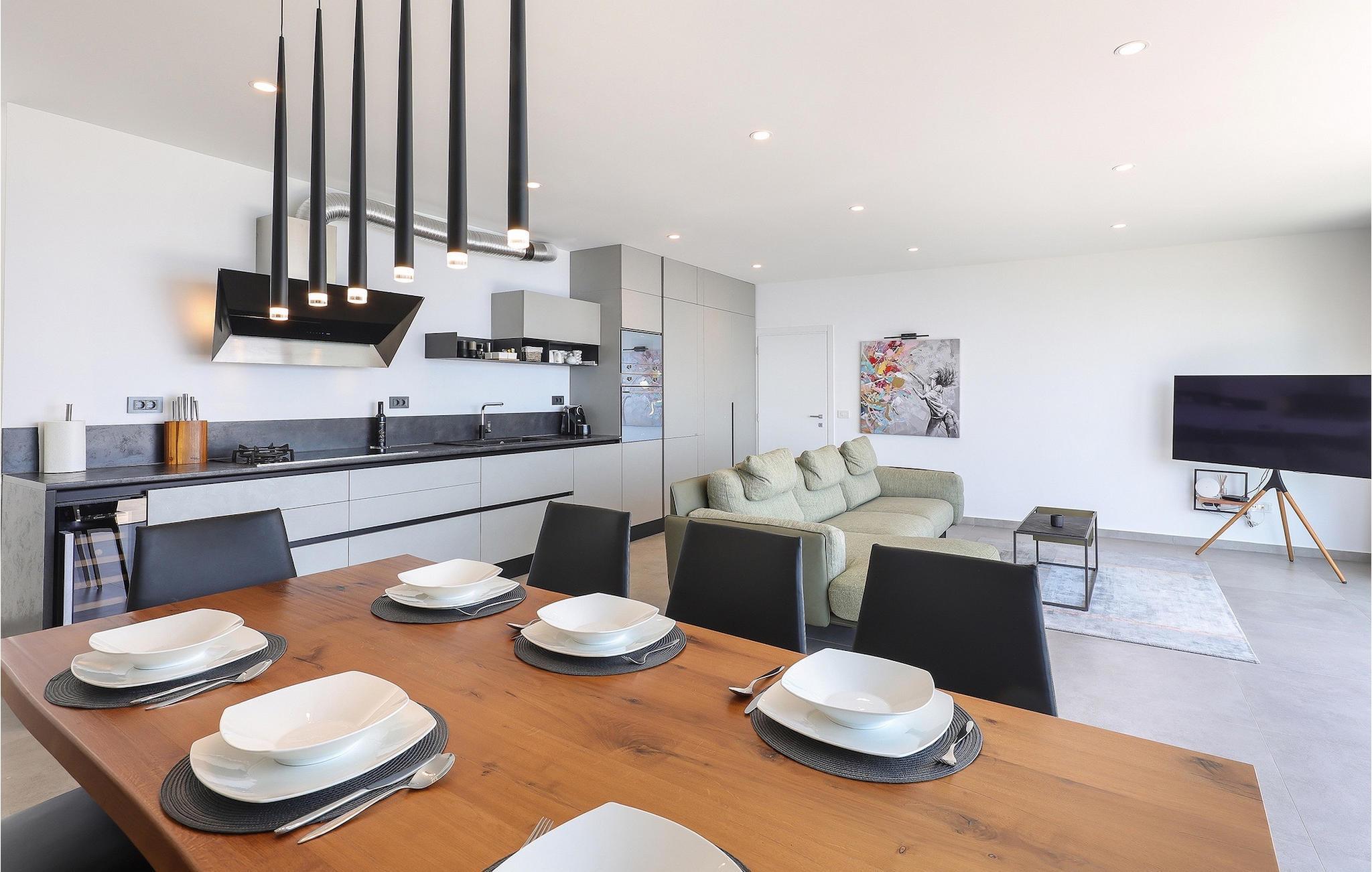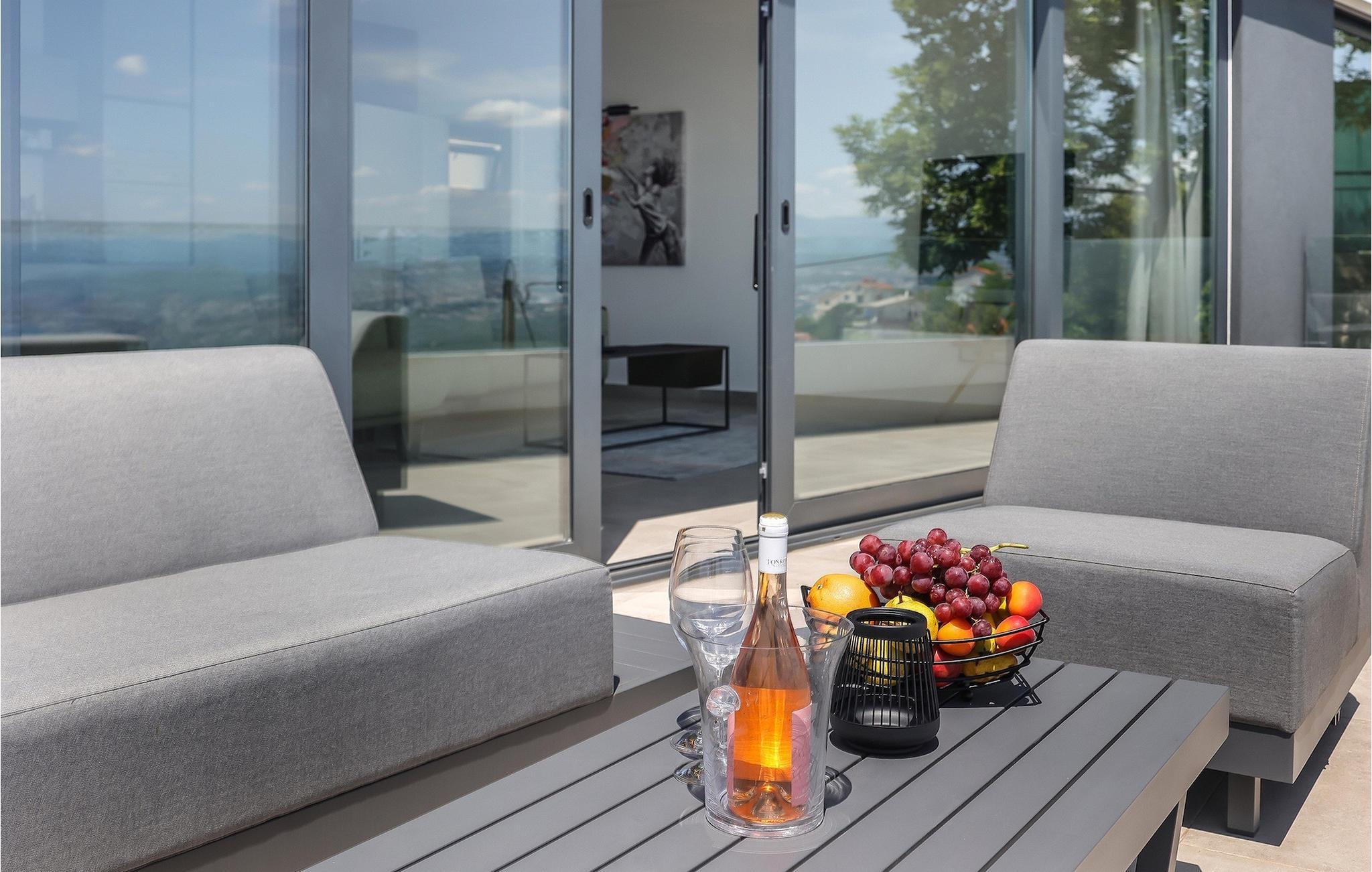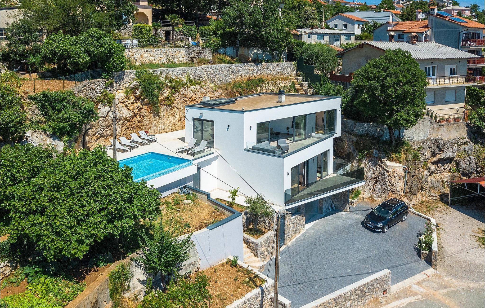 Ein Grill steht Ihnen ebenfalls zur Verfügung. Nutzen Sie die Gelegenheit, um Ihre Grillkünste unter Beweis zu stellen und Ihre Liebsten zu verwöhnen. Die Kinder können sich auf eine eignenen Spielplatz freuen! Betreten Sie von dem Poolbereich aus das Innere der Villa, so bietet sich die 1. Etage mit einem offenem, geschmackvoll eingerichteter Wohn- und Essbereich welcher mit einer komplett ausgestatteten Küche verbunden ist sowie ein Schlafzimmer mit Badezimmer. Der Innenbereich mit insgesamt 3 Schlafzimmer kann bis zu 8 Personen beherbergen. Im Erdgeschoss befinden sich zwei weitere Schlafzimmer und Badezimmer sowie ein Studio-Apartement mit Küche und Wohnbereich mit ausziehbarer Couch sowie ein Badezimmer. Jedes der schick eingerichteten Schlafzimmer verfügt über ein Balkon und Meerblick. Im Untergeschoss erwartet Sie ein Fitnessraum.Die Villa Grotta Opatija befindet sich oberhalb der bekannten Küstenstadt Opatija. Opatija ist schon seit einer langen Zeit ein anziehendes Touristenziel. Zahlreiche Denkmäler zu Ehren von bemerkenswerten Persönlichkeiten, die Opatija besucht haben, befinden sich hier. Die 12 km lange Lungomare Küstenpromenade ist bei den Gästen in Opatija besonders beliebt. Die beste Art, die Gegend kennenzulernen, ist durch einen Spaziergang durch Lungo Mare, die Volosko, ein charmantes kleines Fischerdorf, mit Lovran, der nächsten Stadt zu Icici, verbindet. Lungo Mare ist perfekt für romantische Spaziergänge am Abend mit Blick auf den malerischen Sonnenuntergang. Entlang der Kvarner Bucht finden Sie eine Vielzahl an traumhaften Stränden. Nach einem langen Tag voller Sonnenbaden und Sightseeing sollten Sie das Restaurantangebot in Opatija erkunden und die lokale Küche probieren. Sie werden sofort verstehen, warum Opatija den Titel “die Perle Adrias” trägt. Wenn Sie mehr als die nähere Umgebung entdecken möchten, sollten Sie mindestens einen der wunderschönen Inseln in der Kvarner Bucht - Cres, Losinj und Krk besuchen.