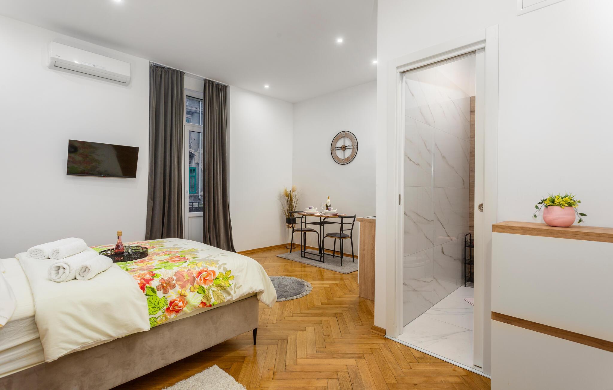 Dieses geschmackvoll eingerichtete Studio bietet Ihnen ein behagliches Refugium während Ihrer Entdeckungstouren durch die bezaubernde Hafenstadt Rijeka. Starten Sie den Tag mit einem ausgiebigen Frühstück, zubereitet in der modernen Küchenzeile, und genießen Sie Ihre Mahlzeiten am charmanten Essplatz. Verbringen Sie entspannte Abende bei einem guten Film und planen Sie die bevorstehenden Ausflüge bei einem Glas Wein.