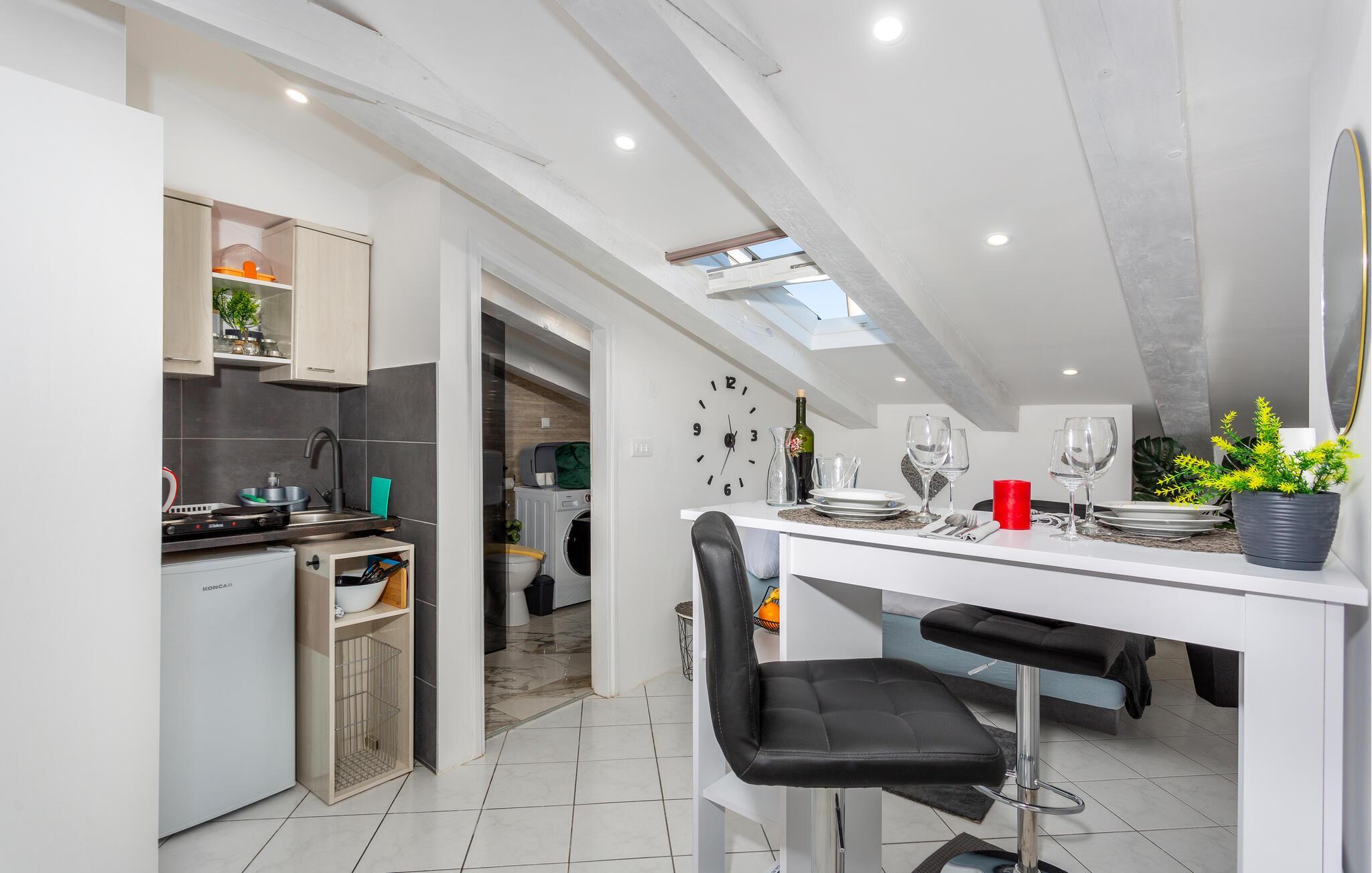 Verbringen Sie Ihren Urlaub in dieser Dachgeschosswohnung mitten im Zentrum von Rijeka. Die Unterkunft bietet Ihnen eine stilvolle, helle Atmosphäre für erholsame Tage zu zweit. Entspannen Sie nach einem Stadtbummel bei einem Glas Wein am Esstresen oder starten Sie mit einem frischen Kaffee entspannt in den Tag. Das Apartment ist modern eingerichtet und gut durchdacht auf kleinem Raum. Nutzen Sie die kompakte Küchenzeile für einfache Mahlzeiten.