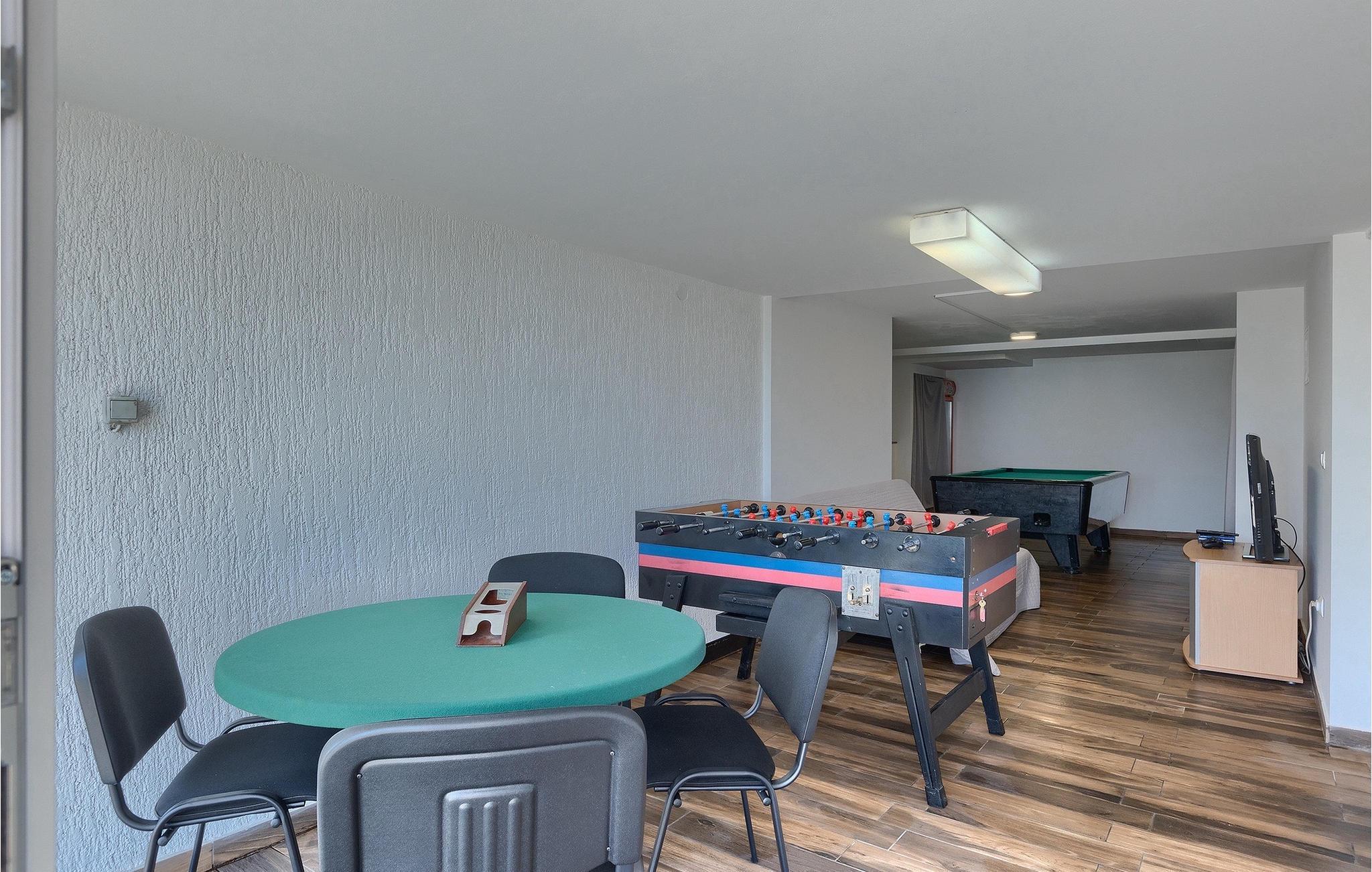 Der Innenraum besteht aus 4 Wohnungen. Im Erdgeschoss befinden sich zwei kleinere Wohnungen, die jeweils aus einem Wohnzimmer, einer Küche und einem Esszimmer sowie 1 Schlafzimmern und einem Bad bestehen. Diese Wohnungen bieten auch einen direkten Zugang zur Terrasse mit Pool. Im ersten Stock befinden sich zwei weitere Wohnungen, jeweils mit einem Wohnzimmer, einer Küche und einem Esszimmer, 3 schön eingerichteten Schlafzimmern und 2 Bädern. Aber das ist nicht alles! Jedes Zimmer bietet Ihnen Zugang zum Balkon, wo Sie die sommerliche Atmosphäre genießen können! Im Erdgeschoss der Villa zwischen 2 Wohnungen befindet sich auch ein Spielzimmer, wo Ihnen Tischtennis, Tischfußball, Billard und Darts zur Verfügung stehen, damit Sie sich nie langweilen!
