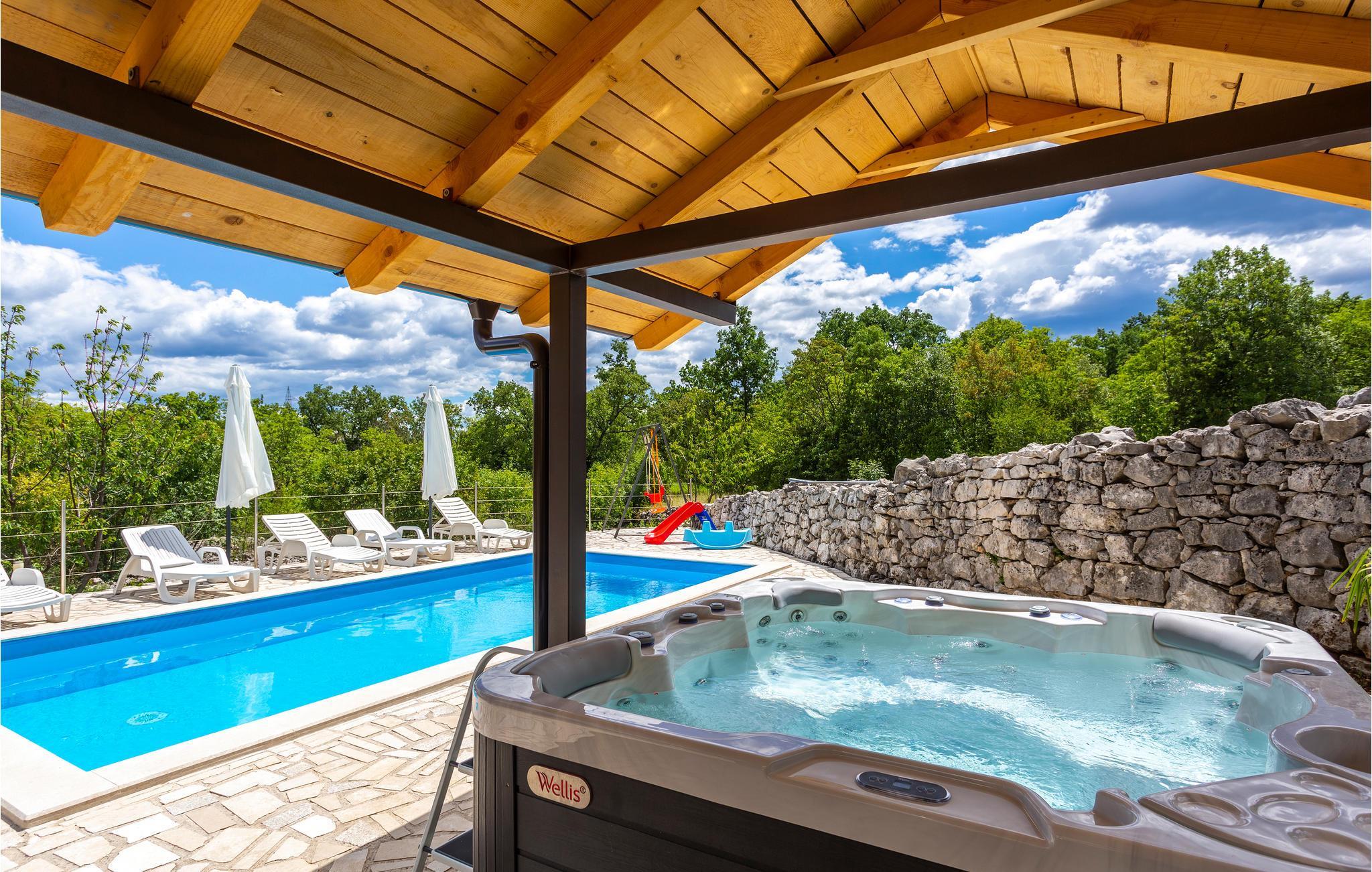Über der bezaubernden Bucht von Kvarn, in der Nähe von einem idyllischen Wald, liegt dieses kleine Ferienhaus mit Swimmingpool.