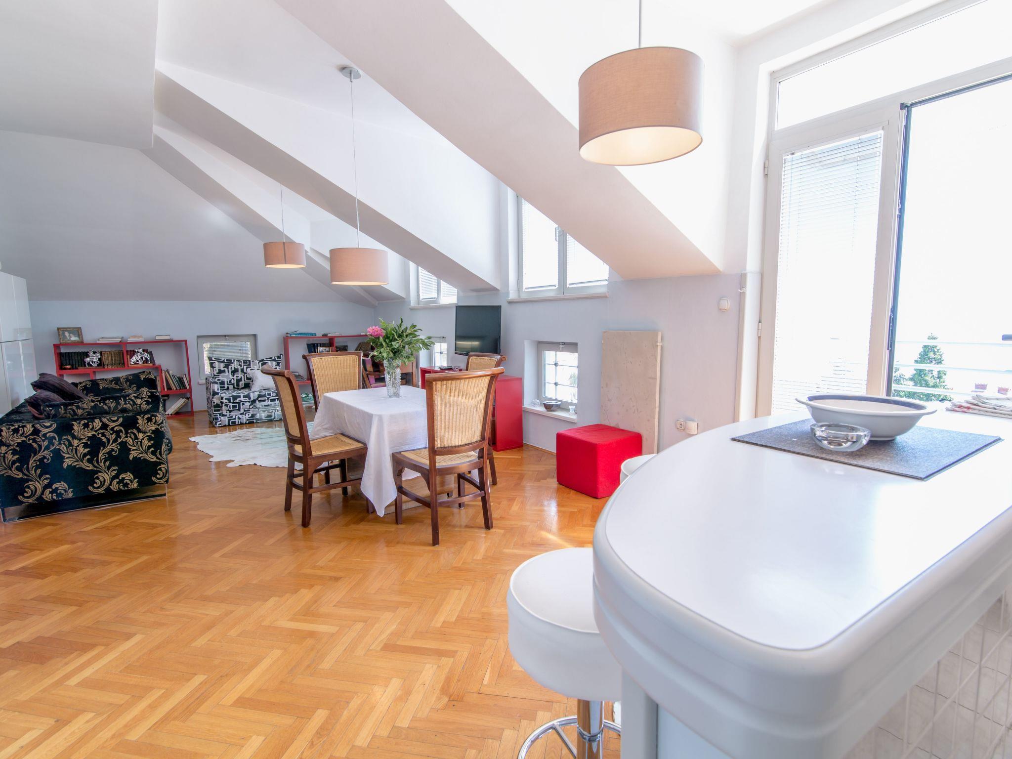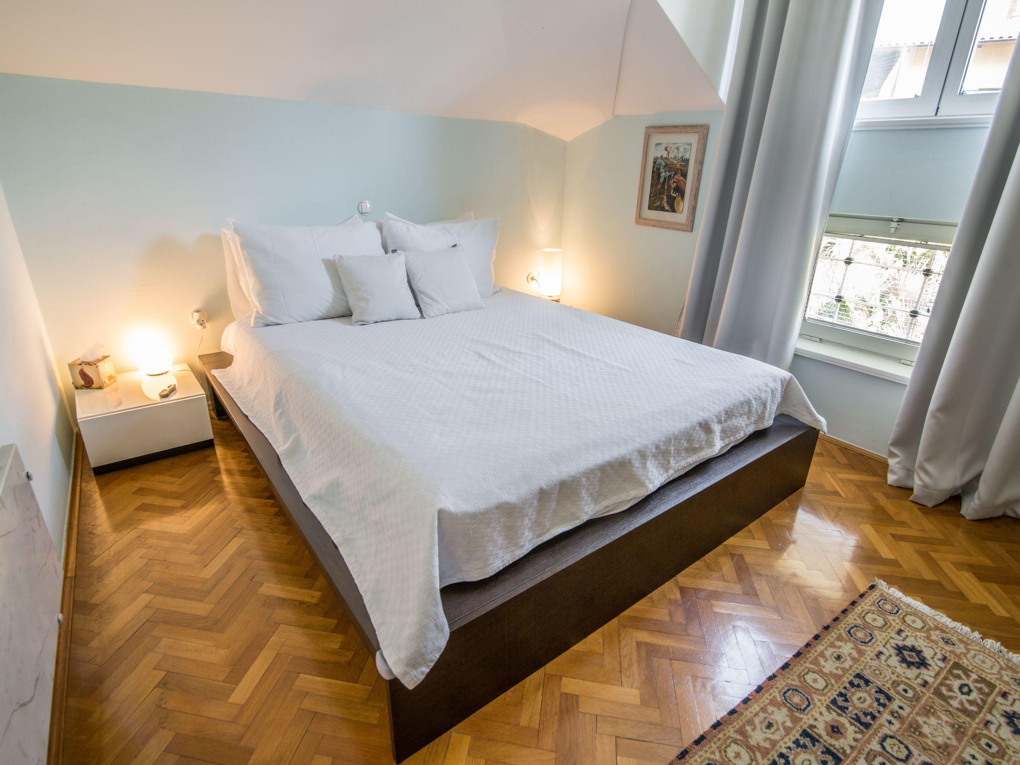 Die Ferienwohnung befindet sich in einer historischen Villa in ruhiger und sonniger Lage an einem Hang in einer Sackgasse in Opatija, nur 50 Meter vom Strand und vom Stadtzentrum entfernt.