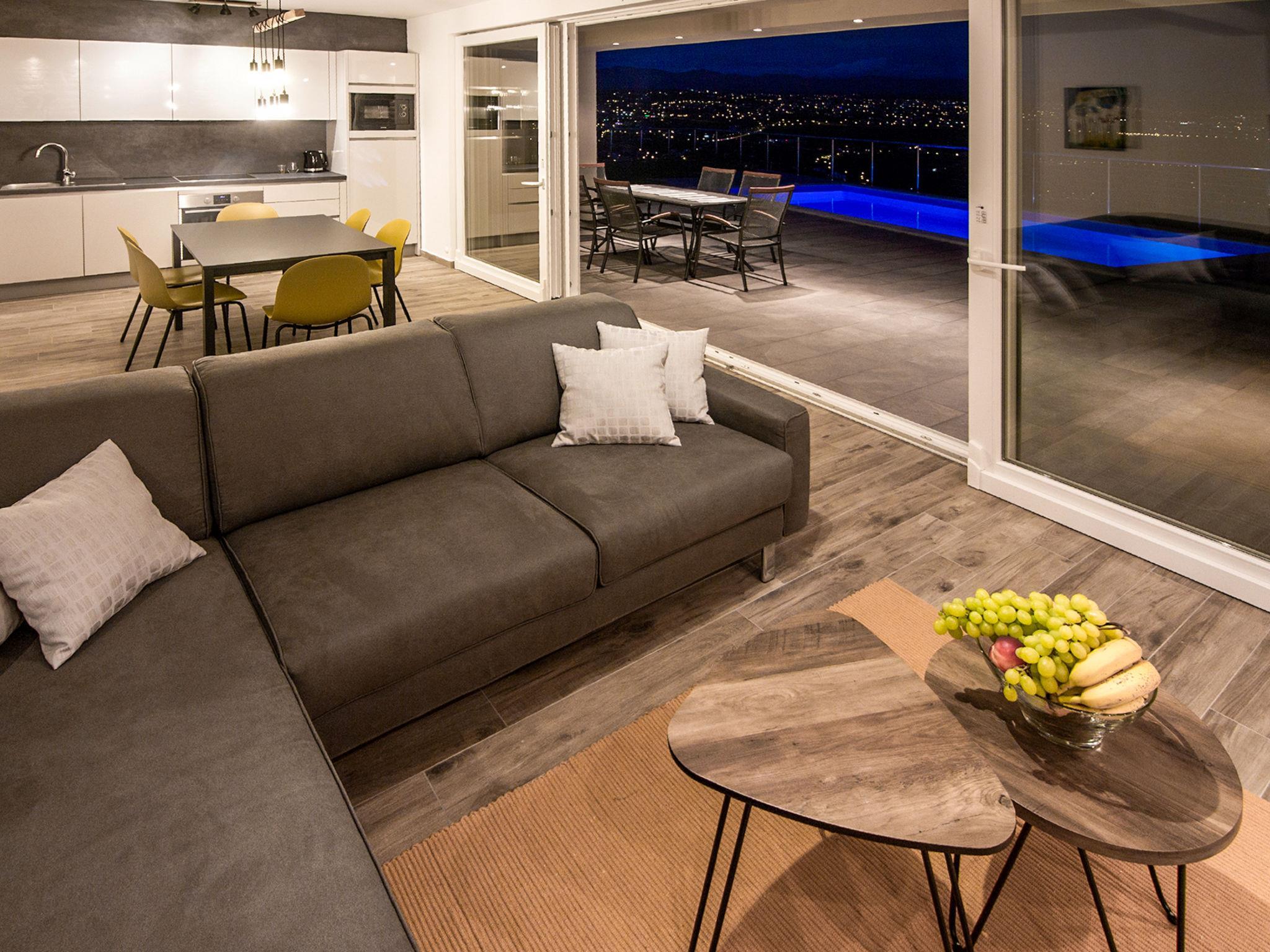 3-Zimmer-Villa 110 m2. Wohn-/Esszimmer mit Panoramafenster mit Kabel-TV und Klimaanlage. Ausgang zur Terrasse, zum Schwimmbad. 2 Zimmer, jedes Zimmer mit 1 Bett (90 cm, Länge 200 cm), 1 franz. Bett (180 cm, Länge 200 cm), Dusche/WC und Klimaanlage. Offene Küche (Backofen, 4 Glaskeramikplatten, Toaster, Wasserkocher, Mikrowelle, elektrische Kaffeemaschine). Ausgang zur Terrasse. Bad/WC. Warmluftheizung. Terrasse 30 m2 teilweise überdacht. Liegestühle. Schöne Panoramasicht auf das Meer und die Landschaft. Zur Verfügung: Safe, Haartrockner. Internet (Wireless LAN, gratis). Bitte beachten: geeignet für Familien. Nichtraucher-Haus.