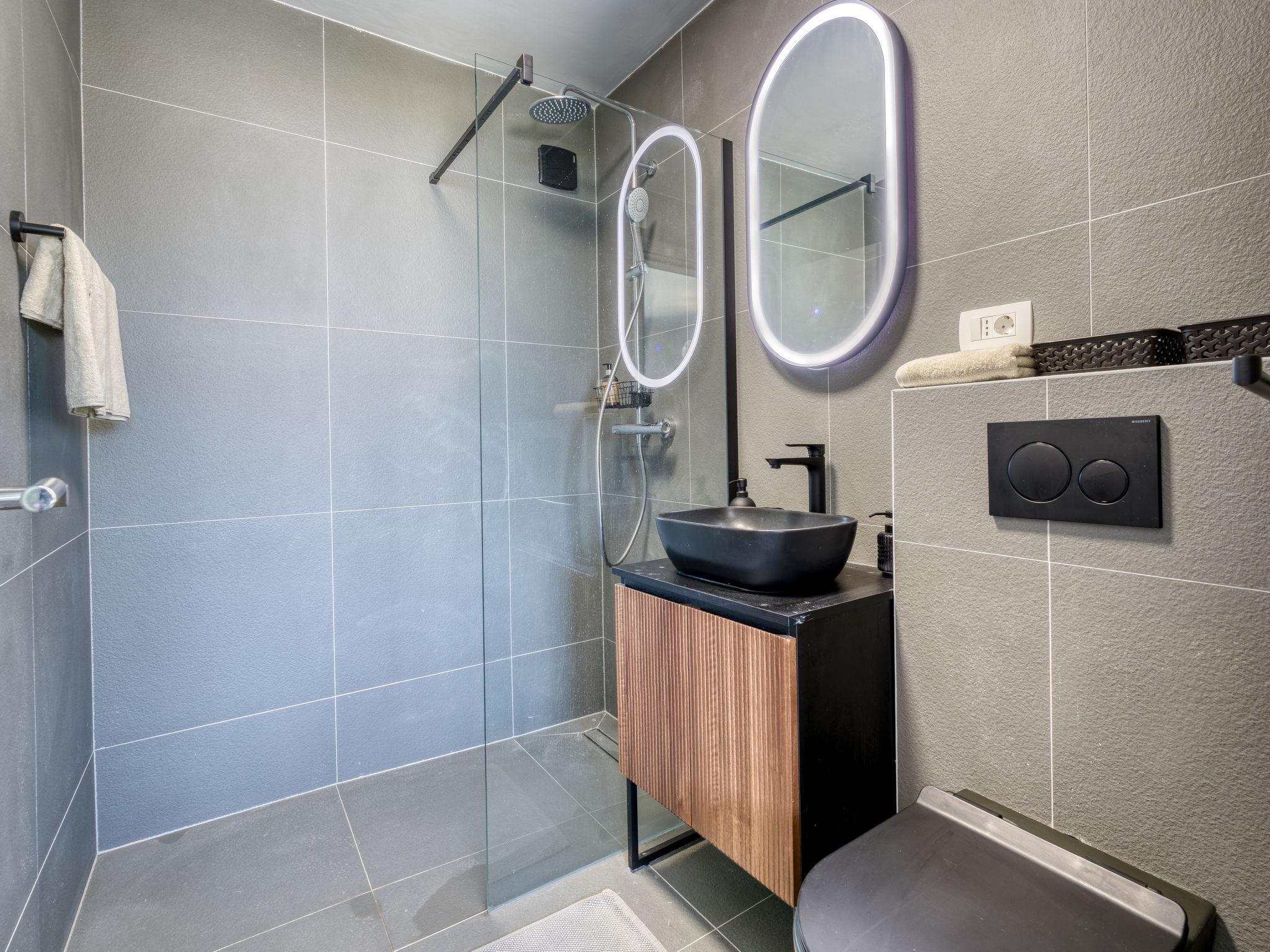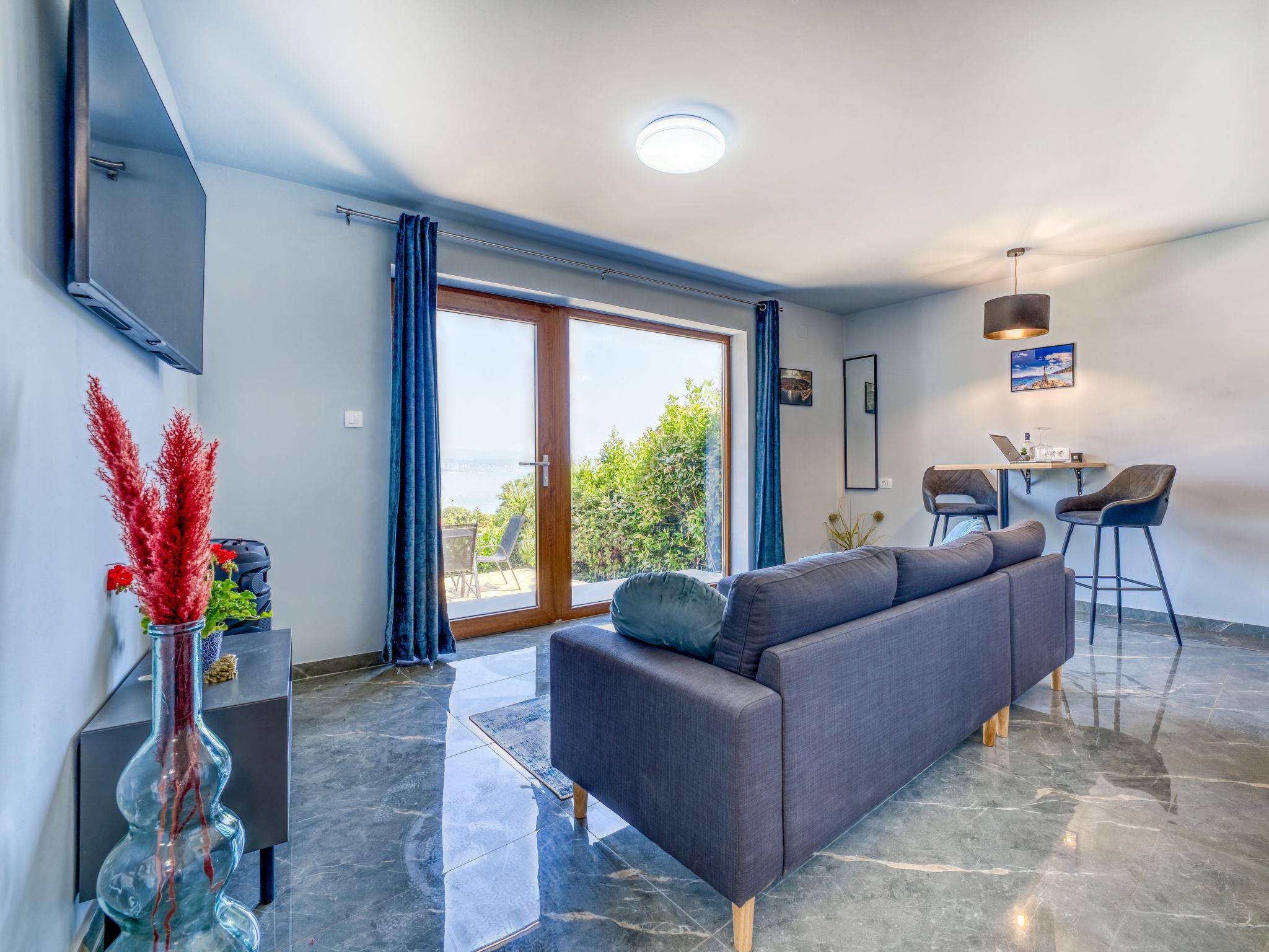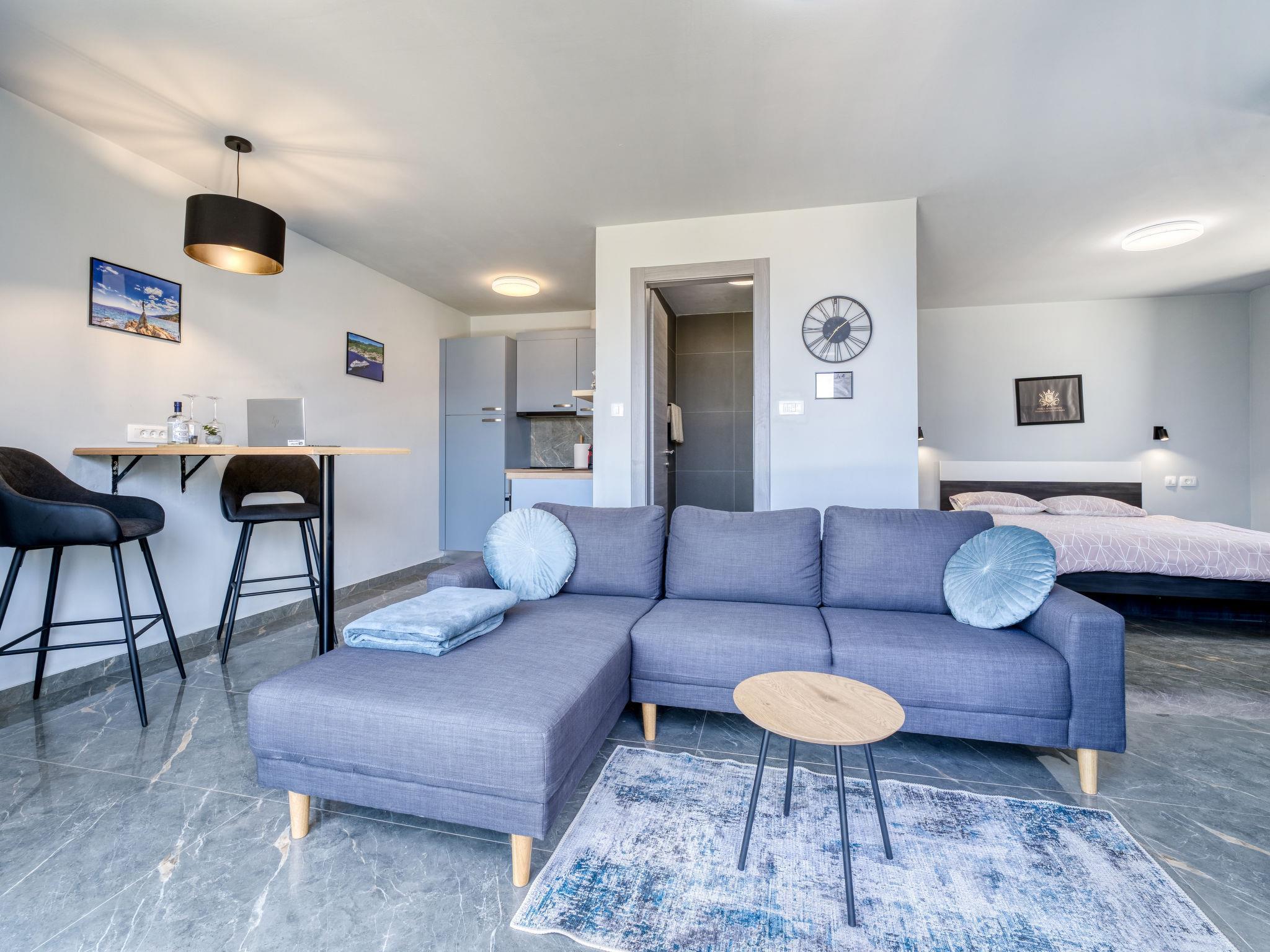 1-Zimmer-Wohnung 35 m2, im Erdgeschoss. Modern eingerichtet: Studio, ohne Schrank mit 1 franz. Bett (180 cm, Länge 200 cm), Esstisch und Sat-TV (Flachbildschirm), Klimaanlage. Ausgang zur Terrasse. Offene Küche (Backofen, 2 Induktionskochplatten, Toaster, Wasserkocher, Tiefkühler, elektrische Kaffeemaschine). Dusche/WC. Warmluftheizung. Terrasse 10 m2. Terrassenmöbel, Liegestühle. Schöne Sicht auf das Meer. Zur Verfügung: Internet (WLAN, gratis). Bitte beachten: Nichtraucher-Haus. Maximal 1 kleines Haustier/Hund erlaubt.