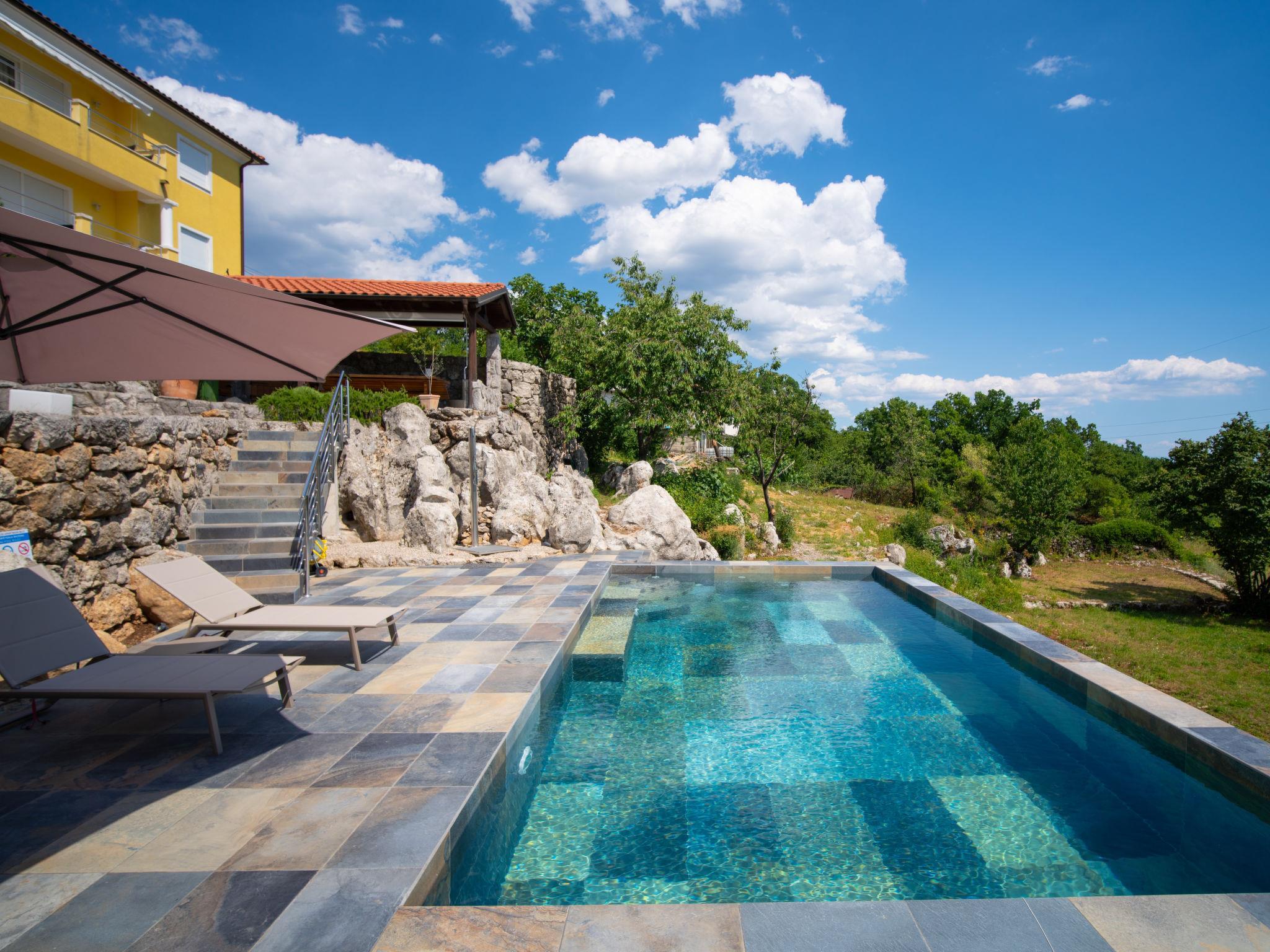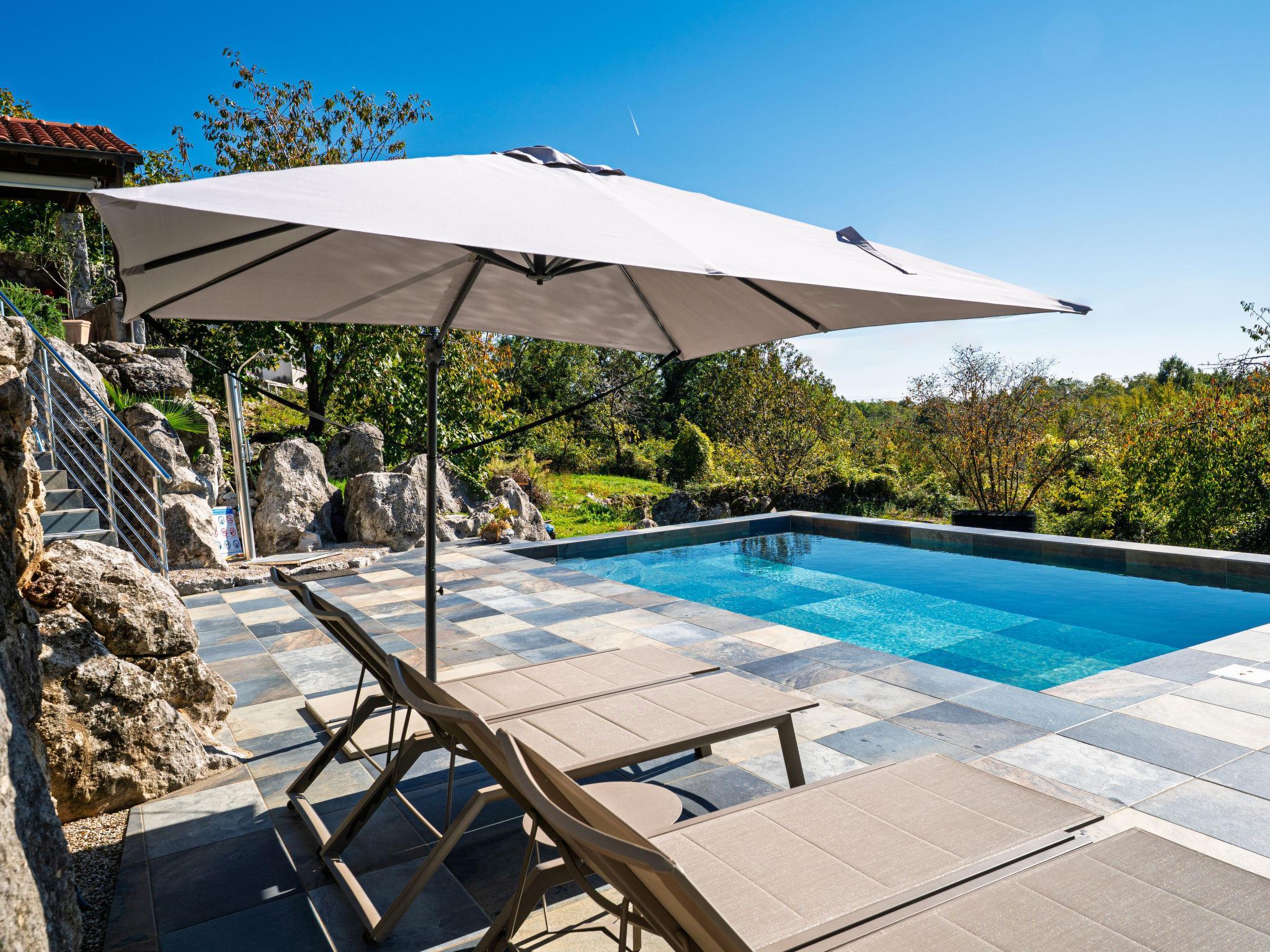 Kastav 7 km von Opatija: Dreifamilienhaus "Kvarner house". 850 m vom Zentrum von Kastav, 9.5 km vom Zentrum von Rijeka, ruhige, sonnige, erhöhte Lage, 5.5 km vom Meer. Zur Mitbenutzung: Grundstück 2'000 m2 mit Rasen und Pflanzen, Schwimmbad eckig (7 x 4 m, 150 cm tief, saisonale Verfügbarkeit: 01.Mai. - 01.Okt.) mit Innentreppe und Salzelektrolyse-Reinigungssystem. Aussendusche, Sprudelbad, Terrasse (30 m2), Gartenmöbel, Grill. Im Hause: Internetzugang. Parkplatz beim Haus auf dem Grundstück. Einkaufsgeschäft, Supermarkt 650 m, Restaurant 850 m, Bushaltestelle 500 m, Kieselstrand 5.5 km, betonierter Strand 5.5 km.