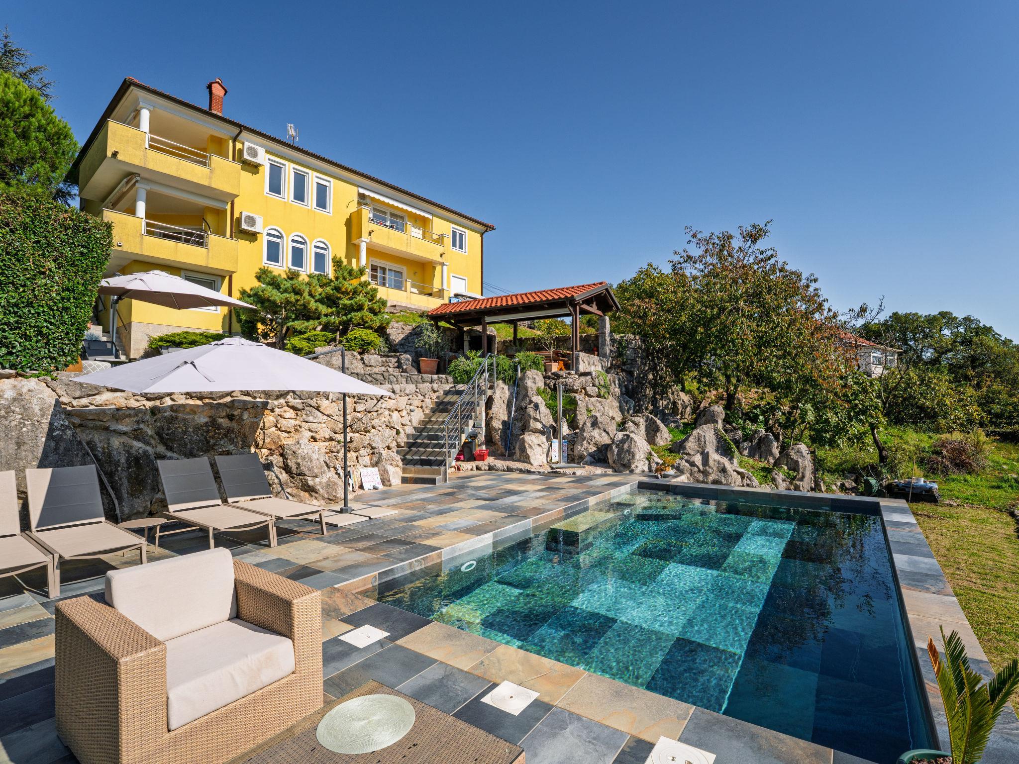 Kastav 7 km von Opatija: Dreifamilienhaus "Kvarner house". 850 m vom Zentrum von Kastav, 9.5 km vom Zentrum von Rijeka, ruhige, sonnige, erhöhte Lage, 5.5 km vom Meer. Zur Mitbenutzung: Grundstück 2'000 m2 mit Rasen und Pflanzen, Schwimmbad eckig (7 x 4 m, 150 cm tief, saisonale Verfügbarkeit: 01.Mai. - 01.Okt.) mit Innentreppe und Salzelektrolyse-Reinigungssystem. Aussendusche, Sprudelbad, Terrasse (30 m2), Gartenmöbel, Grill. Im Hause: Internetzugang. Parkplatz beim Haus auf dem Grundstück. Einkaufsgeschäft, Supermarkt 650 m, Restaurant 850 m, Bushaltestelle 500 m, Kieselstrand 5.5 km, betonierter Strand 5.5 km.