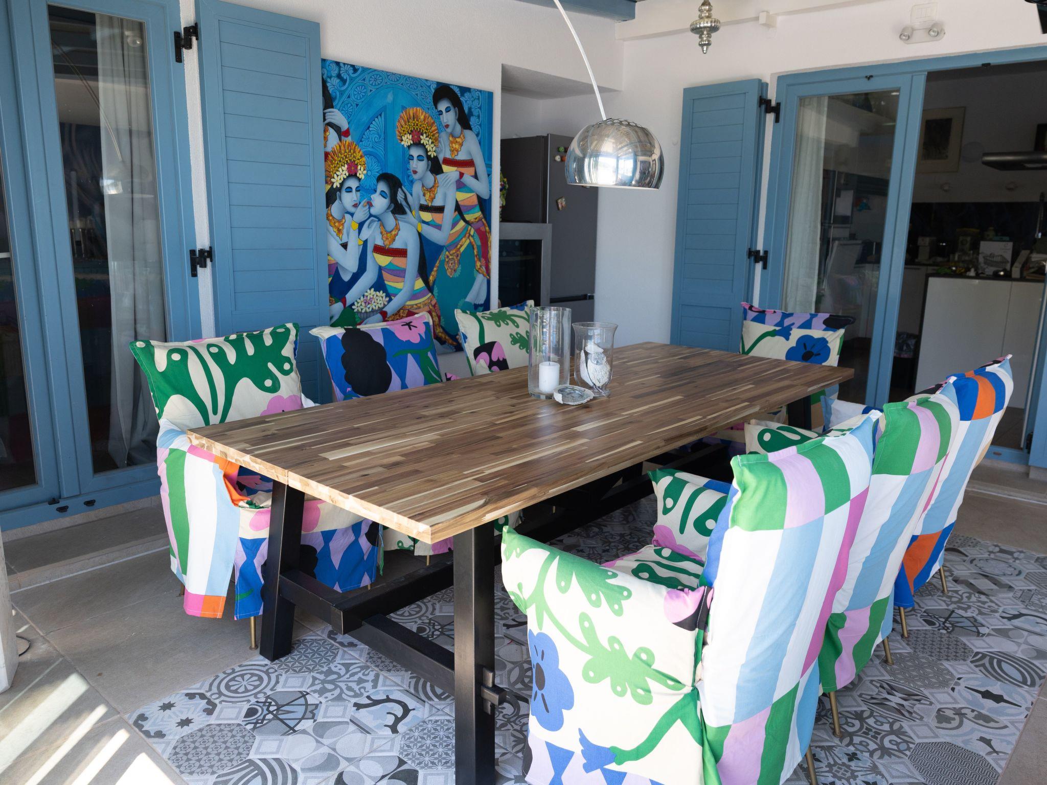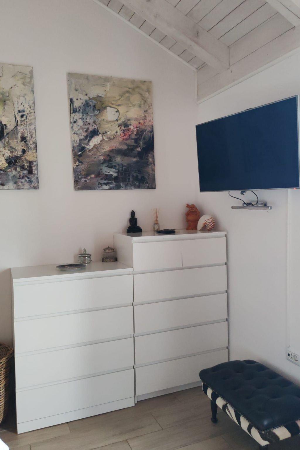 Im Inneren wartet das Haus mit einer durchdachten Ausstattung auf, die einen angenehmen Aufenthalt für alle verspricht. Die Klimaanlage sorgt überall für angenehme Temperaturen, während die Fußbodenheizung an kühleren Tagen für Wärme sorgt. Die Abende können gemütlich vor dem Kamin verbracht oder mit dem Smart-TV für Unterhaltung genutzt werden. Eine voll ausgestattete Küche mit Cerankochfeld, Kapsel-Kaffeemaschine, Spülmaschine und Wasserkocher unterstützt bei der Zubereitung von Mahlzeiten für die Familie oder Freunde.