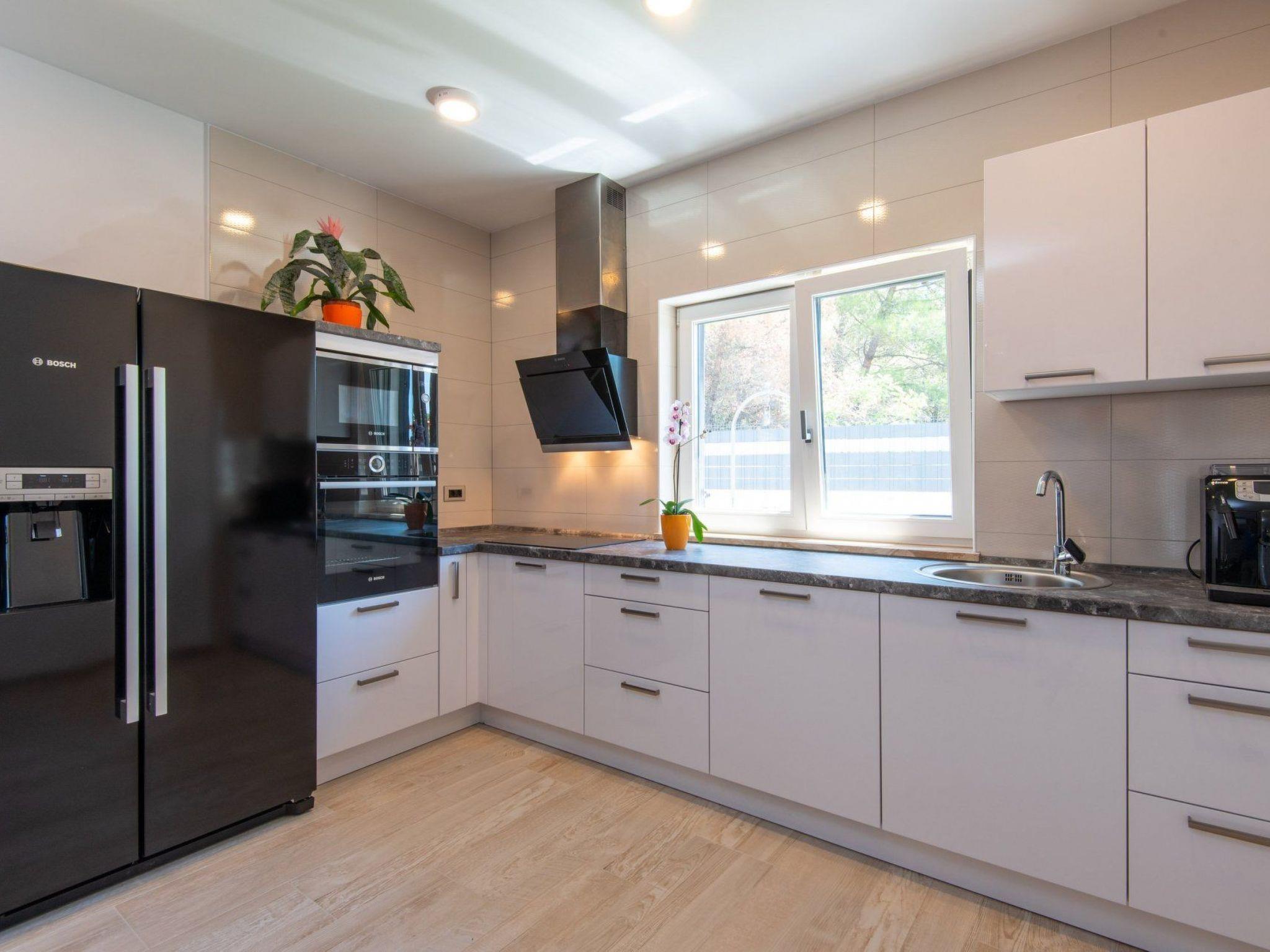 Im Erdgeschoss finden Sie das Wohnzimmer mit einem großen Sofa und Blick auf den Pool. Es ist mit einer voll ausgestatteten Küche und dem Esszimmer verbunden. Darüber hinaus gibt es im Erdgeschoss auch ein Schlafzimmer mit eigenem Bad.