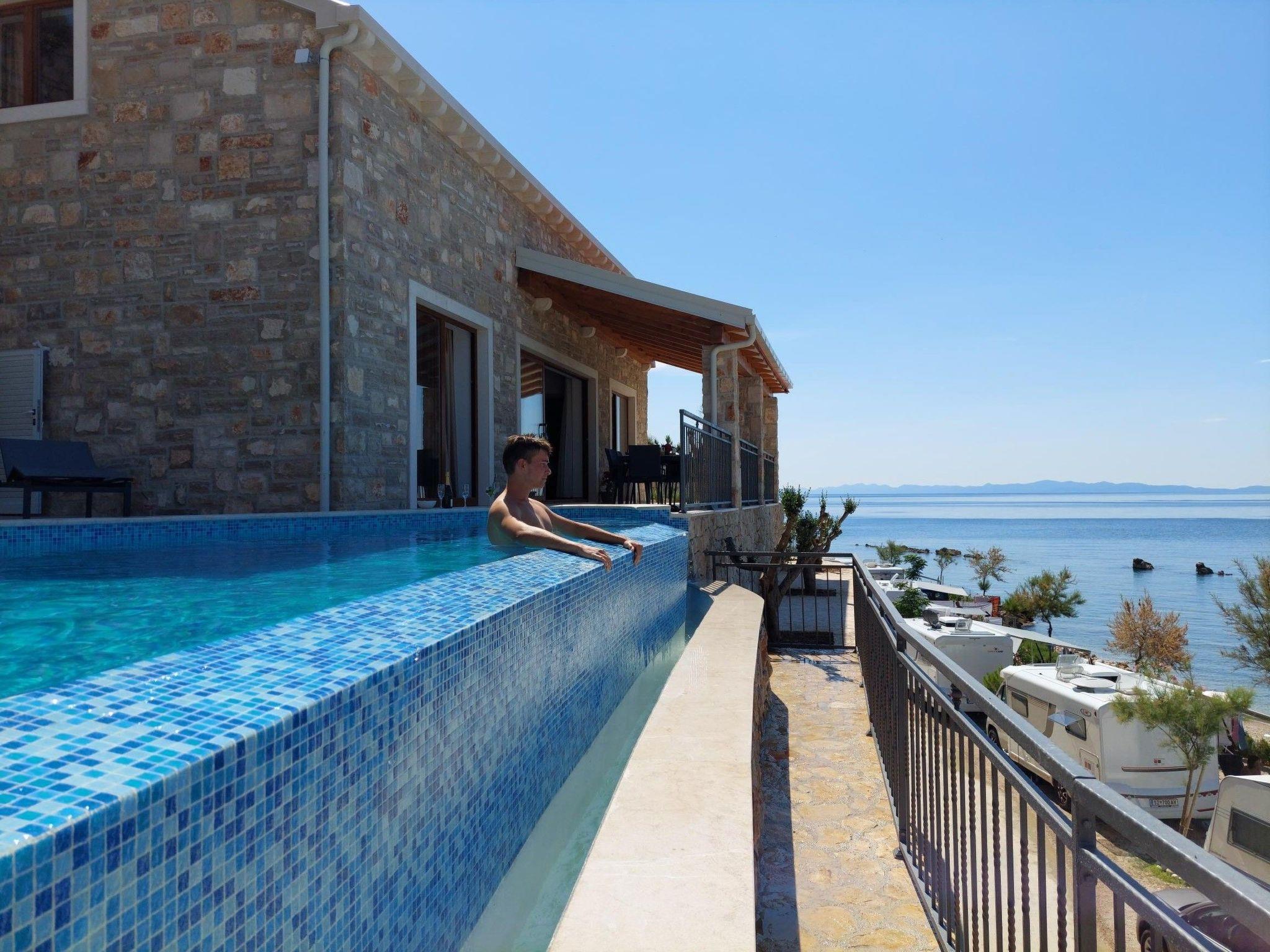 Auf der Terrasse der Villa, die komplett von einer Steinmauer umgeben und mit Gartenmöbeln und Liegestühlen ausgestattet ist, gibt es einen schönen Infinity-Pool (3x8m, im Winter nicht beheizt!) und einen Whirlpool (2x2m), in dem Sie sich zu jeder Tages- und Nachtzeit erfrischen können, während Sie den Blick auf die bezaubernden umliegenden Inseln genießen. Entspannen Sie sich bei der Zubereitung von Mahlzeiten auf dem Außengrill und genießen Sie laue Sommerabende mit einem Glas dalmatinischen Spitzenweins.