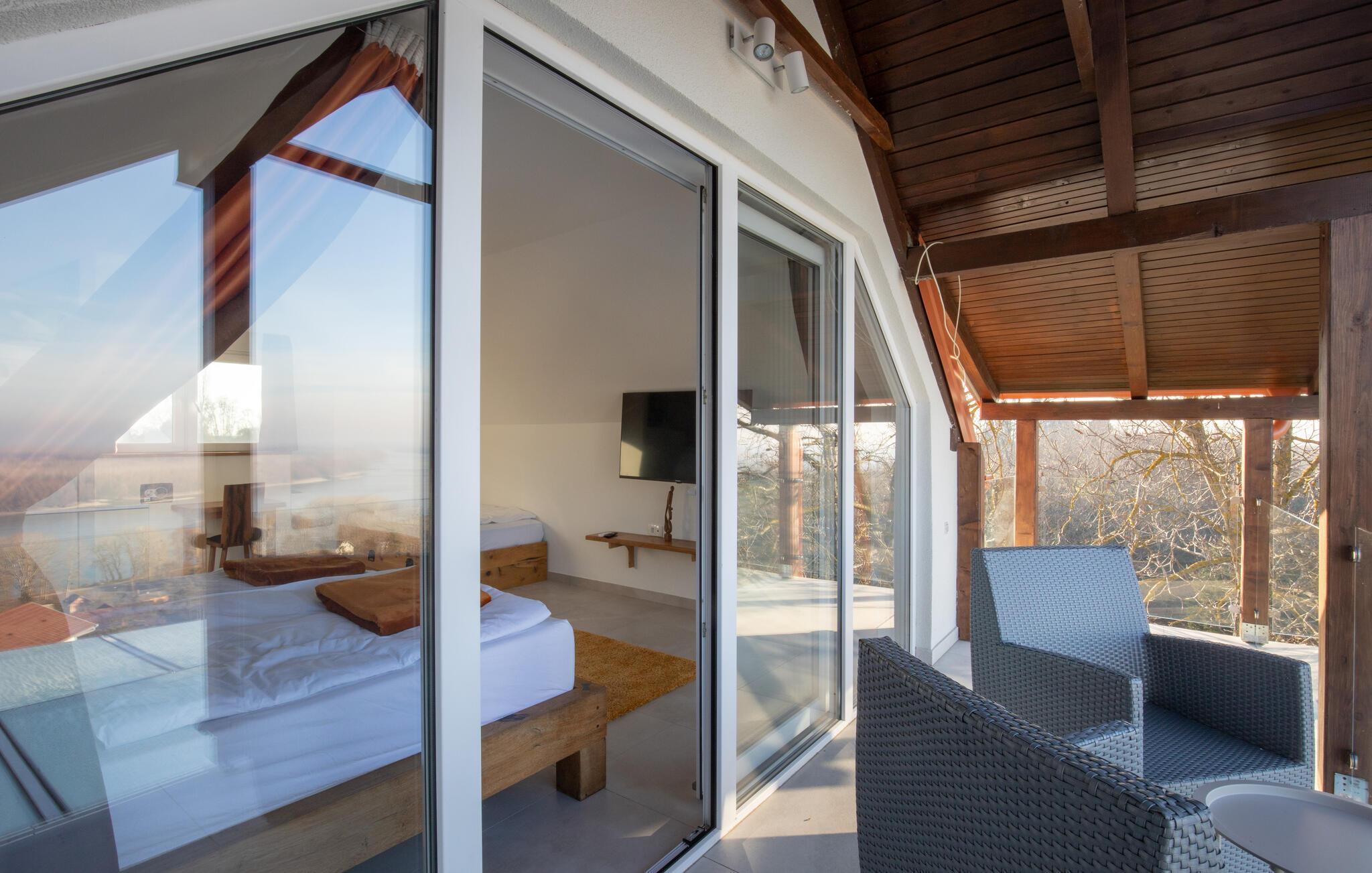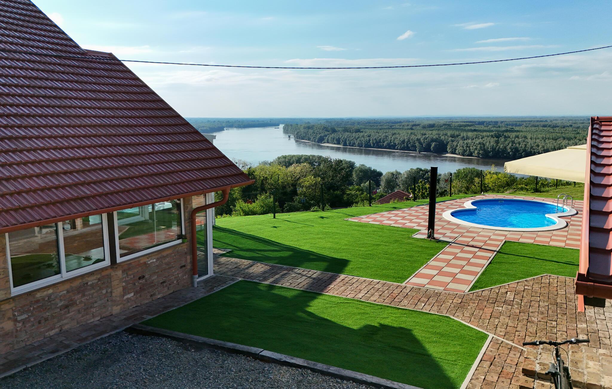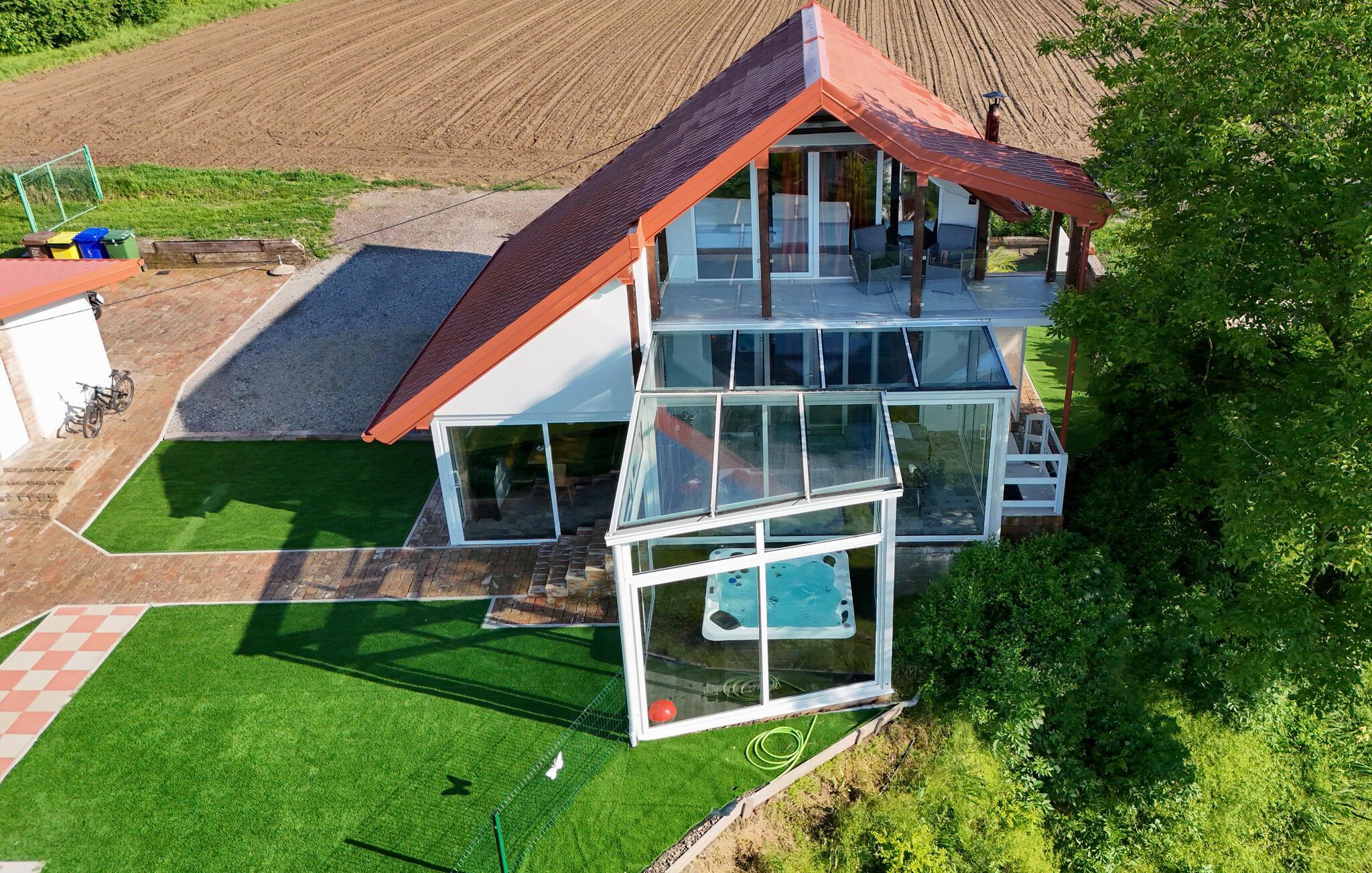 Eingebettet in die idyllische Landschaft bei Aljmaš bietet dieses Haus einen einzigartigen Rückzugsort für Naturliebhaber, die auf moderne Annehmlichkeiten und eine gemütliche Atmosphäre nicht verzichten möchten. Entspannen Sie auf der großzügigen Couch bei einem Filmabend, widmen Sie sich einem Gesellschaftsspiel oder gönnen Sie sich wohlige Momente in der hauseigenen Sauna. Der verglaste Wintergarten bietet Ihnen einen behaglichen Rückzugsort mit wunderschönem Blick auf die Landschaft.