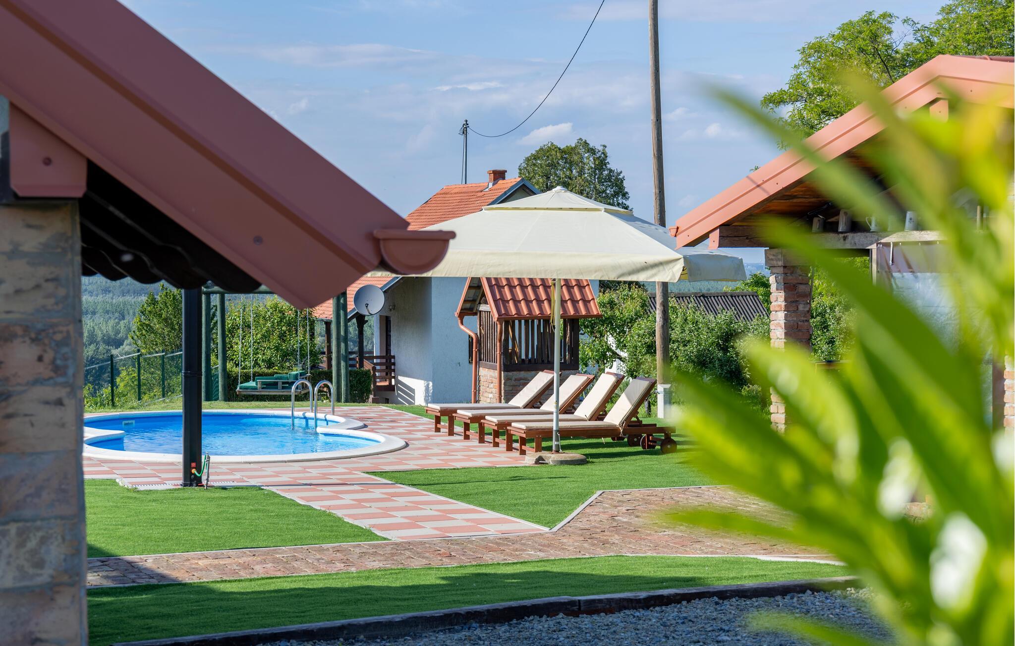Verbringen Sie einen erholsamen Urlaub in diesem komfortablen Ferienhaus mit Pool, Sauna und Panoramablick.
