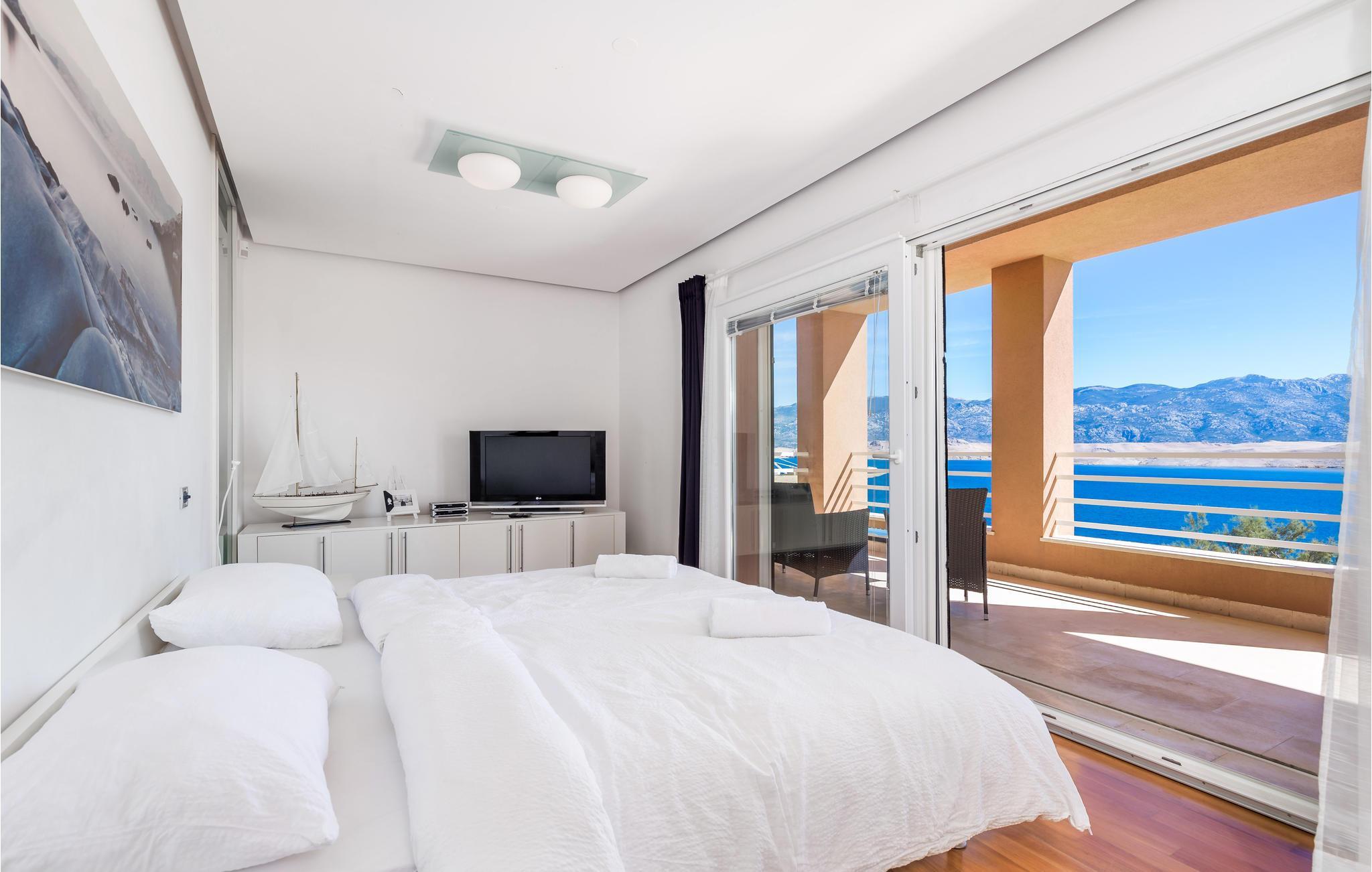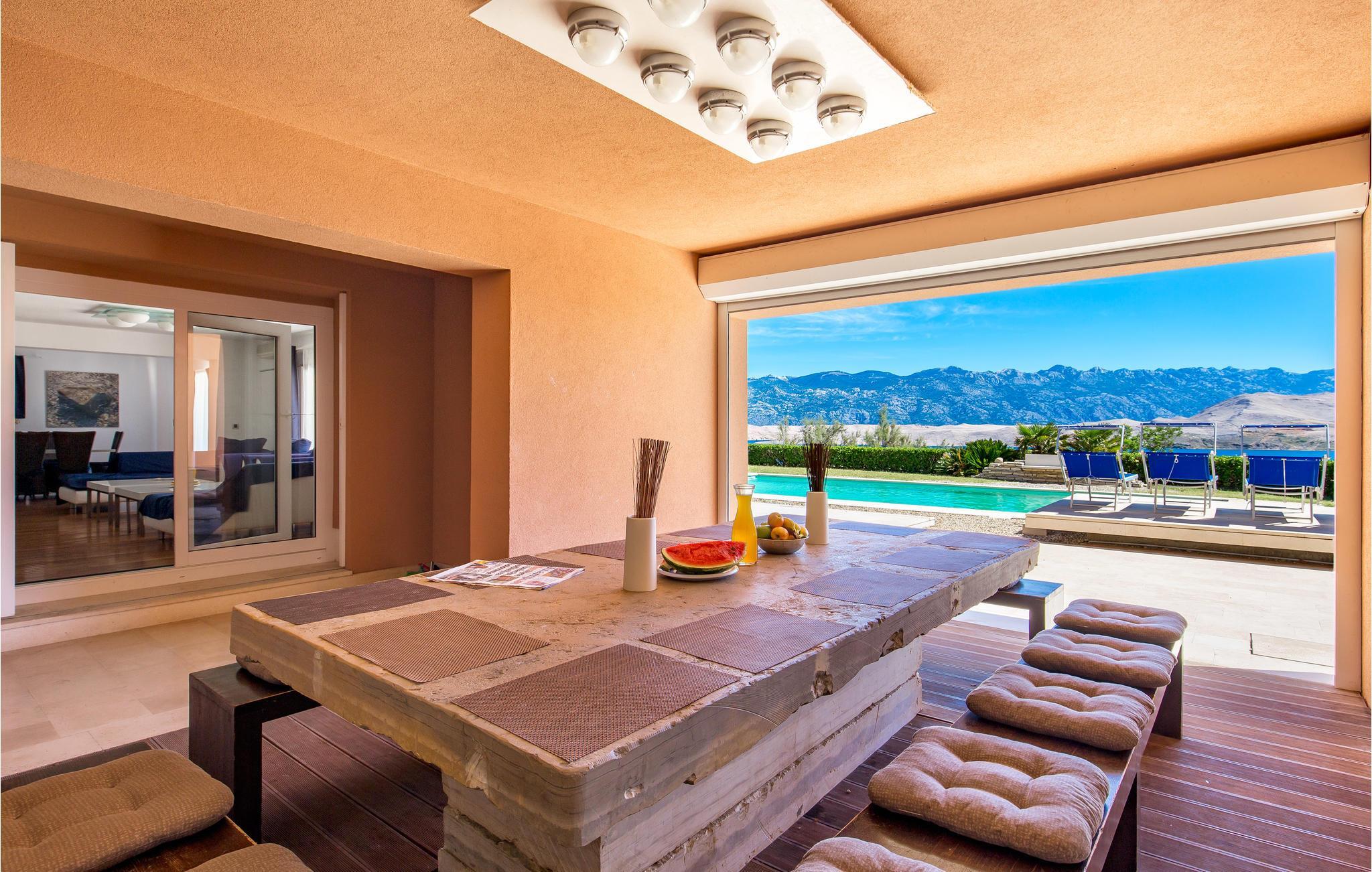 Gönnen Sie sich einen luxuriösen Urlaub, und verbringen Sie die schönsten Tage des Jahres in diesem Traumhaus in ruhiger Lage. Schon im Erdgeschoss werden Sie von behaglichen und stilvoll eingerichteten Räumen empfangen. Hier liegen der große Wohnraum mit der sehr gut ausgestatteten Küche und Essecke sowie ein Badezimmer. Im zentralen Bereich des Erdgeschosses befindet sich eine große, überdachte Terrasse, ein Badezimmer und ein weiterer, kleinerer Wohnraum. Von beiden Wohnzimmern haben Sie einen großartigen Blick aufs Meer, und hier sind Sie nur durch Schiebetüren von der Poolterrasse getrennt. Im ersten Stock sind Schlafzimmer und zwei weitere Badezimmer. Zu den Schlafräumen 2, 3 und 4 gehören überdachte Terrassen. Im 2. Stock liegt das Schlafzimmer 5, dessen eine Wand eine Glasfassade ist und daher einen fabelhaften Blick auf die Stadt Pag und den Velebit Kanal bietet. Um den Pool herum gibt es Terrassen, auf denen Sie ein Sonnenbad nehmen können. Wenn es Ihnen dann zu warm wird, genießen Sie im Schatten des Pavillons einen kühlen Drink und den Blick auf das Velebit Gebirgsmassiv. In den Abendstunden wird der Pool beleuchtet und schafft eine romantische Atmosphäre. Die Kinder können sorglos auf dem umzäunten Grundstück spielen. Der Strand unterhalb des Hauses ist ein Steinstrand. In wenigen Fußminuten erreichen Sie aber einen schönen Kiesstrand. Die Stadt Pag liegt nur ca. 3 km entfernt. Hier werden Ihnen Bootsausflüge und Taucherkurse angeboten. Besuchen Sie die einheimischen Restaurants, und lassen Sie sich auf keinen Fall das Lammfleisch und den würzigen Pager Käse entgehen. Dachschrägen mit Mindesthöhe 1.20 m.