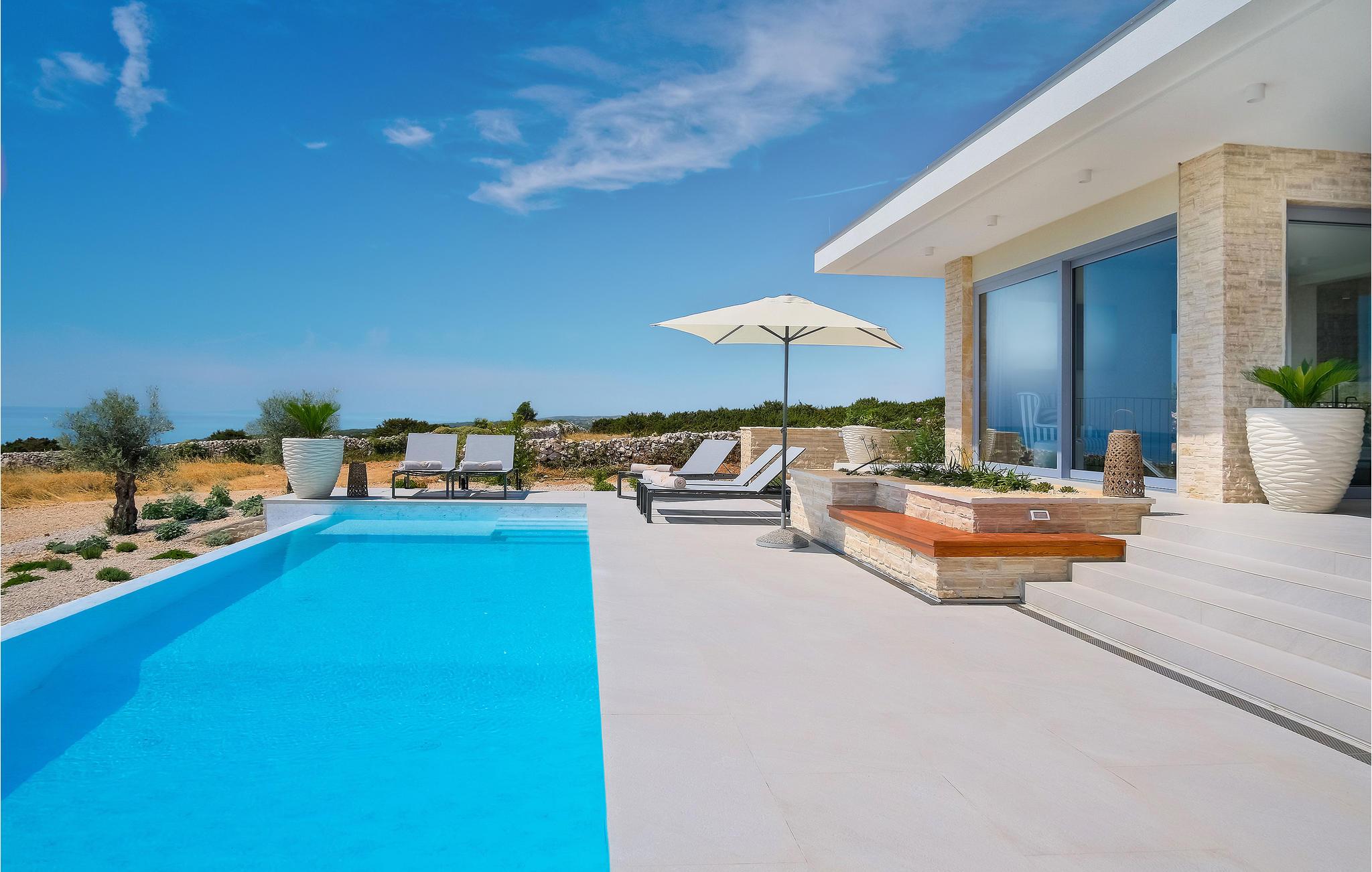 Auf der Insel Pag begrüßt Sie dieses großartige Haus in traumhafter Lage. Im Innenraum erwarten Sie hochwertig eingerichtete Zimmer, die einen sehr stilvollen Eindruck machen. Überall besticht das Haus durch bedachte Lösungen und Materialien von hoher Qualität. Bereiten Sie in der ansprechenden Küche Ihre Köstlichkeiten beim Blick auf die Umgebung zu oder entspannen Sie im Sofa bei der Urlaubslektüre, von wo aus Sie eine schöne Aussicht auf die Umgebung genießen und nur wenige Schritte Sie von einem Sprung in den Außenpool trennen. Der Aktivitätsraum lädt zu einer Runde Billard ein, und wenn Sie lieber zusehen möchten, können Sie sich es im Sofa bei einem abgekühlten Getränk Ihrer Wahl bequem machen.