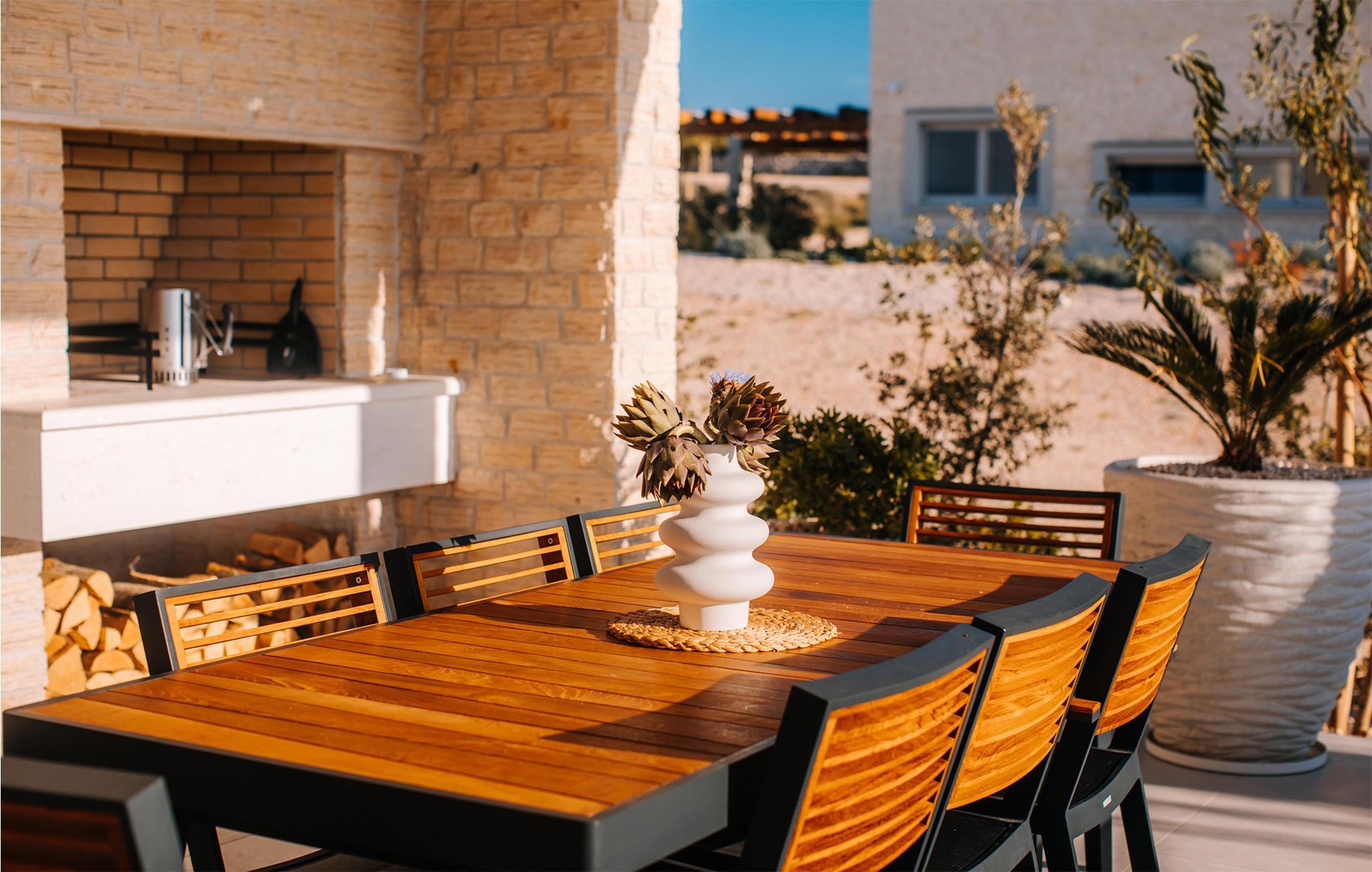 Nicht nur der Innenraum, sondern auch der Außenbereich macht einen überzeugenden Eindruck. Schwimmen Sie morgens eine Runde im Pool und verbringen Sie tagsüber entspannte Stunden in den Loungemöbeln oder auf den Sonnenliegen unter dem Parasol. Profitieren Sie von der hübschen Außenküche und verbringen Sie viele, gesellige Stunden im Essbereich mit dem Meer als Kulisse. Zu einem stimmungsvollen Ausklang des Tages bietet der Außenwhirlpool den perfekten Ort.