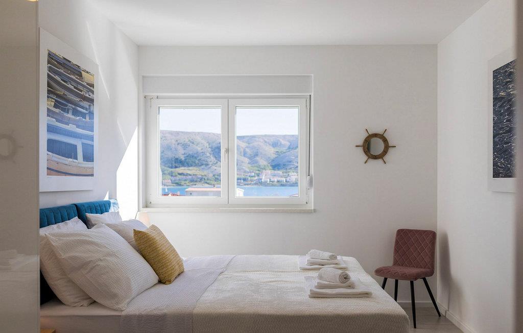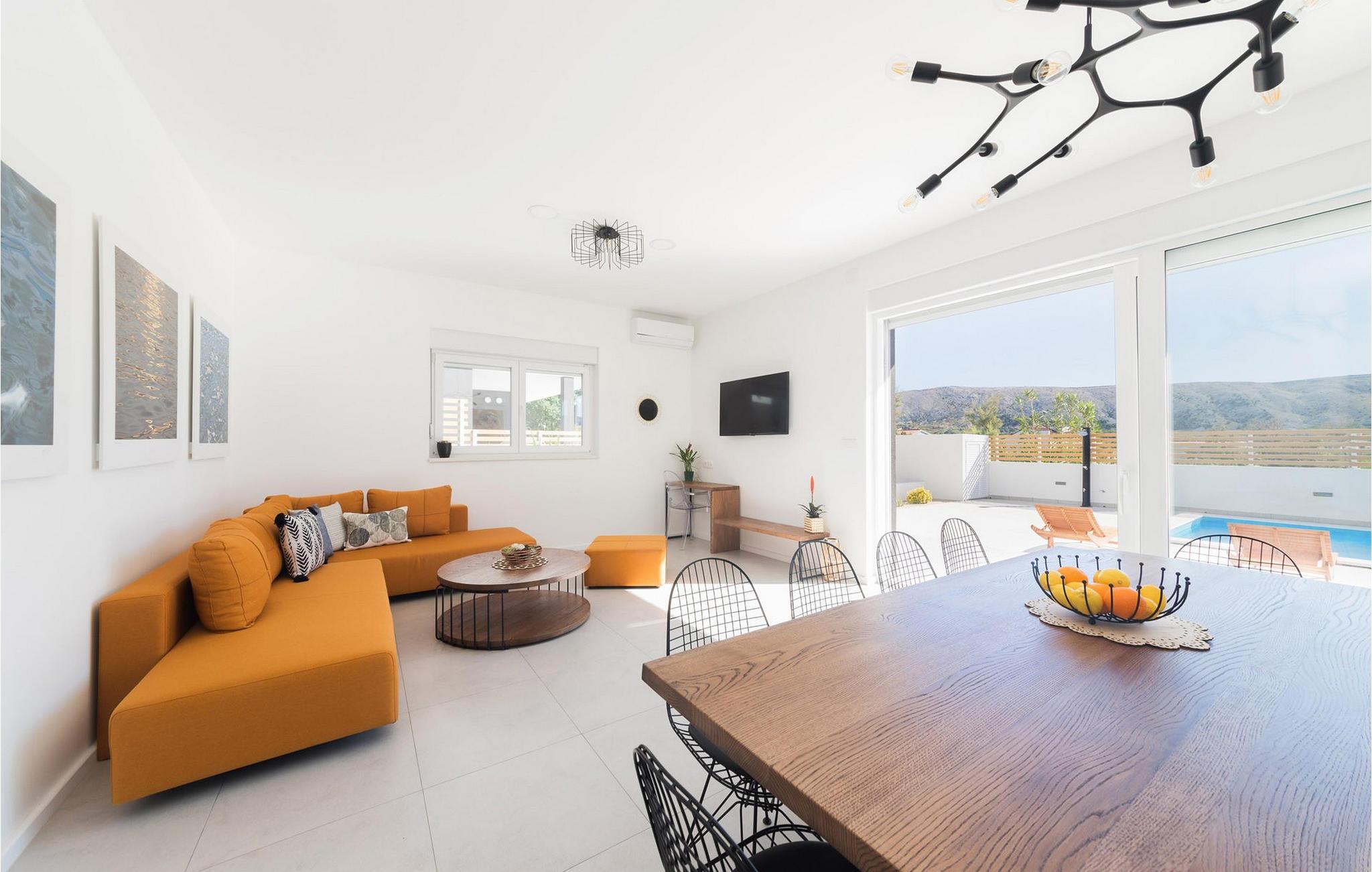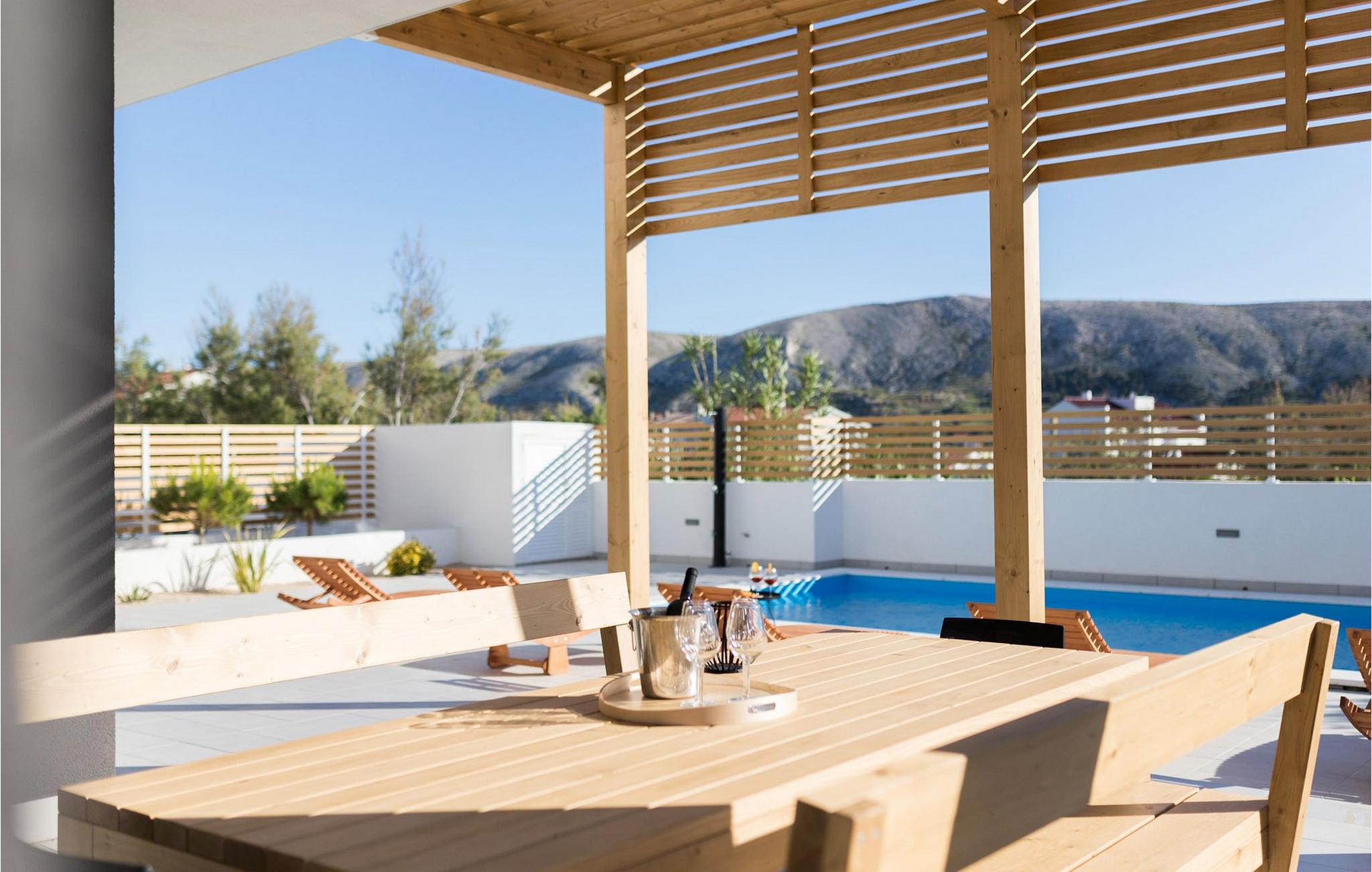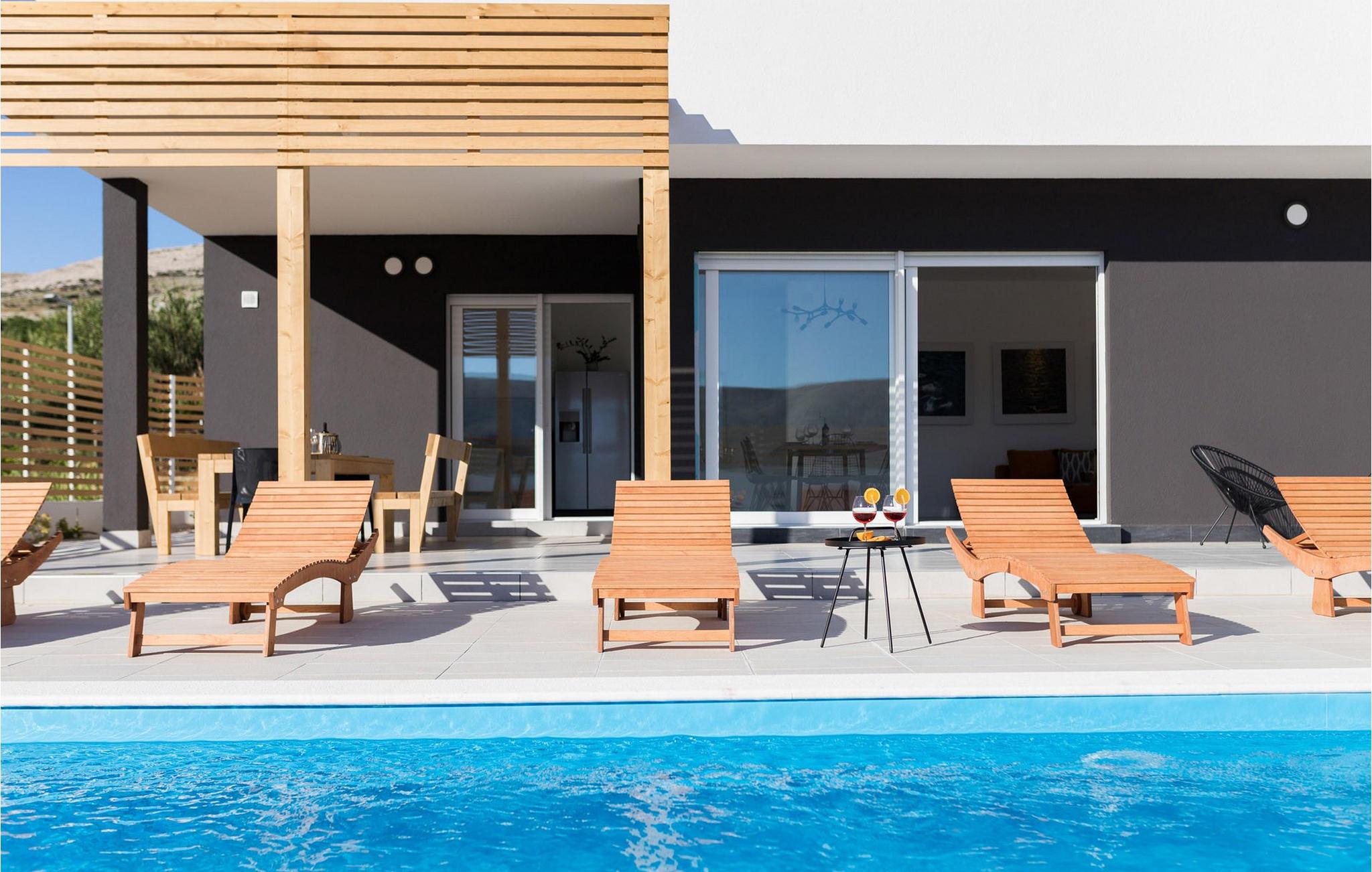 In der Stadt Pag auf der gleichnamigen Insel befindet sich die luxuriöse moderne Villa Venus mit wunderschönem Meerblick. Diese wunderschöne, neu erbaute Villa mit 200 m2 luxuriös eingerichteter Wohnfläche bietet Platz für acht und maximal zehn Personen und verfügt über vier komfortable Schlafzimmer mit angeschlossenen Badezimmern, eine separate Toilette und einen Raum im Erdgeschoss, der eine voll ausgestattete Küche, ein gemütliches Esszimmer und ein gemütliches Esszimmer beherbergt Wohnzimmer. Das Esszimmer und das Wohnzimmer sind durch eine große Glaswand vom Außenbereich getrennt. Der gesamte Bereich ist komfortabel klimatisiert und es stehen private Parkplätze zur Verfügung. Im wunderschön angelegten Außenbereich stehen Ihnen ein Außengrill und ein von Liegestühlen umgebener Swimmingpool zur Verfügung, der während Ihres Urlaubs in dieser wunderschönen Villa eine echte Entspannungsoase sein wird. Der Strand ist nur 200 Meter von Ihrer Unterkunft entfernt und Sie können zu Fuß Restaurants, Cafés, Supermärkte und viele andere Einrichtungen erreichen, die Ihren Urlaub unvergesslich machen. Die Nähe zum Zrce-Strand, einem weltberühmten Partyziel, macht diese Unterkunft ideal für junge Leute auf der Suche nach Spaß und insbesondere für größere Gästegruppen, da die Schwestervilla Valentina auf dem angrenzenden Grundstück in der Nähe liegt. Diese Villa bietet auch Unterkunft für bis zu zehn Gäste. Lassen Sie Ihren Sommerurlaub zu einer unvergesslichen Zeit auf einer wunderschönen Insel mit einer reichen Geschichte, gastronomischer Kultur und einer unglaublich interessanten Natur werden. Haustiere sind in dieser Unterkunft nach Ermessen des Eigentümers oder gegen eine Gebühr gestattet.