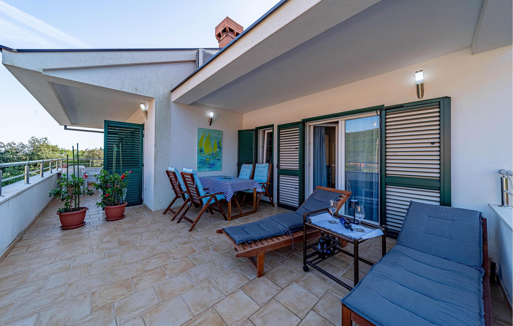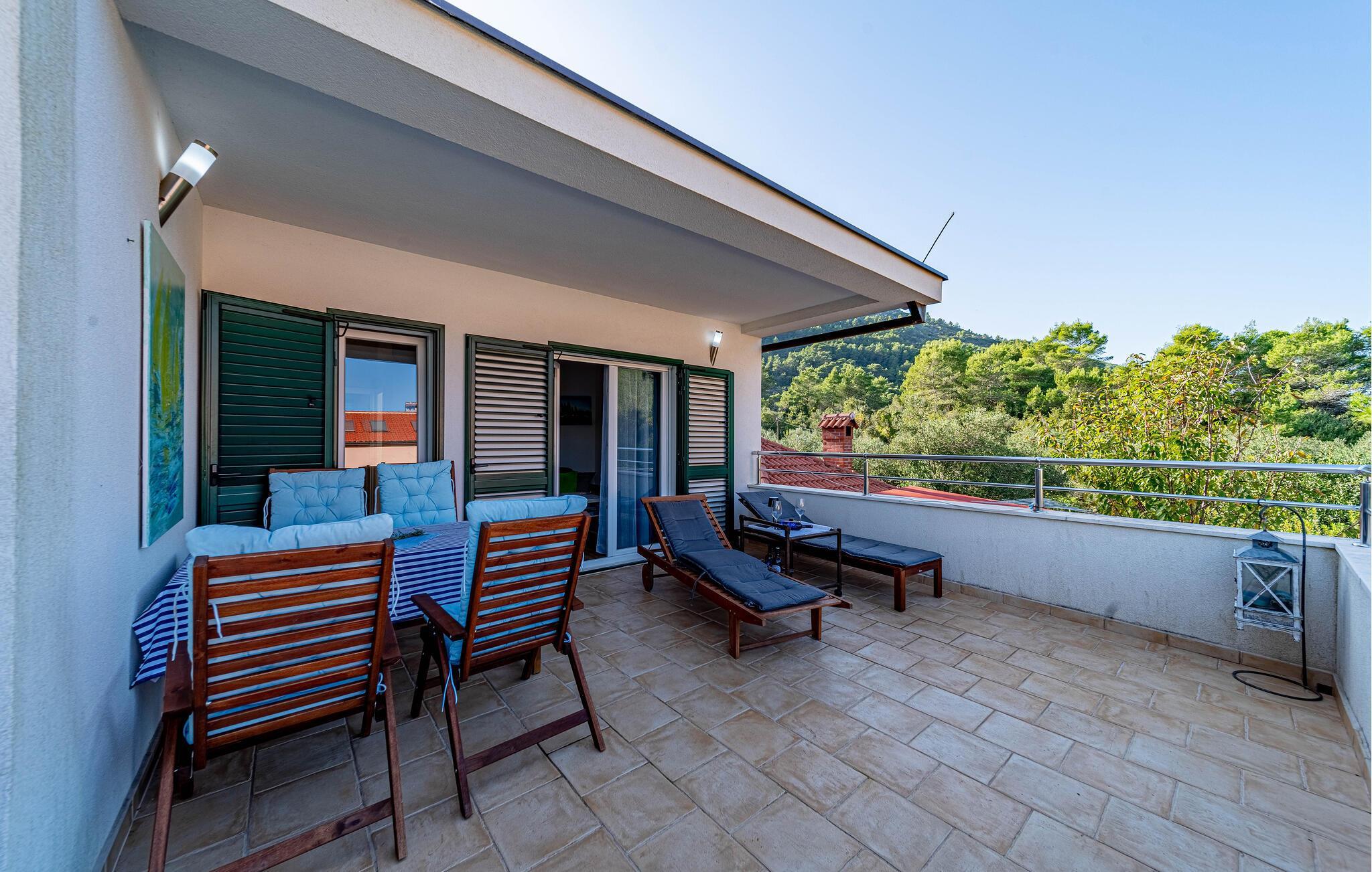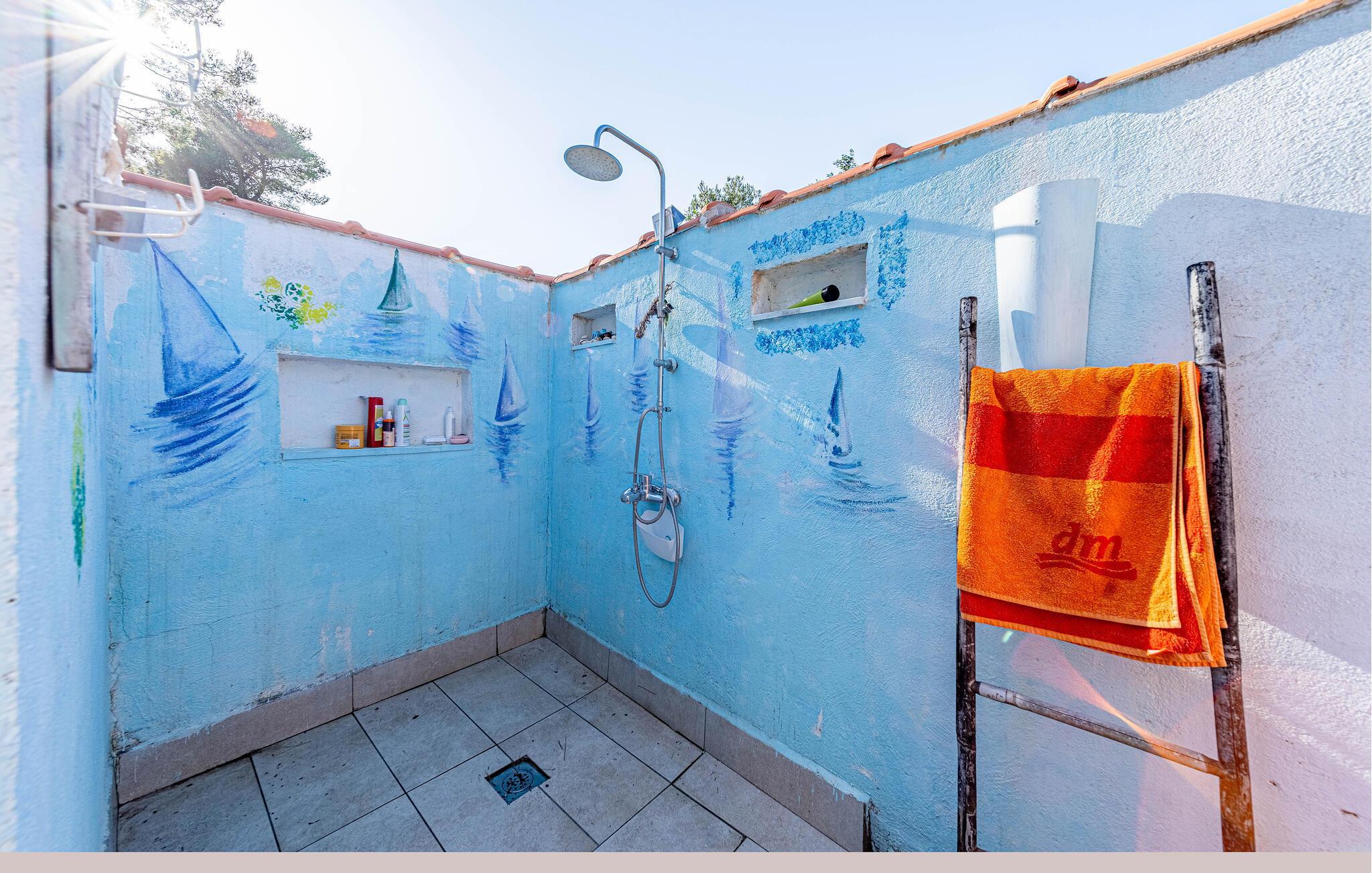 Ihre großzügige Dachterrasse ist ideal für ein Frühstück in der Morgensonne oder ein Glas Wein am Abend. Erfrischen Sie sich in der charmanten Außendusche und genießen Sie entspannte Abende am Grill.