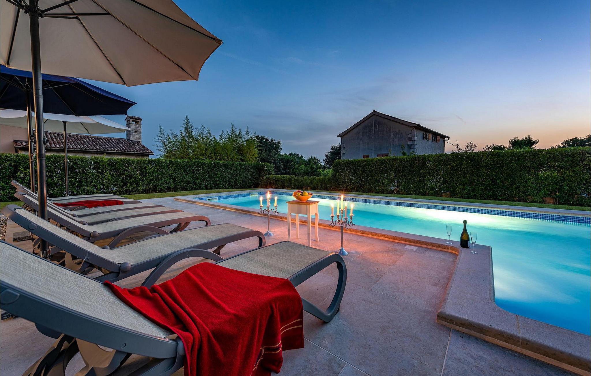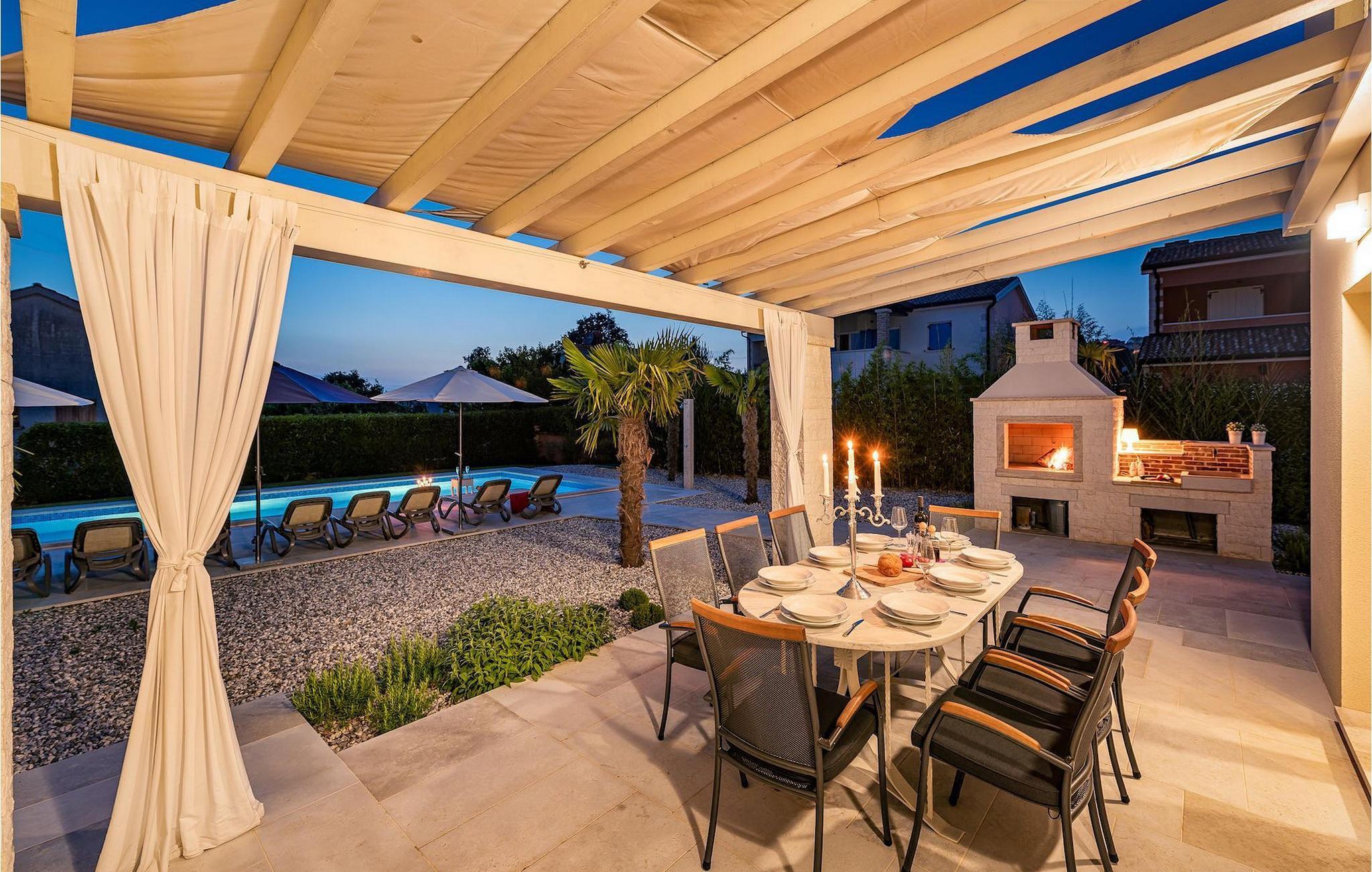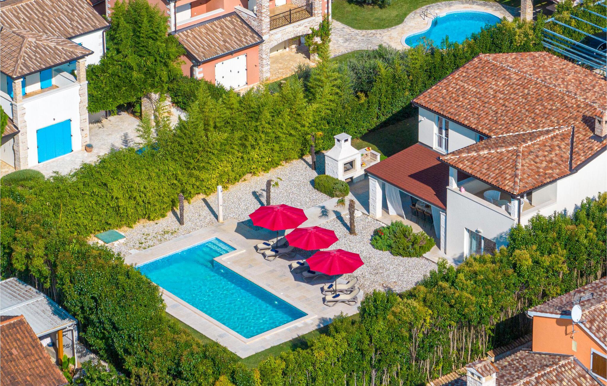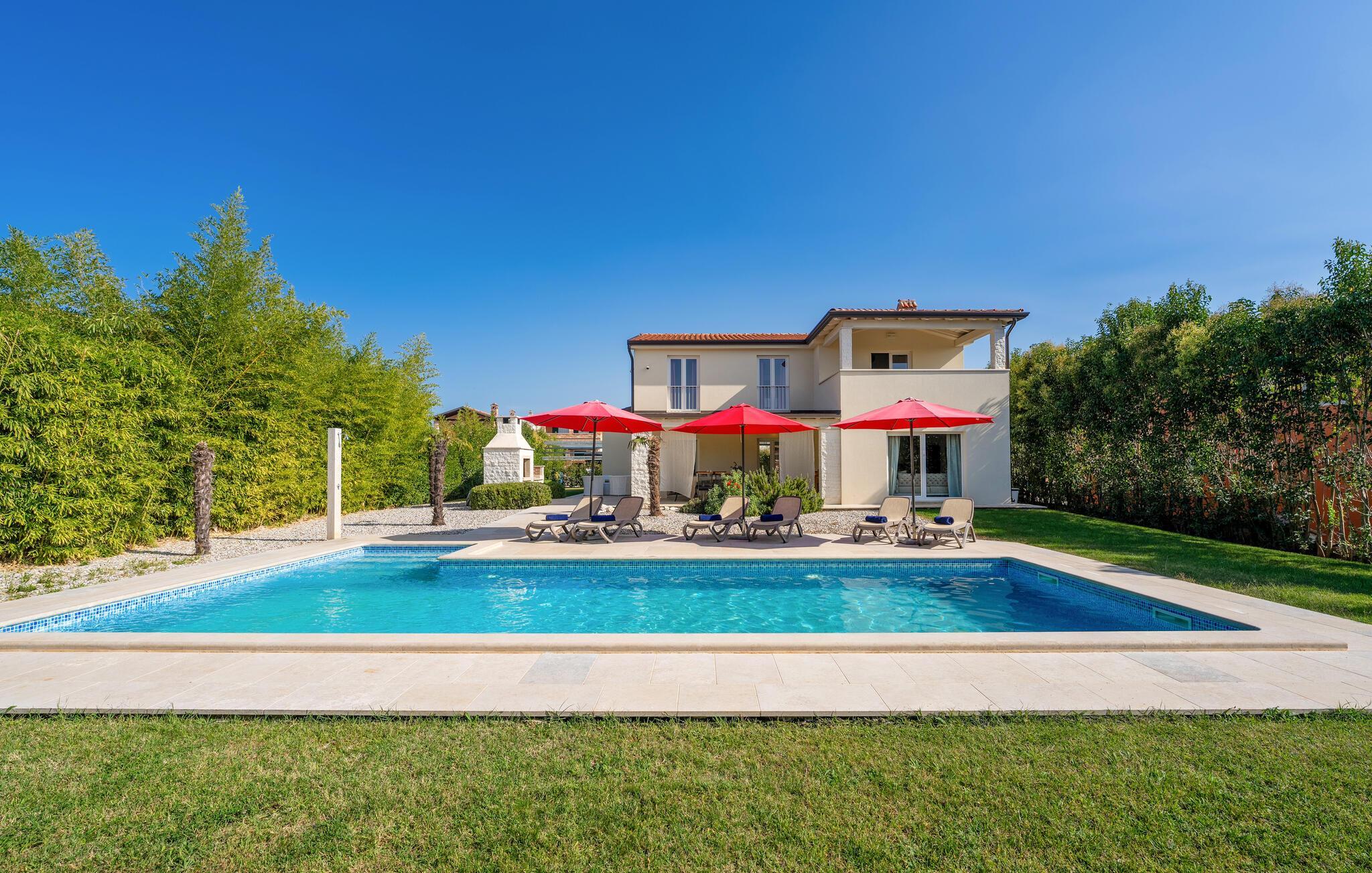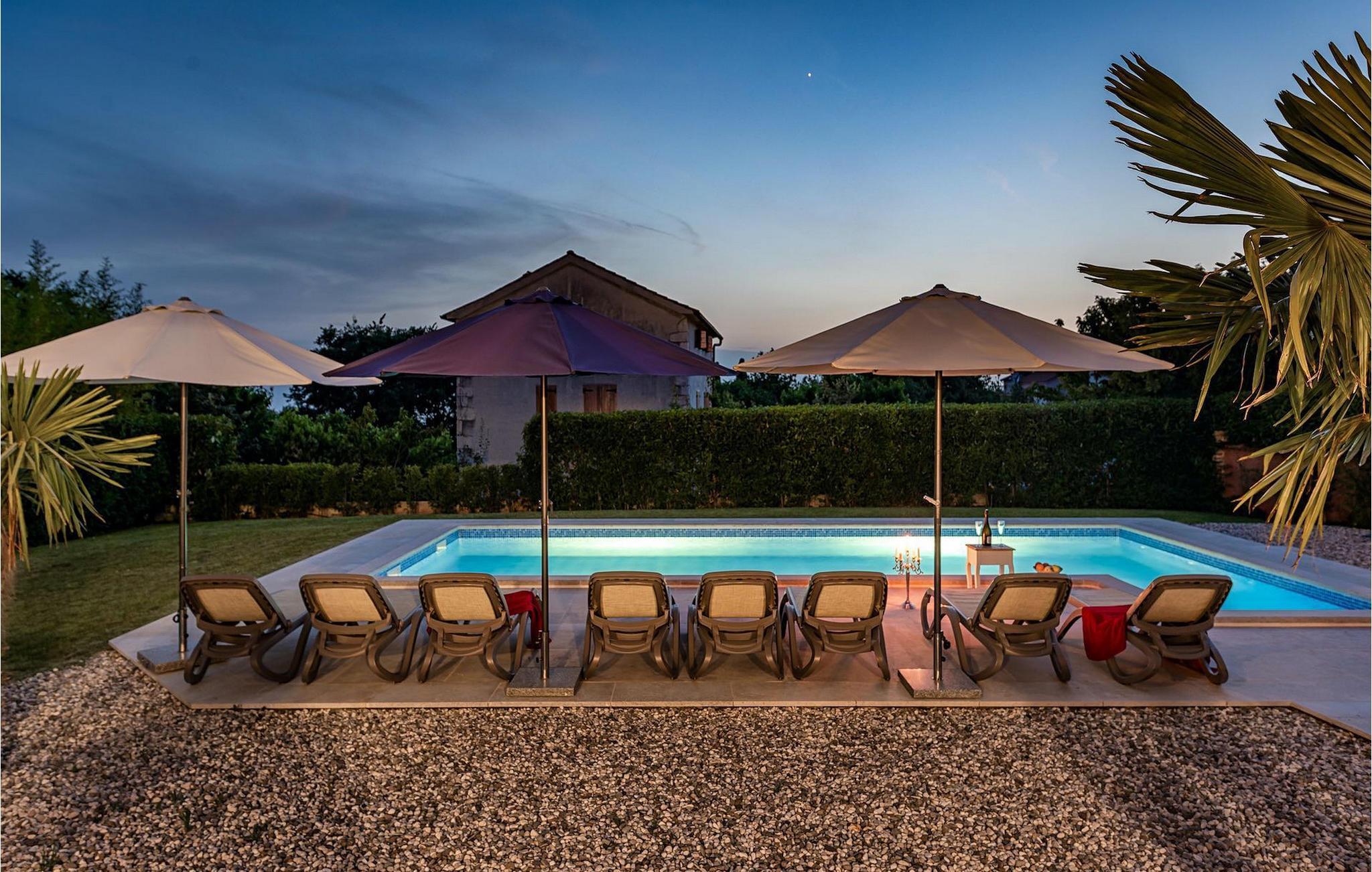 Diese elegante Villa, in der Nähe von Porec gelegen, besteht aus vier Licht-durchflutenden Schlafzimmern mit jeweils Klimaanlage und eigenem Badezimmer und ist die ideale Ferienunterkunft für bis zu 8 Personen. Die Liegestühle neben den geräumigen privaten Pool warten nur darauf, dass Sie sich entspannen und die Sonne einfach genießen. Nur ein paar Schritte vom Pool, befindet sich ein schöner Essbereich im Freien, wo Sie Ihre Grillgerichte genießen können. Der Innenbereich der Villa ist stilvoll eingerichtet, sehr hell und luftig. Das Erdgeschoss besteht aus einem der vier Schlafzimmer, einem separaten Badezimmer und einem offen gestalteten Raum, der in eine völlig ausgestattete Küche und den Ess- und Wohnbereich unterteilt ist. Die restlichen drei Schlafzimmer befinden sich auf der oberen Etage, wo Sie auch einen gemütlichen Balkon finden - den perfekten Ort, um einen Morgenkaffee zu genießen und dabei den von Palmen umgebenen Pool zu betrachten.Die Lage der Villa Cvita Domenica ist perfekt, denn sie ist nur einen kurzen Spaziergang vom nächsten Restaurant, Bar und Supermarkt entfernt, und ein paar Kilometer von der Altstadt von Porec, entfernt - dem touristischen Hotspot der Umgebung mit all seinen Sportmöglichkeiten und gastronomischen und Entertainment- Annehmlichkeiten. Die atemberaubende Euphrasius-Basilika ist das Symbol dieser Küstenstadt. Auch Sonnenuntergänge in Porec sind sehenswert. Der nächste Strand ist ca. 10 km von der Villa entfernt. Da die Küste leicht mit dem Auto erreichbar ist, haben Sie viele verschiedene Strände zu entdecken. Das Inland dieses Teils von Istrien bietet viele Wander- und Radwege sowie viele Möglichkeiten, die kleinen Städte Istriens und ihre kulturellen und gastronomischen Besonderheiten zu entdecken.