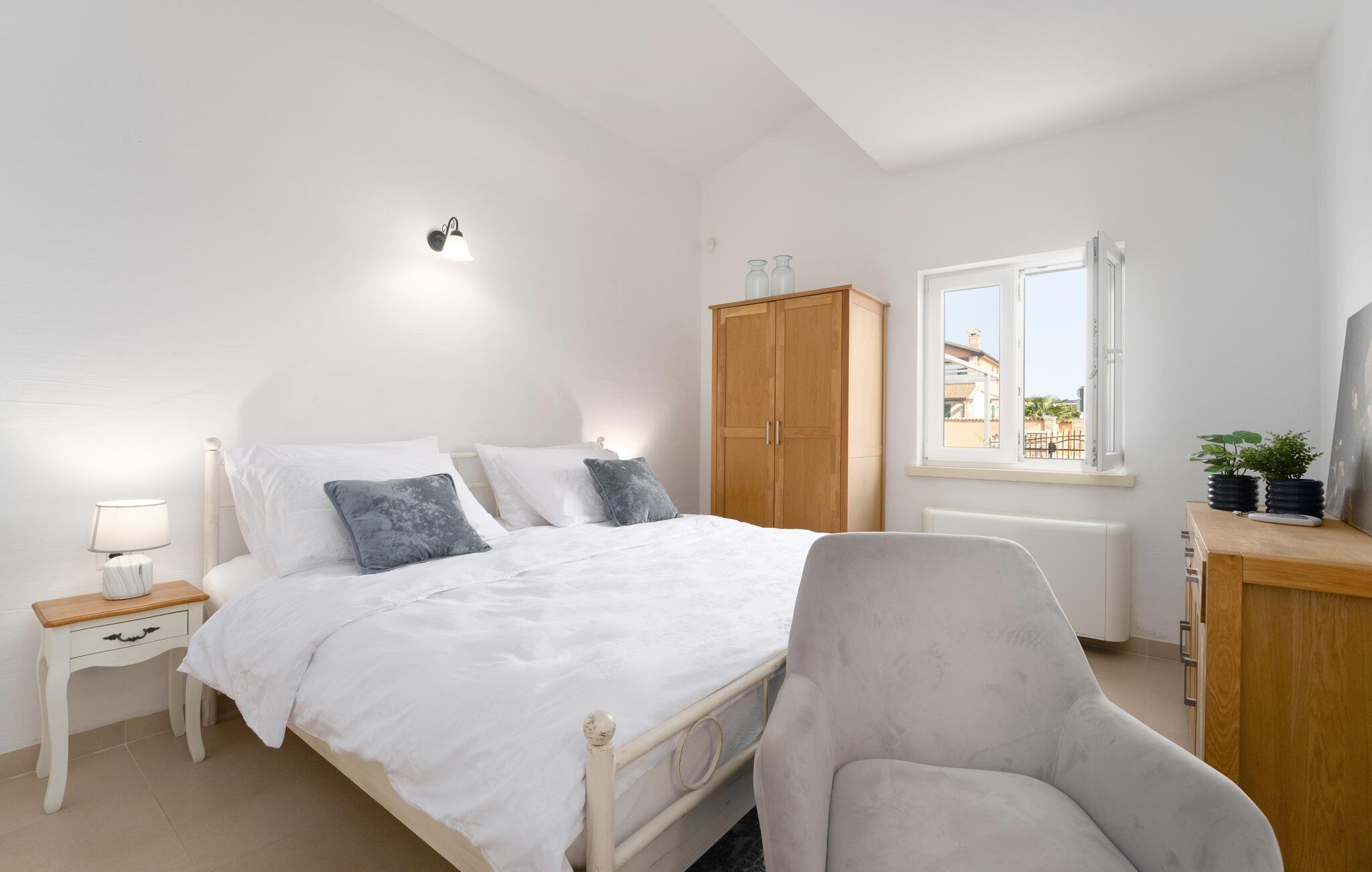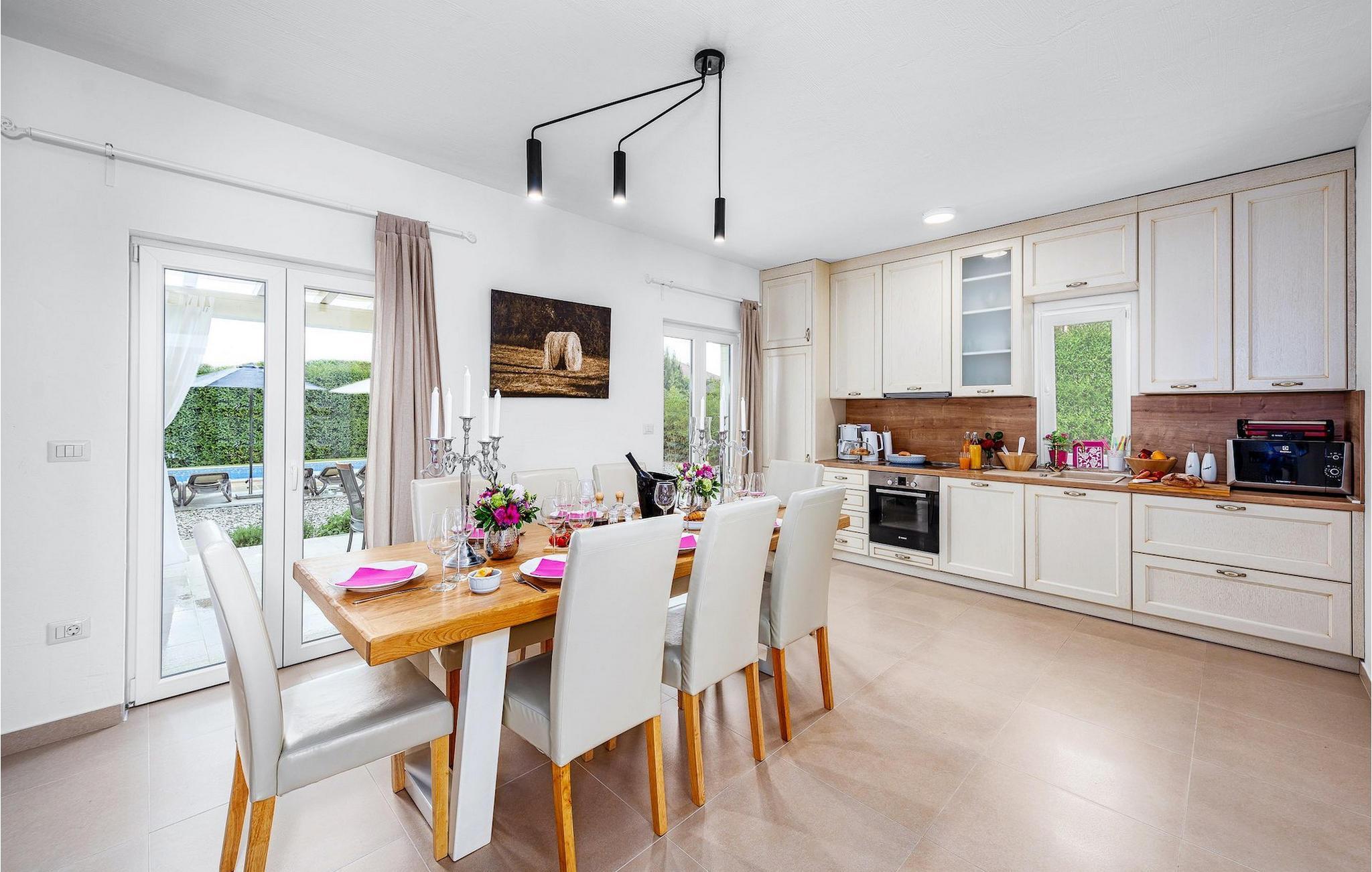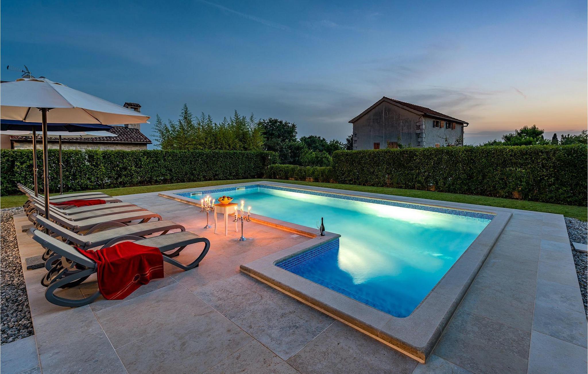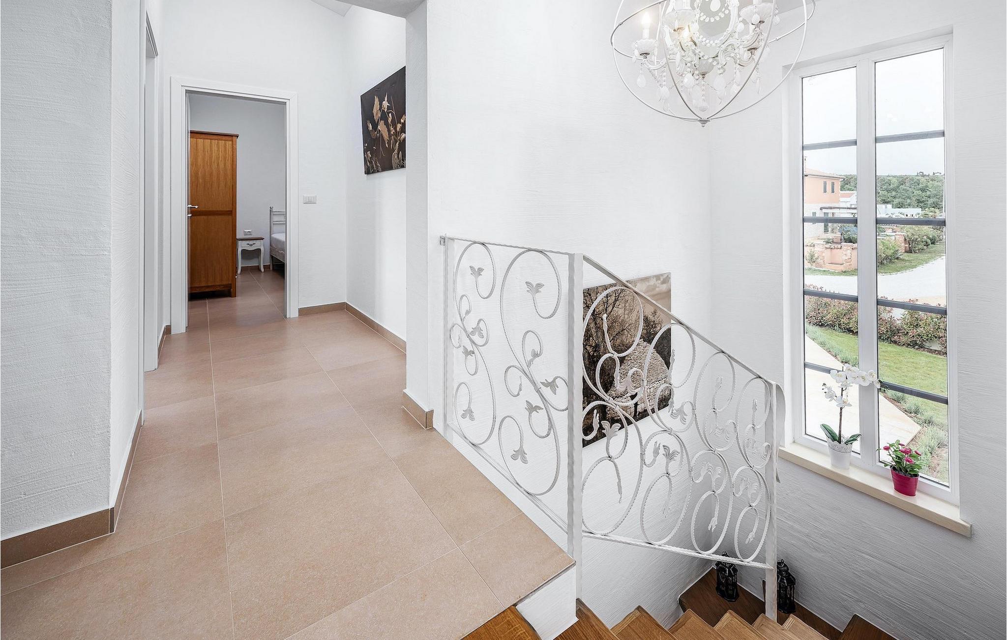 Diese elegante Villa, in der Nähe von Porec gelegen, besteht aus vier Licht-durchflutenden Schlafzimmern mit jeweils Klimaanlage und eigenem Badezimmer und ist die ideale Ferienunterkunft für bis zu 8 Personen. Die Liegestühle neben den geräumigen privaten Pool warten nur darauf, dass Sie sich entspannen und die Sonne einfach genießen. Nur ein paar Schritte vom Pool, befindet sich ein schöner Essbereich im Freien, wo Sie Ihre Grillgerichte genießen können. Der Innenbereich der Villa ist stilvoll eingerichtet, sehr hell und luftig. Das Erdgeschoss besteht aus einem der vier Schlafzimmer, einem separaten Badezimmer und einem offen gestalteten Raum, der in eine völlig ausgestattete Küche und den Ess- und Wohnbereich unterteilt ist. Die restlichen drei Schlafzimmer befinden sich auf der oberen Etage, wo Sie auch einen gemütlichen Balkon finden - den perfekten Ort, um einen Morgenkaffee zu genießen und dabei den von Palmen umgebenen Pool zu betrachten.Die Lage der Villa Cvita Domenica ist perfekt, denn sie ist nur einen kurzen Spaziergang vom nächsten Restaurant, Bar und Supermarkt entfernt, und ein paar Kilometer von der Altstadt von Porec, entfernt - dem touristischen Hotspot der Umgebung mit all seinen Sportmöglichkeiten und gastronomischen und Entertainment- Annehmlichkeiten. Die atemberaubende Euphrasius-Basilika ist das Symbol dieser Küstenstadt. Auch Sonnenuntergänge in Porec sind sehenswert. Der nächste Strand ist ca. 10 km von der Villa entfernt. Da die Küste leicht mit dem Auto erreichbar ist, haben Sie viele verschiedene Strände zu entdecken. Das Inland dieses Teils von Istrien bietet viele Wander- und Radwege sowie viele Möglichkeiten, die kleinen Städte Istriens und ihre kulturellen und gastronomischen Besonderheiten zu entdecken.