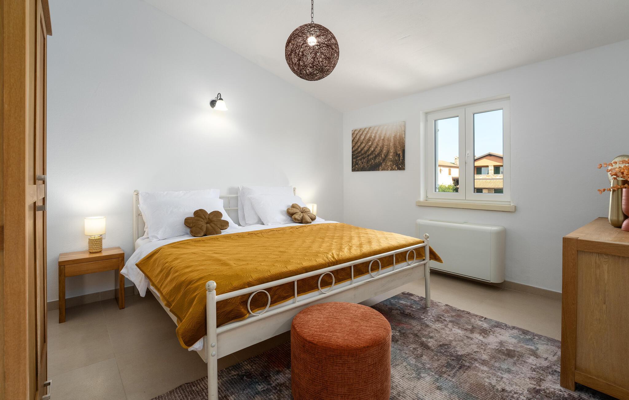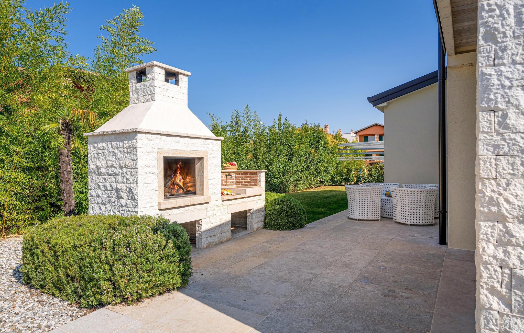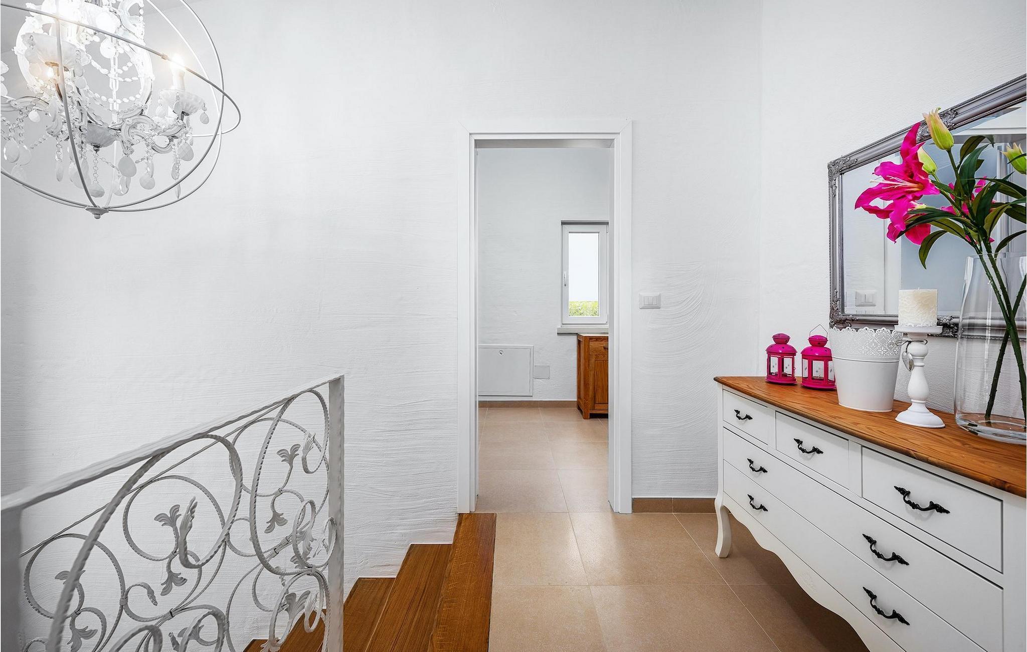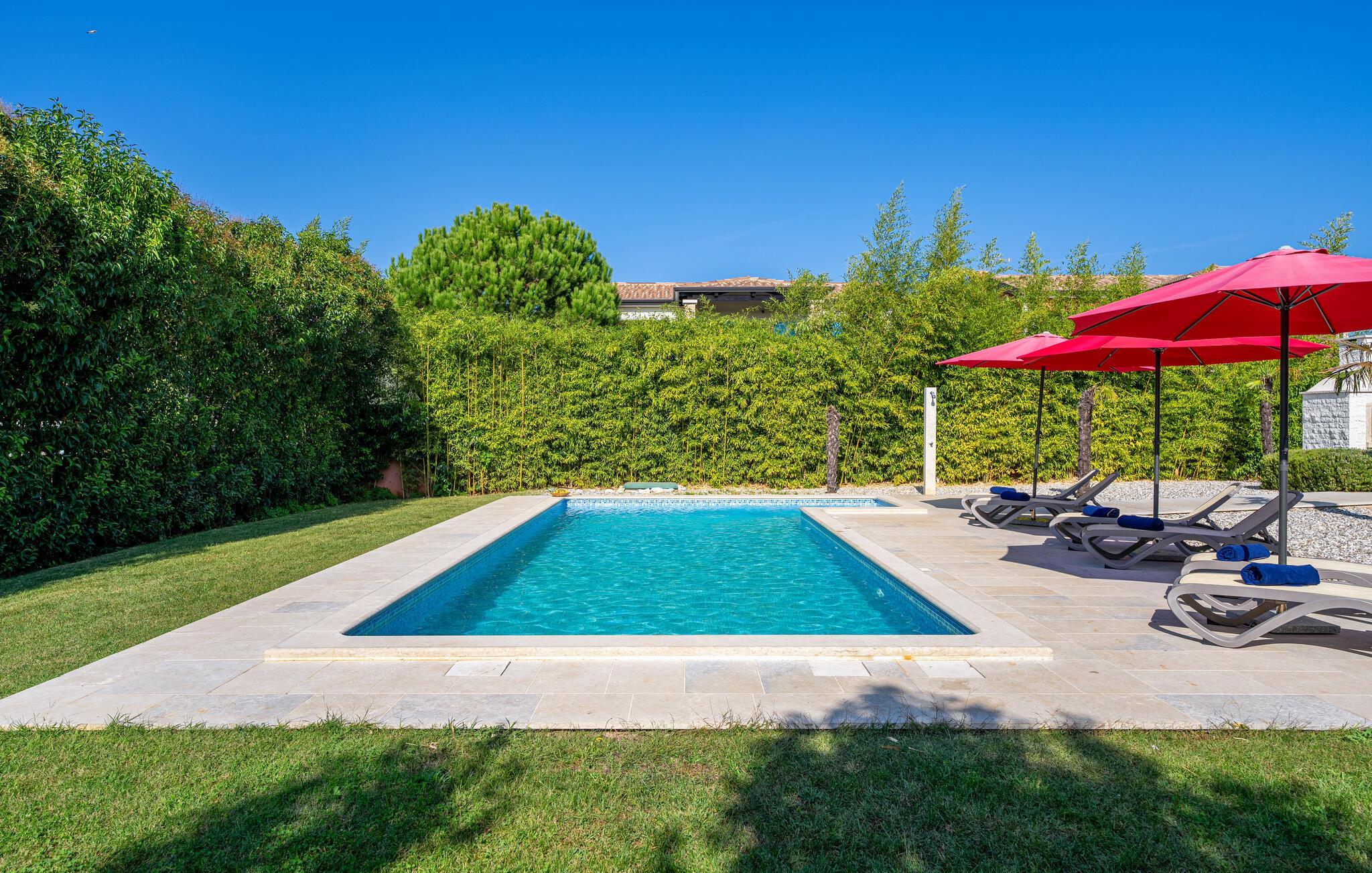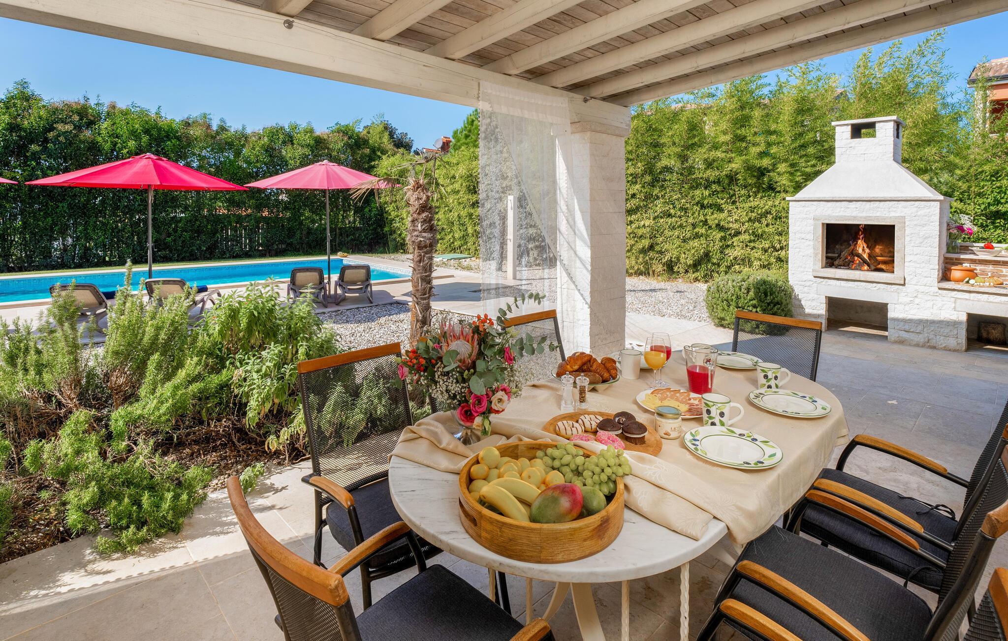 Diese elegante Villa, in der Nähe von Porec gelegen, besteht aus vier Licht-durchflutenden Schlafzimmern mit jeweils Klimaanlage und eigenem Badezimmer und ist die ideale Ferienunterkunft für bis zu 8 Personen. Die Liegestühle neben den geräumigen privaten Pool warten nur darauf, dass Sie sich entspannen und die Sonne einfach genießen. Nur ein paar Schritte vom Pool, befindet sich ein schöner Essbereich im Freien, wo Sie Ihre Grillgerichte genießen können. Der Innenbereich der Villa ist stilvoll eingerichtet, sehr hell und luftig. Das Erdgeschoss besteht aus einem der vier Schlafzimmer, einem separaten Badezimmer und einem offen gestalteten Raum, der in eine völlig ausgestattete Küche und den Ess- und Wohnbereich unterteilt ist. Die restlichen drei Schlafzimmer befinden sich auf der oberen Etage, wo Sie auch einen gemütlichen Balkon finden - den perfekten Ort, um einen Morgenkaffee zu genießen und dabei den von Palmen umgebenen Pool zu betrachten.Die Lage der Villa Cvita Domenica ist perfekt, denn sie ist nur einen kurzen Spaziergang vom nächsten Restaurant, Bar und Supermarkt entfernt, und ein paar Kilometer von der Altstadt von Porec, entfernt - dem touristischen Hotspot der Umgebung mit all seinen Sportmöglichkeiten und gastronomischen und Entertainment- Annehmlichkeiten. Die atemberaubende Euphrasius-Basilika ist das Symbol dieser Küstenstadt. Auch Sonnenuntergänge in Porec sind sehenswert. Der nächste Strand ist ca. 10 km von der Villa entfernt. Da die Küste leicht mit dem Auto erreichbar ist, haben Sie viele verschiedene Strände zu entdecken. Das Inland dieses Teils von Istrien bietet viele Wander- und Radwege sowie viele Möglichkeiten, die kleinen Städte Istriens und ihre kulturellen und gastronomischen Besonderheiten zu entdecken.