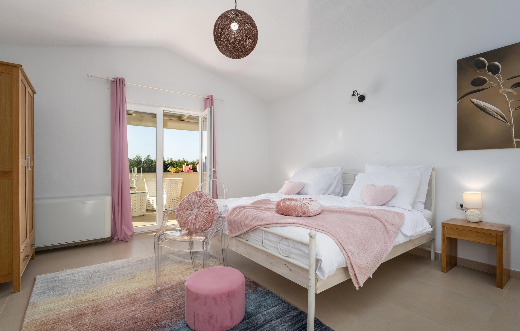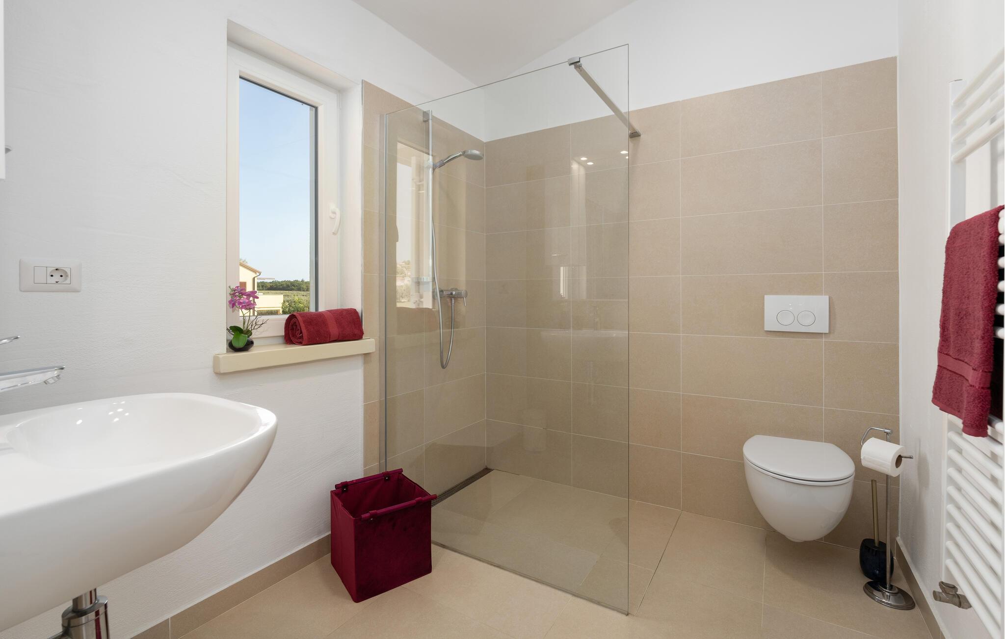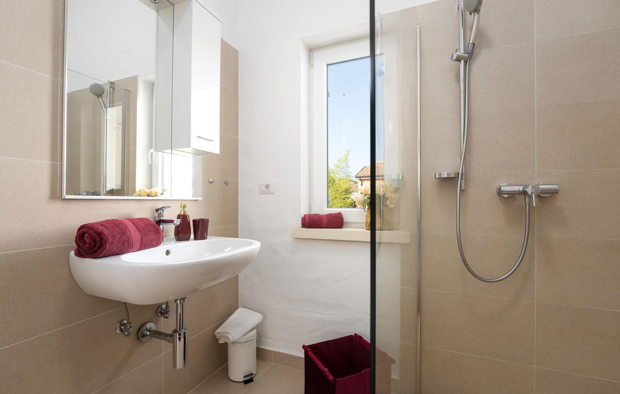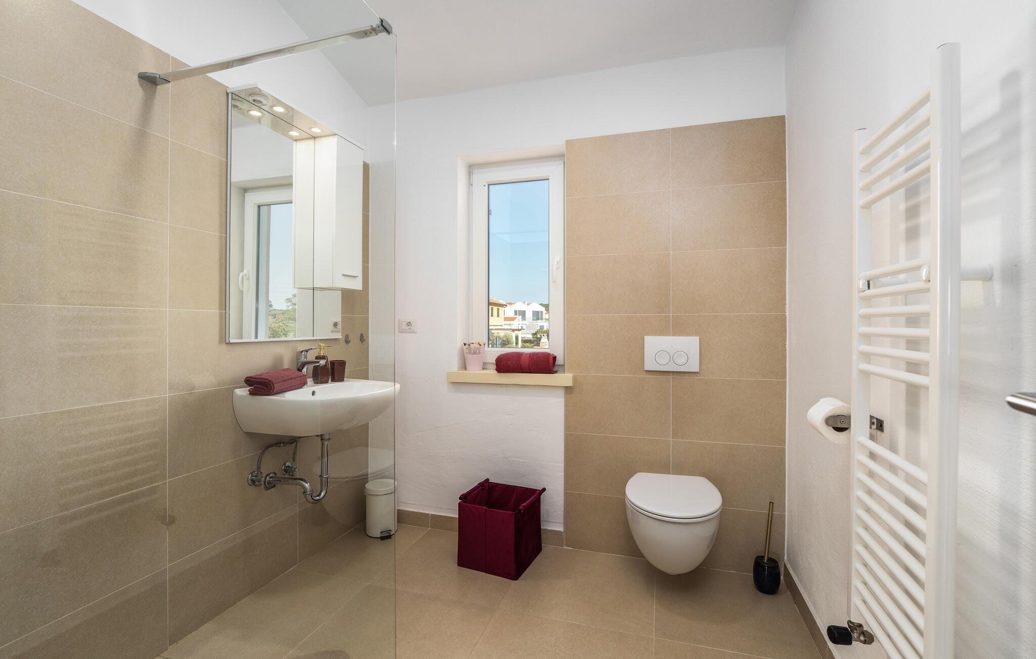 Diese elegante Villa, in der Nähe von Porec gelegen, besteht aus vier Licht-durchflutenden Schlafzimmern mit jeweils Klimaanlage und eigenem Badezimmer und ist die ideale Ferienunterkunft für bis zu 8 Personen. Die Liegestühle neben den geräumigen privaten Pool warten nur darauf, dass Sie sich entspannen und die Sonne einfach genießen. Nur ein paar Schritte vom Pool, befindet sich ein schöner Essbereich im Freien, wo Sie Ihre Grillgerichte genießen können. Der Innenbereich der Villa ist stilvoll eingerichtet, sehr hell und luftig. Das Erdgeschoss besteht aus einem der vier Schlafzimmer, einem separaten Badezimmer und einem offen gestalteten Raum, der in eine völlig ausgestattete Küche und den Ess- und Wohnbereich unterteilt ist. Die restlichen drei Schlafzimmer befinden sich auf der oberen Etage, wo Sie auch einen gemütlichen Balkon finden - den perfekten Ort, um einen Morgenkaffee zu genießen und dabei den von Palmen umgebenen Pool zu betrachten.Die Lage der Villa Cvita Domenica ist perfekt, denn sie ist nur einen kurzen Spaziergang vom nächsten Restaurant, Bar und Supermarkt entfernt, und ein paar Kilometer von der Altstadt von Porec, entfernt - dem touristischen Hotspot der Umgebung mit all seinen Sportmöglichkeiten und gastronomischen und Entertainment- Annehmlichkeiten. Die atemberaubende Euphrasius-Basilika ist das Symbol dieser Küstenstadt. Auch Sonnenuntergänge in Porec sind sehenswert. Der nächste Strand ist ca. 10 km von der Villa entfernt. Da die Küste leicht mit dem Auto erreichbar ist, haben Sie viele verschiedene Strände zu entdecken. Das Inland dieses Teils von Istrien bietet viele Wander- und Radwege sowie viele Möglichkeiten, die kleinen Städte Istriens und ihre kulturellen und gastronomischen Besonderheiten zu entdecken.