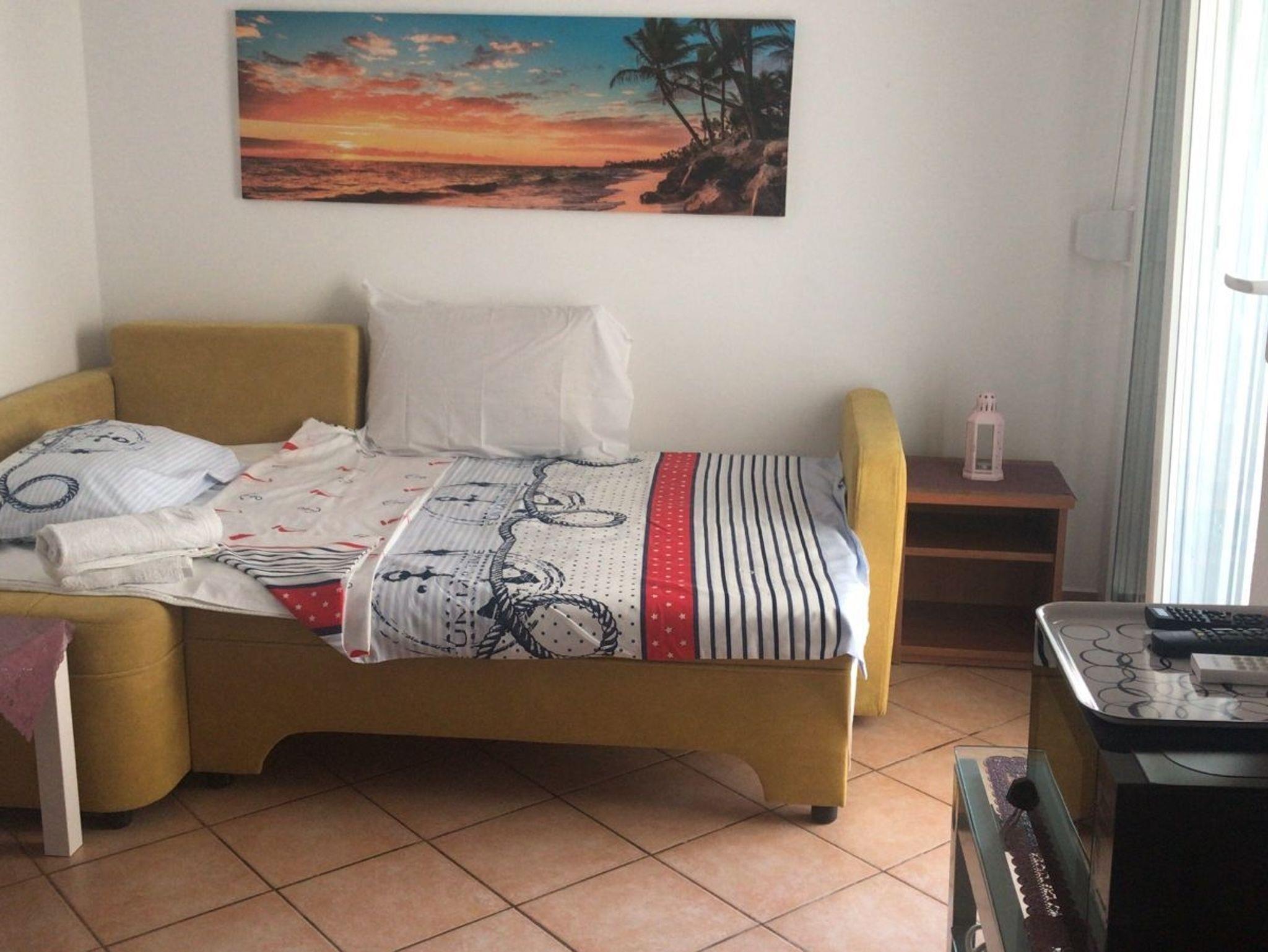 Ferienwohnung bietet Platz für 6 Gäste. Die Betten sind in Schlafzimmern, die es 2 gibt, und in Wohnzimmer, innerhalb einer Gesamtfläche von 37m2, angeordnet. Die Gäste haben eine eigene Terrasse zur Verfügung, auf der sie in warmen Sommernächten genießen können. Es ist erlaubt, Speisen auf dem Gemeinschafts-Grill vorzubereiten. In der Unterkunftseinheit besteht die Möglichkeit des Mitbringens von Haustieren gegen Aufpreis. IM PREIS INBEGRIFFEN: Kurtaxe, Endreinigung, Klimatisierung, Parkplatz, Internet, Kinderbett, Bügelbrett, Föhn. VERBINDLICHE ZUSÄTZLICHE KOSTEN: Aufzahlung für Kurzaufenthalte (prozentualer Zuschlag pro Nächtigungsanzahl: 30% - 1, 20% - 2, 10% - 3). UNVERBINDLICHE ZUSÄTZLICHE KOSTEN: Haustiere (5,00 € pro Nacht). Die Verfügbarkeit zusätzlicher Dienstleistungen in Ihrem reservierten Termin und die Preise derselben (falls nicht aufgeführt) müssen im Voraus überprüft werden. Zusätzliche Dienstleistungen die in der Zahlungsaufforderung nicht aufgeführt sind werden direkt beim Vermieter bezahlt, angenommen der Gast nutzt auch diese.