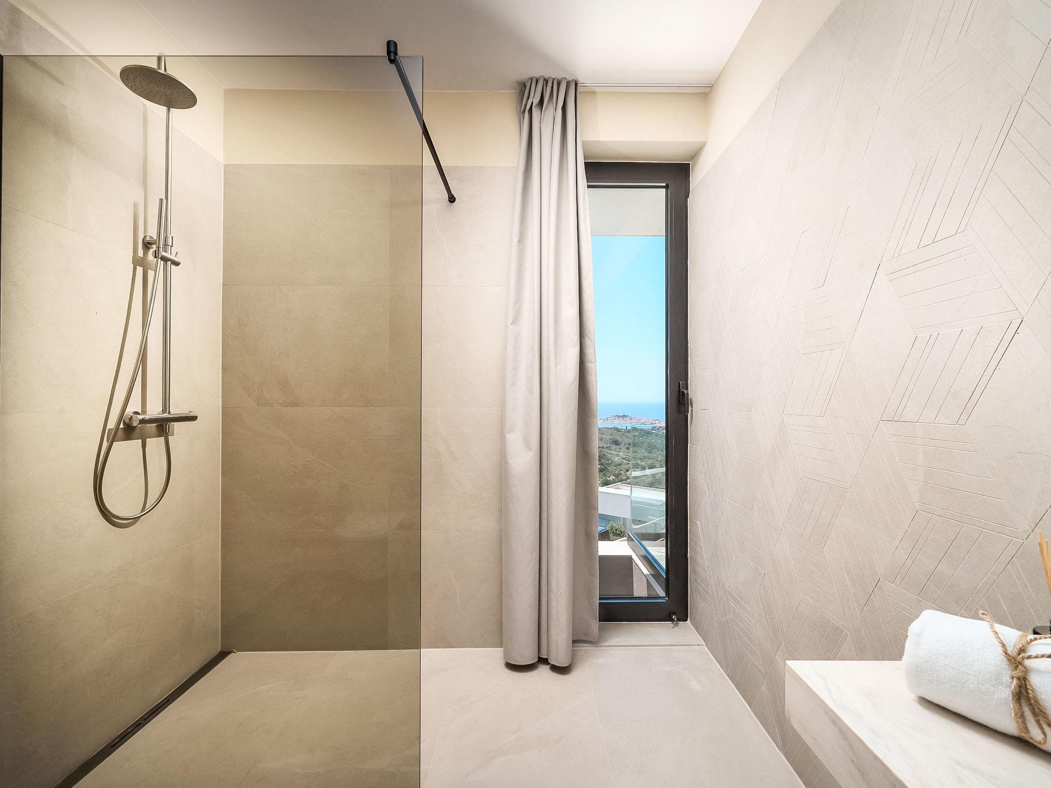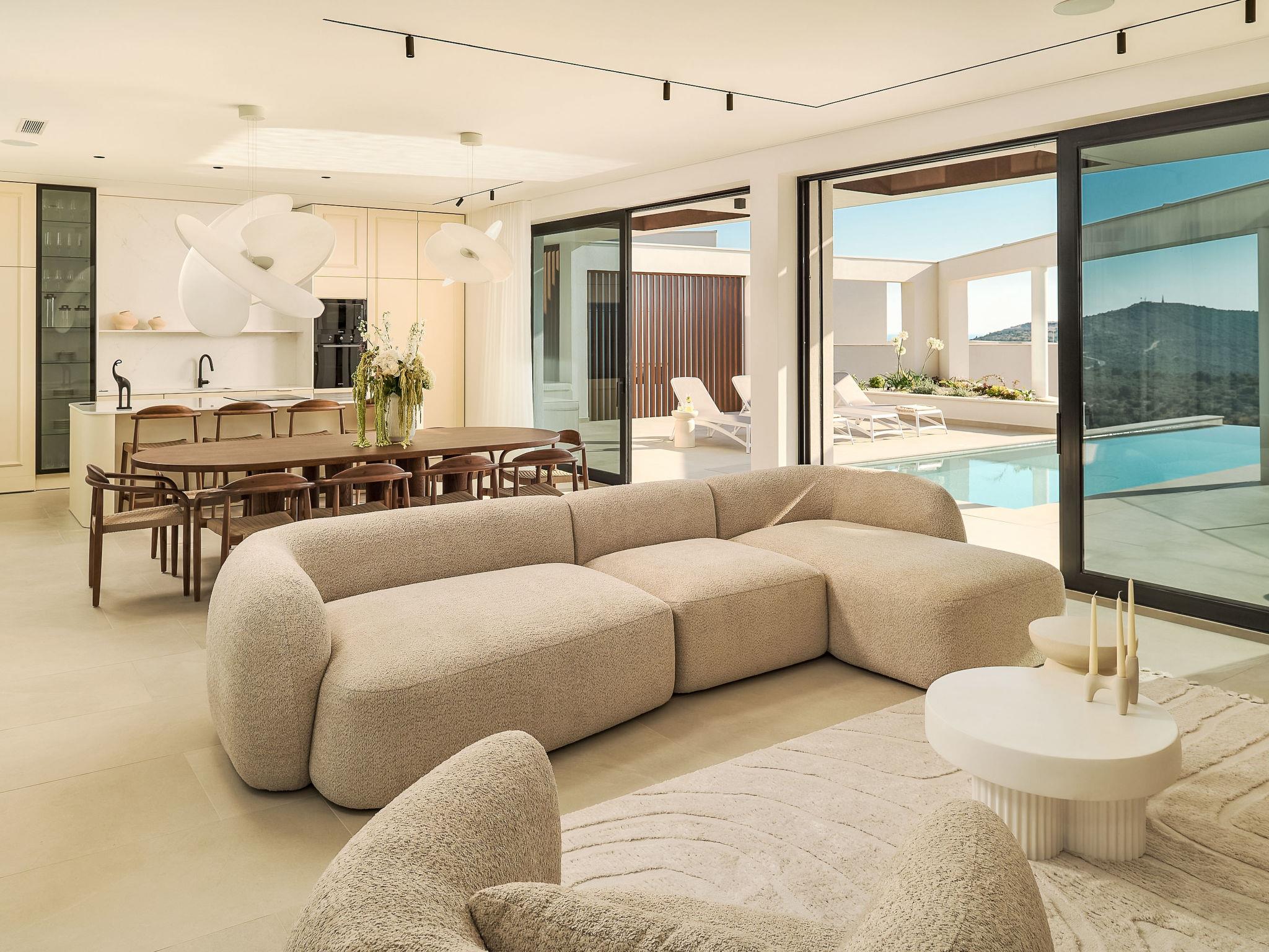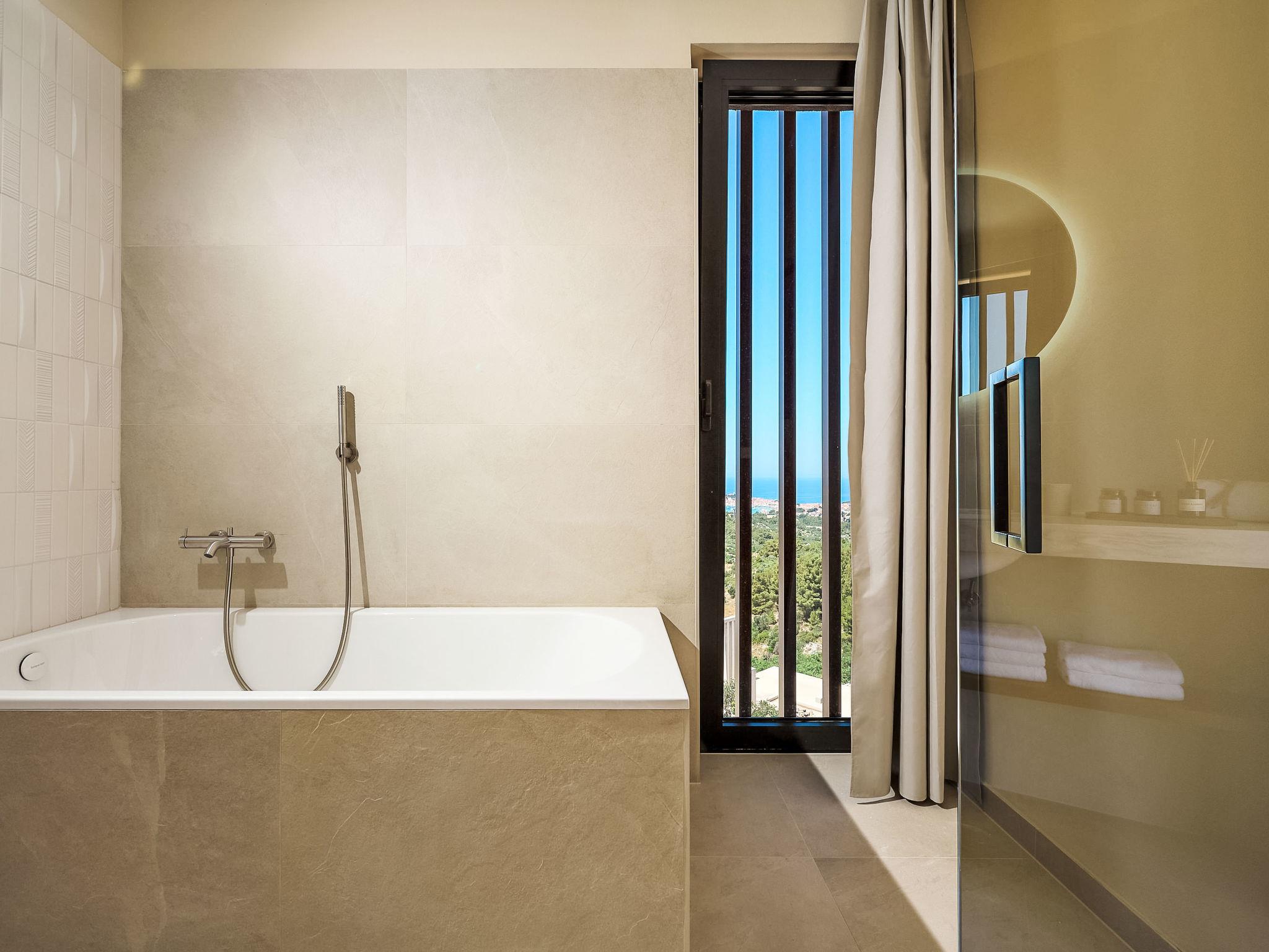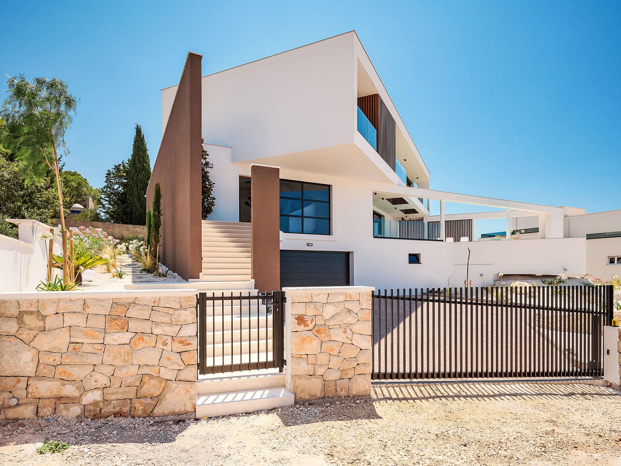 7-Zimmer-Villa 450 m2. Schön und modern eingerichtet: Wohn-/Esszimmer mit Sat-TV (Flachbildschirm), Klimaanlage. Ausgang zum Garten, zur Terrasse. 1 Zimmer mit 1 Doppeldiwanbett (160 cm, Länge 200 cm), Sat-TV (Flachbildschirm), Klimaanlage. Offene Küche (Backofen, Geschirrspüler, 4 Glaskeramikplatten, Toaster, Wasserkocher, Mikrowelle, Tiefkühler, elektrische Kaffeemaschine, Kochinsel). Sep. WC. Unteres Geschoss: 1 Zimmer mit 1 franz. Bett (180 cm, Länge 200 cm), Bad/WC und Sat-TV (Flachbildschirm), Klimaanlage. Ausgang zur Terrasse. Obergeschoss: 1 Zimmer 30 m2 mit 1 franz. Bett (180 cm, Länge 200 cm), Bad/WC und Sat-TV (Flachbildschirm), Klimaanlage. Ausgang zum Balkon. 1 Zimmer 30 m2 mit Dusche/WC und Sat-TV (Flachbildschirm), Klimaanlage. Ausgang zum Balkon. 1 Zimmer 20 m2 mit 2 Betten (90 cm, Länge 200 cm), Dusche/WC und Sat-TV (Flachbildschirm), Klimaanlage. Ausgang zum Balkon. 1 Zimmer 20 m2 mit 1 franz. Bett (180 cm, Länge 200 cm), Dusche/WC und Sat-TV (Flachbildschirm), Klimaanlage. Ausgang zum Balkon. 5 Balkone 5 m2, Terrasse 25 m2. Gartengrill, Liegestühle (5). Schöne Fernsicht auf das Meer und die Landschaft. Zur Verfügung: Waschmaschine, Wäschetrockner, Safe, Kinderhochstuhl, Babybett, Haartrockner. Internet (WLAN, gratis). Maximal 1 kleines Haustier/Hund erlaubt.