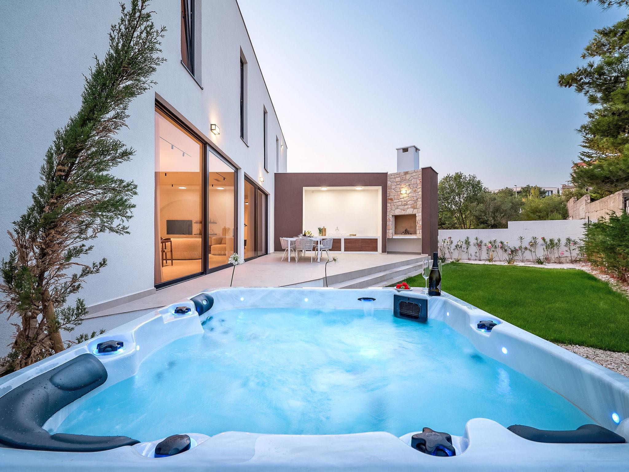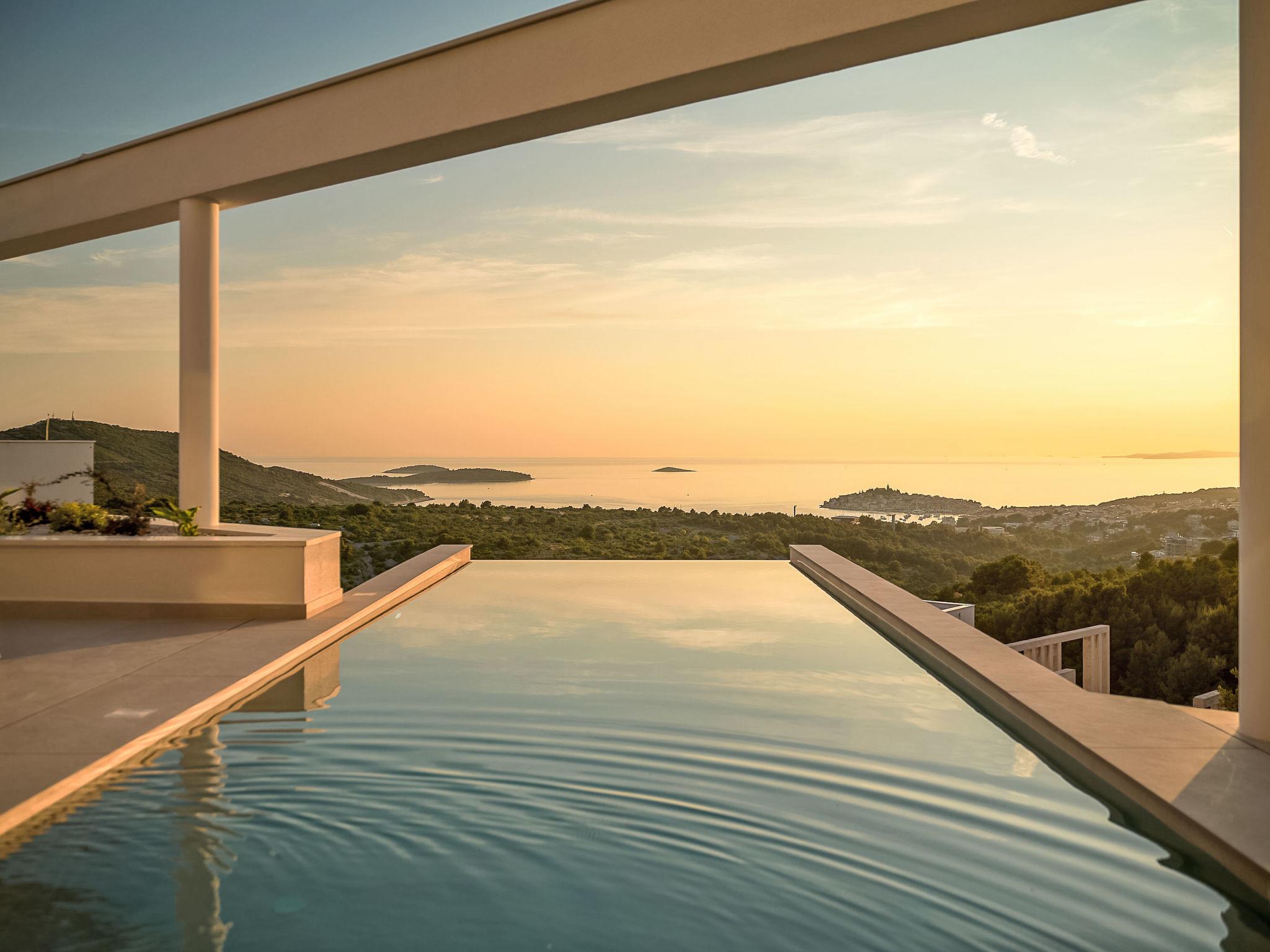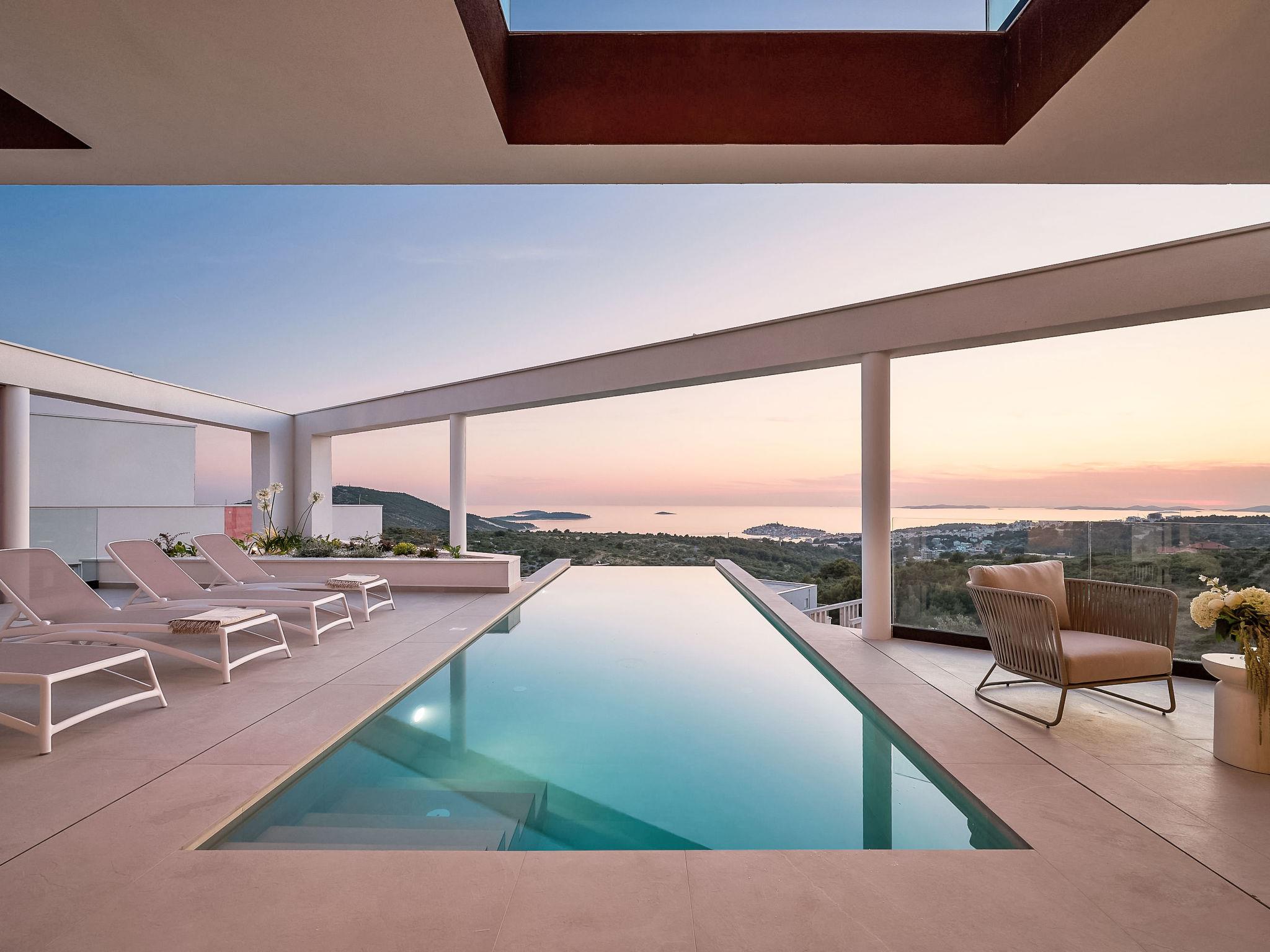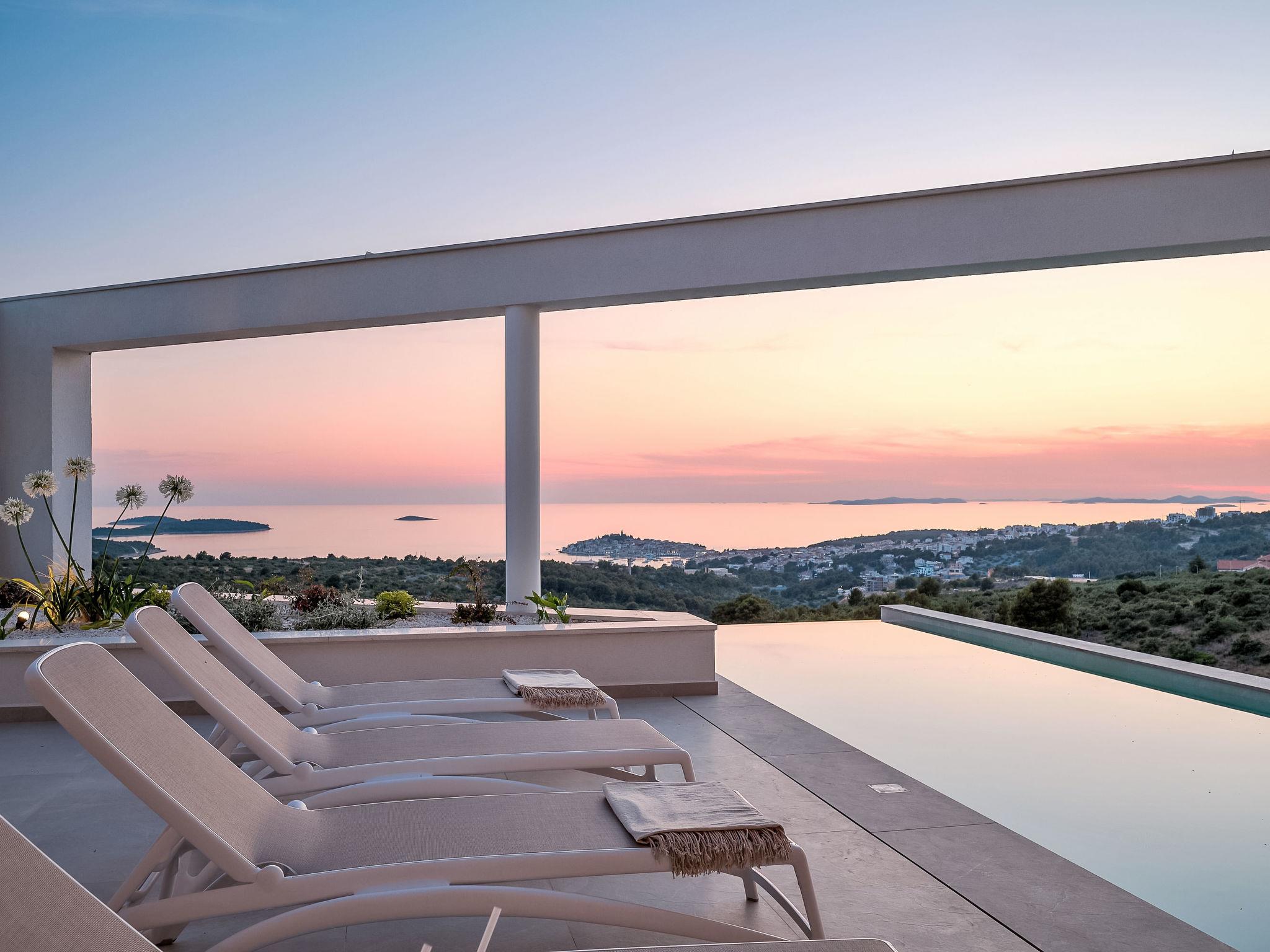 Moderne Villa "Five K", auf 3 Stockwerken. 2.3 km vom Zentrum von Primošten, ruhige, sonnige Lage, 2 m vom Meer, 2.3 km vom Strand, in einer Sackgasse. Zur Alleinbenutzung: Grundstück 1'100 m2 (eingezäunt), Garten, Liegewiese 200 m2, Schwimmbad eckig (10 x 3 m, 150 cm tief, saisonale Verfügbarkeit: 30.Mar. - 12.Okt.) mit Innentreppe. Aussendusche, Sprudelbad, Terrasse (55 m2), Gartenmöbel, Grill, Kinderspielplatz. Im Hause: Internetzugang, Billard, Spielzimmer, Tischfussball, Waschmaschine, Wäschetrockner. (extra). Parkplatz (für 4 Autos) beim Haus auf dem Grundstück, Einzelgarage. Einkaufsgeschäft 2 km, Restaurant 2.5 km, Bushaltestelle 2 km, Kieselstrand 2.3 km, Felsstrand 2.3 km. Jacht-Hafen 2 km.