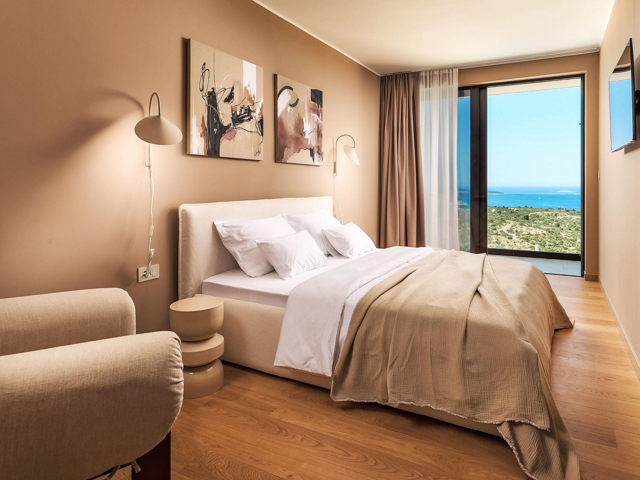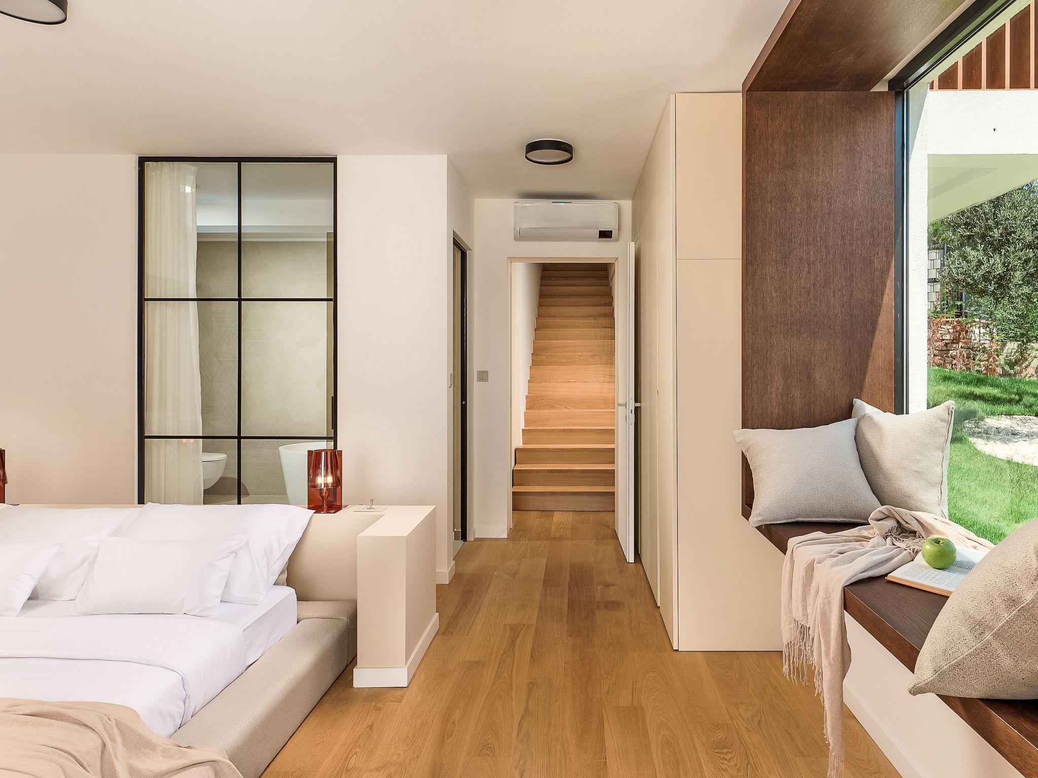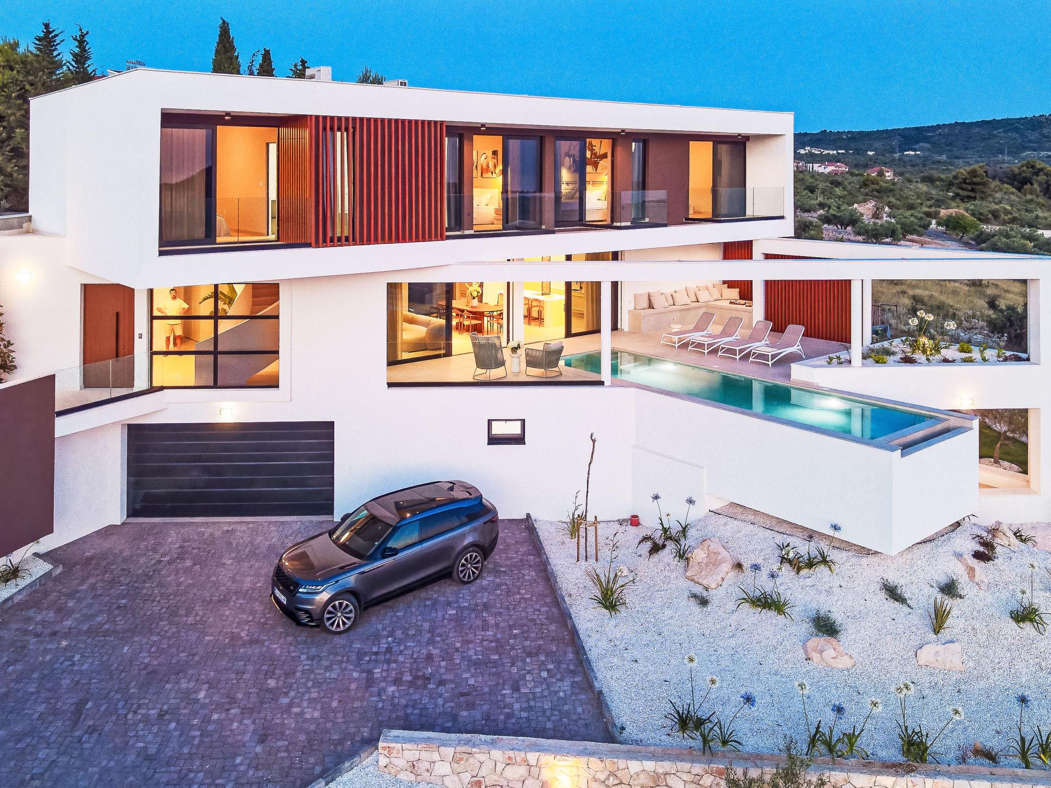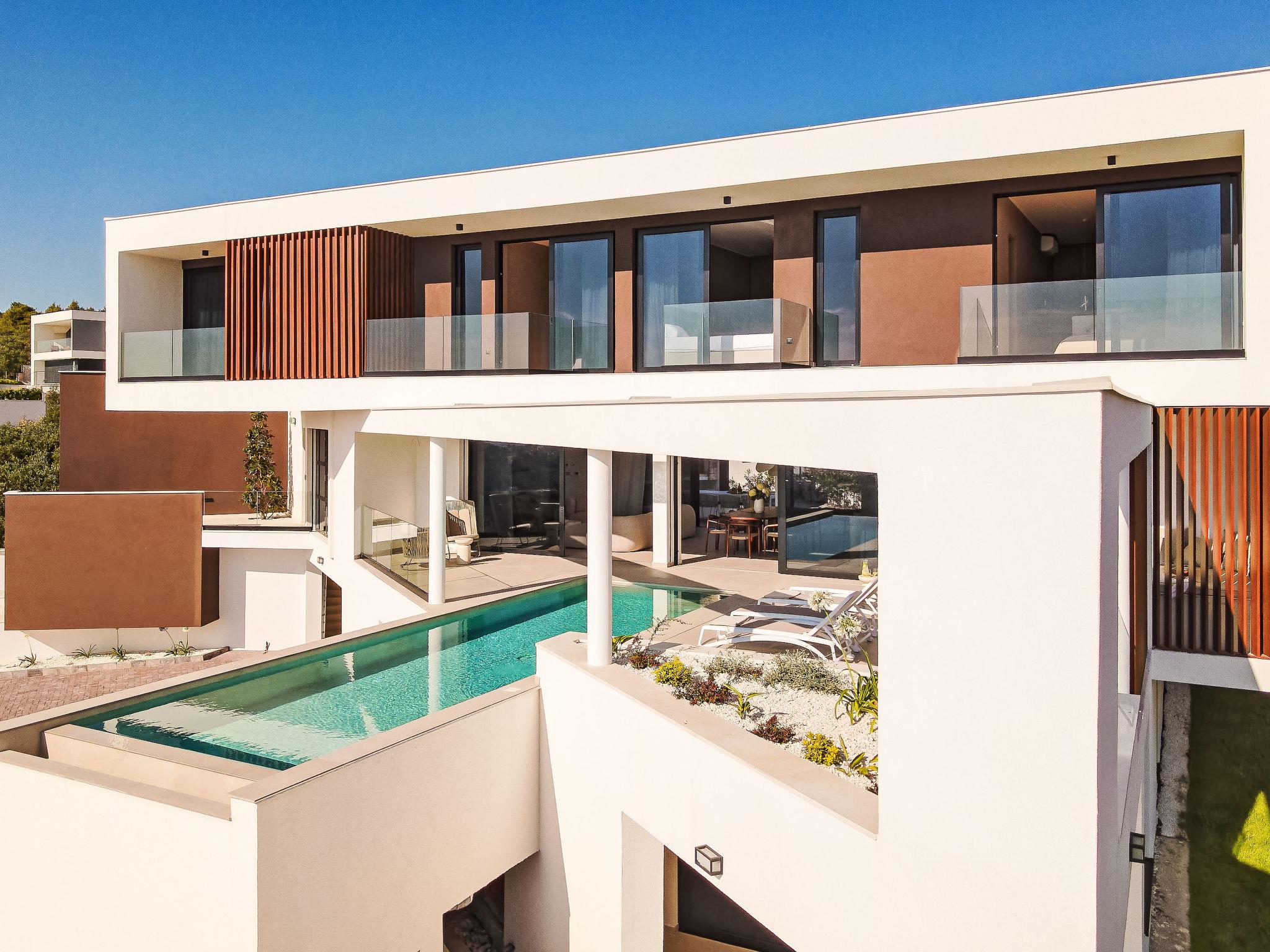 Moderne Villa "Five K", auf 3 Stockwerken. 2.3 km vom Zentrum von Primošten, ruhige, sonnige Lage, 2 m vom Meer, 2.3 km vom Strand, in einer Sackgasse. Zur Alleinbenutzung: Grundstück 1'100 m2 (eingezäunt), Garten, Liegewiese 200 m2, Schwimmbad eckig (10 x 3 m, 150 cm tief, saisonale Verfügbarkeit: 30.Mar. - 12.Okt.) mit Innentreppe. Aussendusche, Sprudelbad, Terrasse (55 m2), Gartenmöbel, Grill, Kinderspielplatz. Im Hause: Internetzugang, Billard, Spielzimmer, Tischfussball, Waschmaschine, Wäschetrockner. (extra). Parkplatz (für 4 Autos) beim Haus auf dem Grundstück, Einzelgarage. Einkaufsgeschäft 2 km, Restaurant 2.5 km, Bushaltestelle 2 km, Kieselstrand 2.3 km, Felsstrand 2.3 km. Jacht-Hafen 2 km.