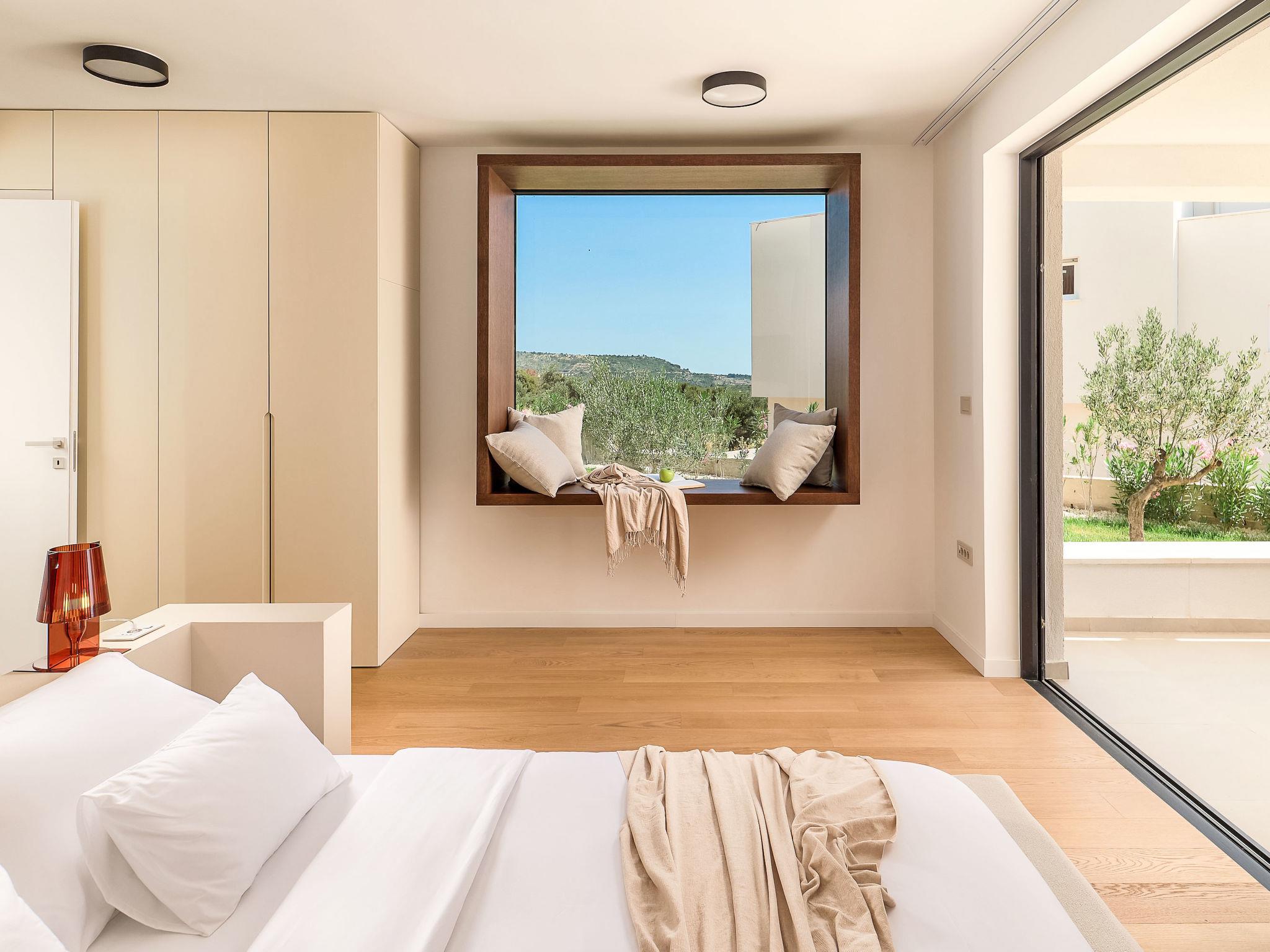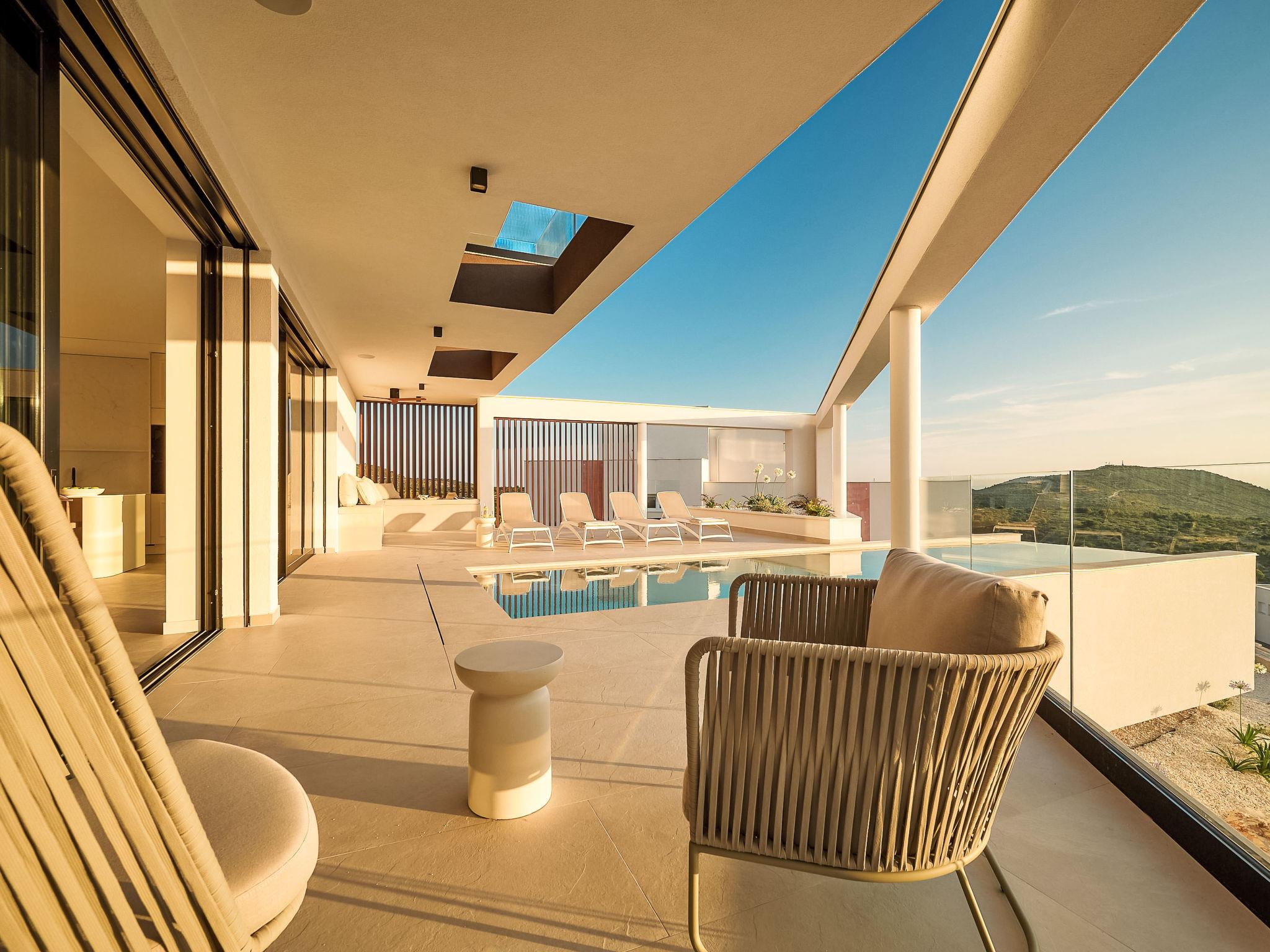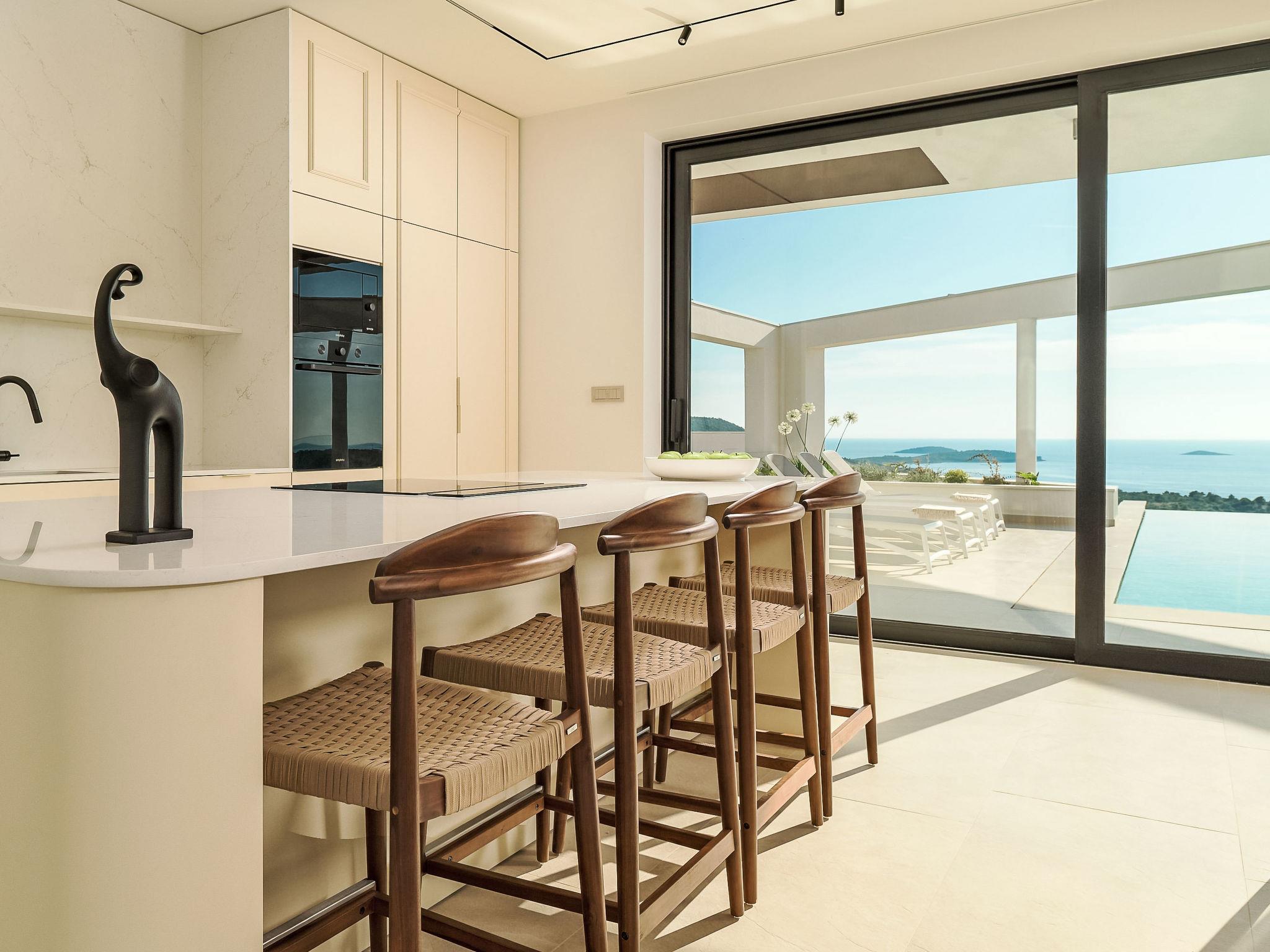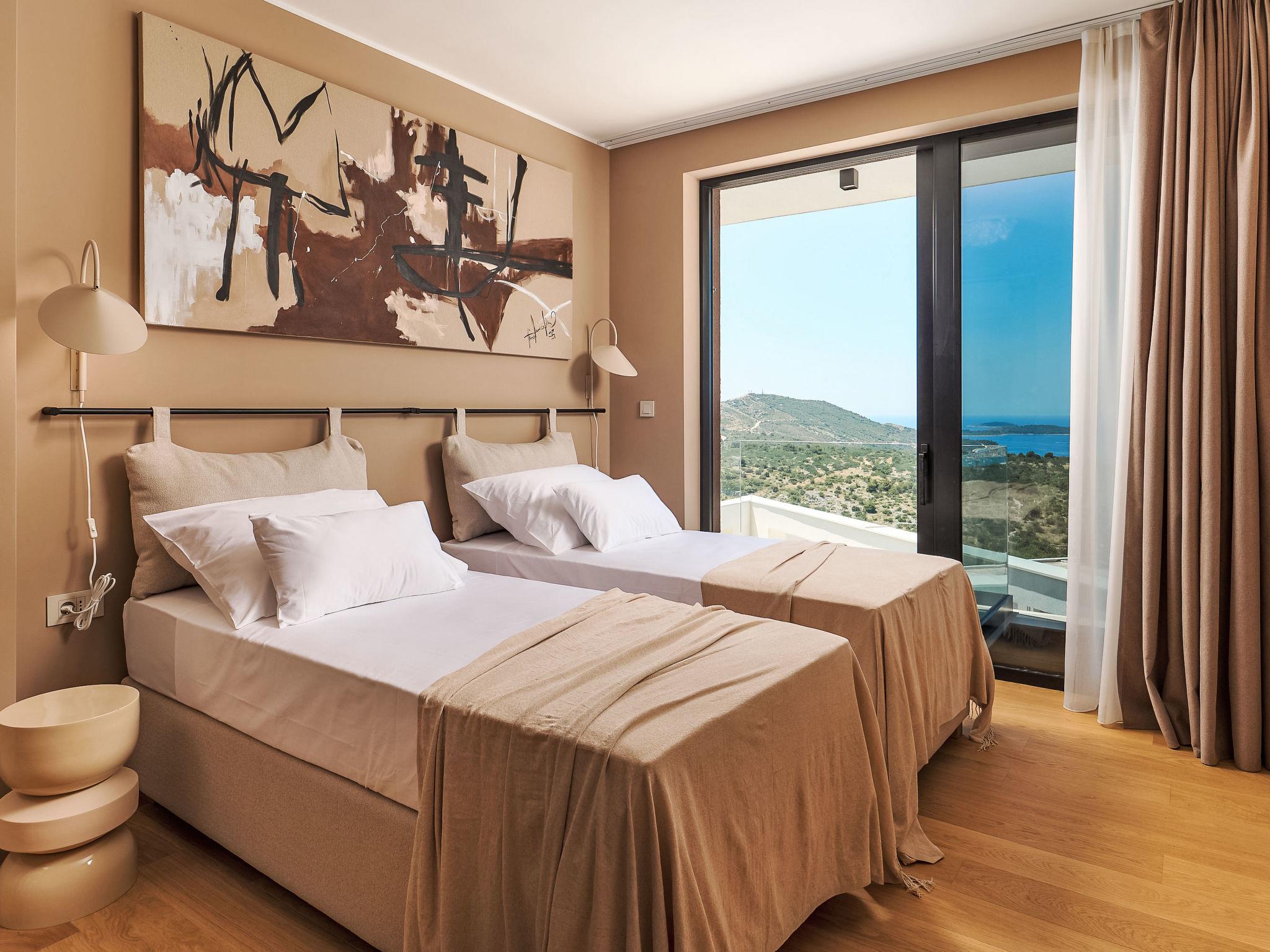 Moderne Villa "Five K", auf 3 Stockwerken. 2.3 km vom Zentrum von Primošten, ruhige, sonnige Lage, 2 m vom Meer, 2.3 km vom Strand, in einer Sackgasse. Zur Alleinbenutzung: Grundstück 1'100 m2 (eingezäunt), Garten, Liegewiese 200 m2, Schwimmbad eckig (10 x 3 m, 150 cm tief, saisonale Verfügbarkeit: 30.Mar. - 12.Okt.) mit Innentreppe. Aussendusche, Sprudelbad, Terrasse (55 m2), Gartenmöbel, Grill, Kinderspielplatz. Im Hause: Internetzugang, Billard, Spielzimmer, Tischfussball, Waschmaschine, Wäschetrockner. (extra). Parkplatz (für 4 Autos) beim Haus auf dem Grundstück, Einzelgarage. Einkaufsgeschäft 2 km, Restaurant 2.5 km, Bushaltestelle 2 km, Kieselstrand 2.3 km, Felsstrand 2.3 km. Jacht-Hafen 2 km.