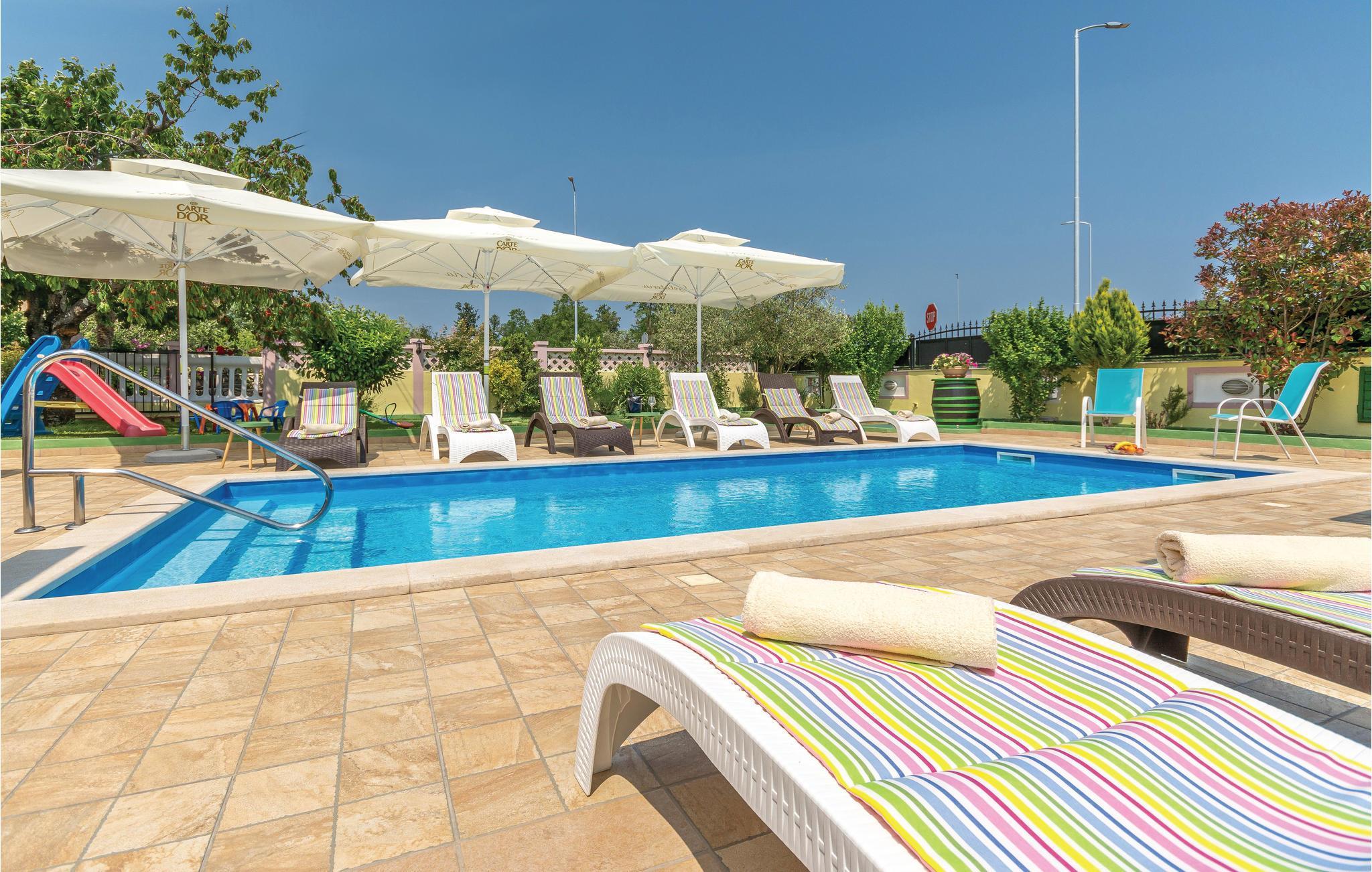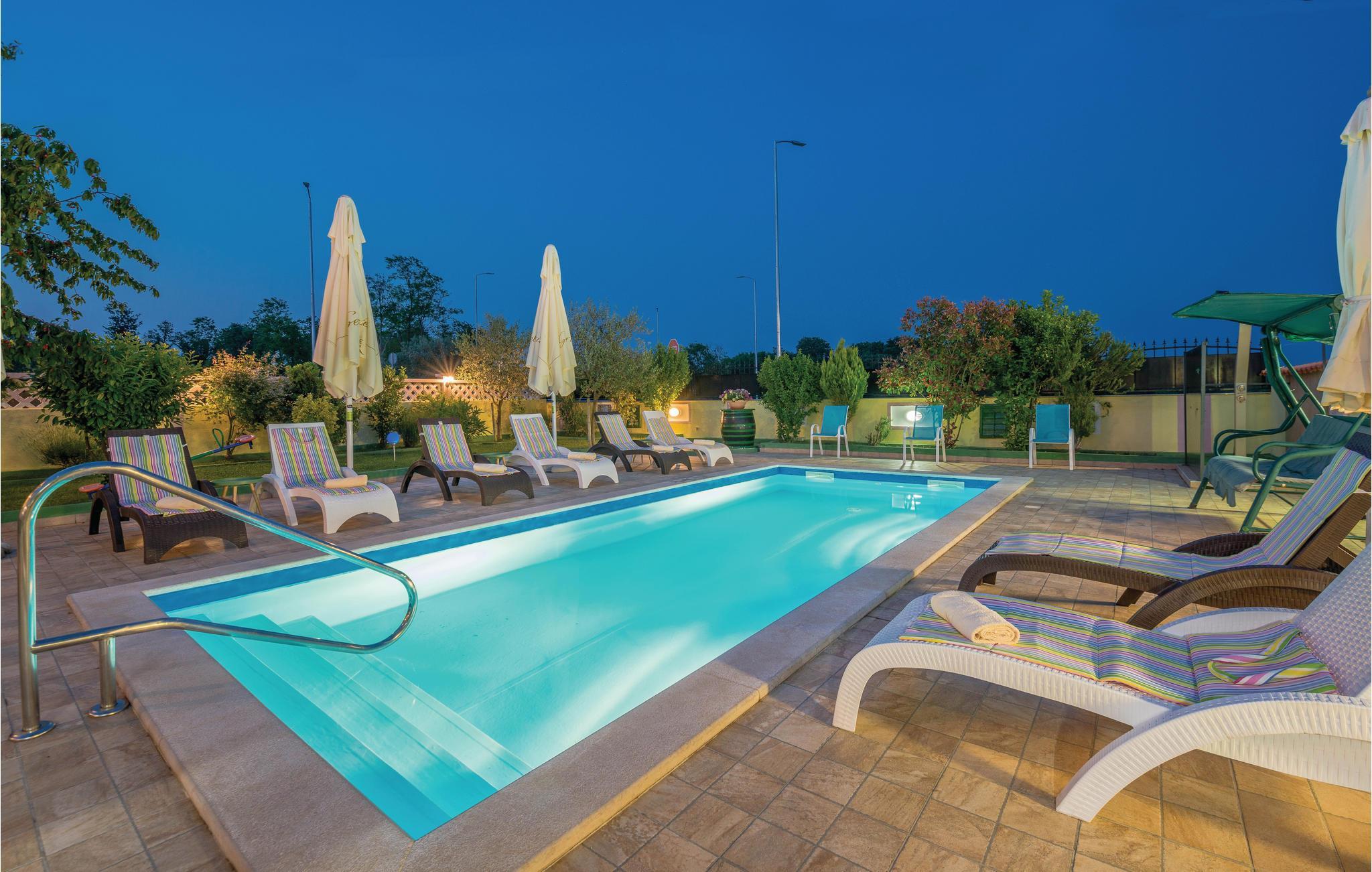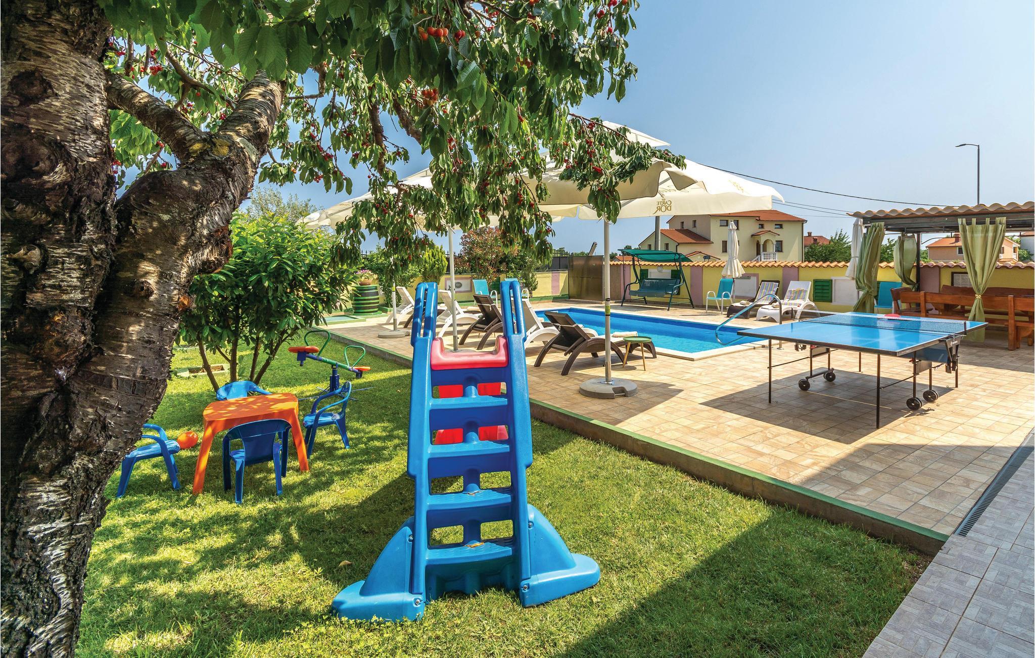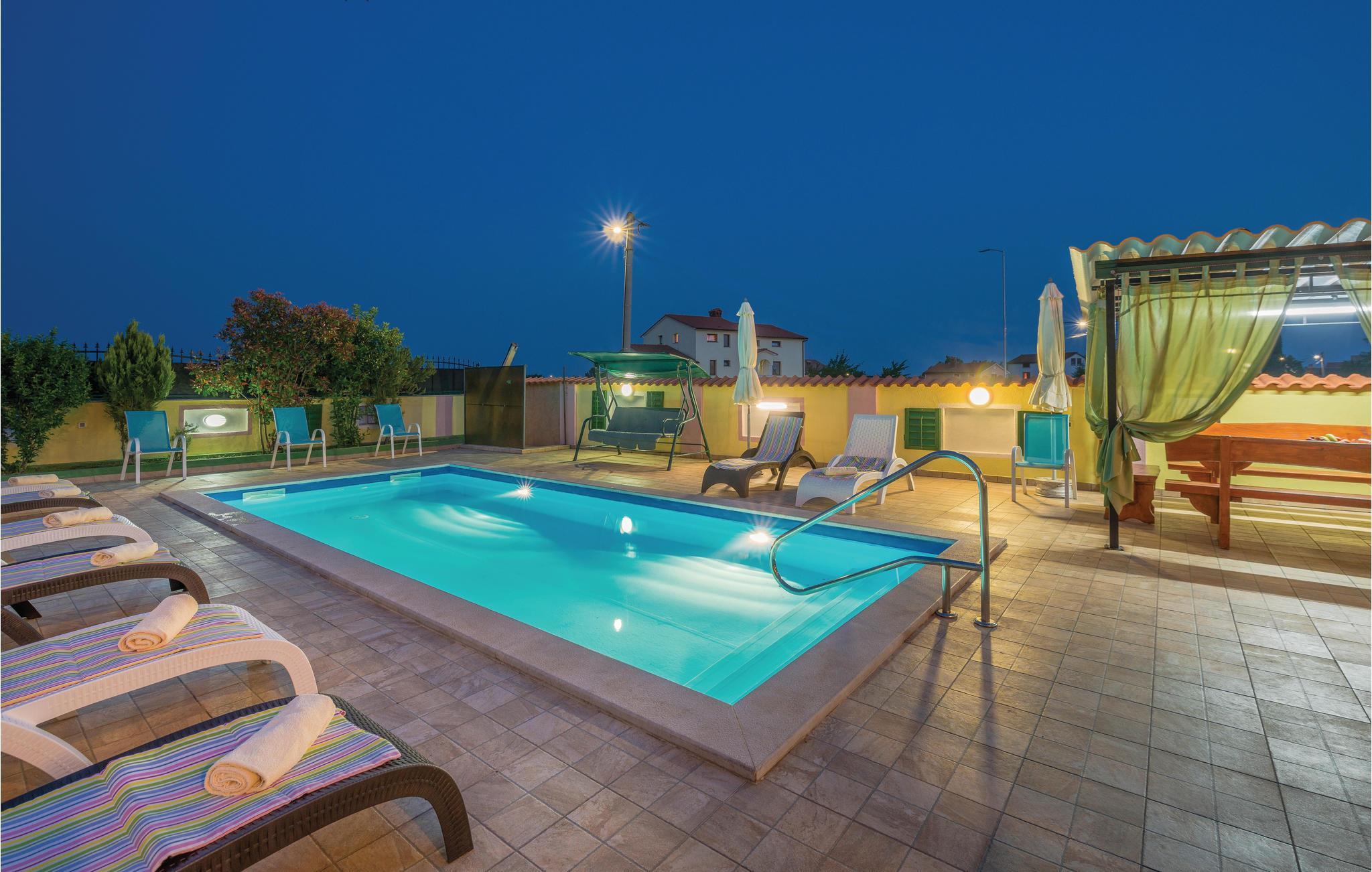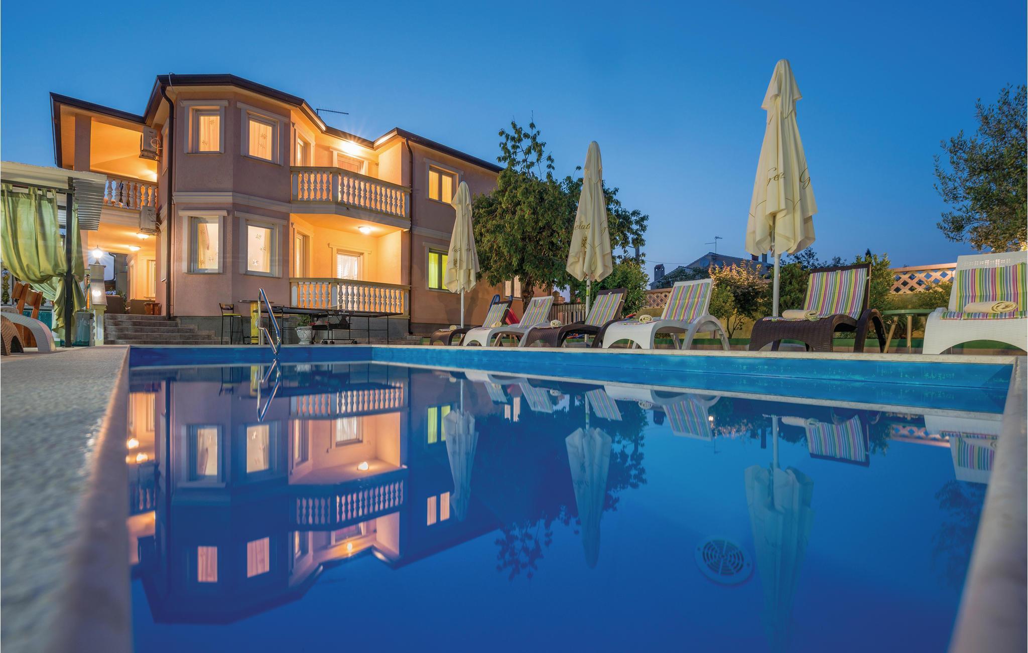Das moderne Ferienhaus liegt im Ort Loborika, 6 Kilometer vom antiken Pula entfernt. Mit großzügig dimensionierten Räumlichkeiten und einer komfortablen Einrichtung ist Ihnen ein angenehmer Urlaub sicher. Da das Erdgeschoß und der 1. Stock durch Außentreppen verbunden sind, ist das Haus ideal für einen gemeinsamen Urlaub von zwei Familien, die dabei keineswegs auf Privatsphäre verzichten müssen. Das Esszimmer im Erdgeschoß ist groß genug, um alle Gäste des Hauses zu empfangen und mit der überdachten Terrasse werden ideale Aufenthaltsräume für gemeinsame Mahlzeiten, Spiele, Unterhaltung und mehr geboten. Die neugierigen Blicke von anderen Menschen während Sie baden und sich am Pool sonnen, werden durch Mauern verhindert, die somit Privatsphäre garantieren. Den Kleinsten stehen Wippe und die Rutsche zur Verfügung. Die Lage des Hauses ermöglicht Ihnen Tagesausflüge nach Pula zu unternehmen, oder das schöne Innere Istriens und seine Besonderheiten zu erkunden. Die schönen Strände finden Sie in der Nähe von Pula, Medulin, Krnica und Duga Uvala, sicher ist Ihr Lieblingsstrand dabei.