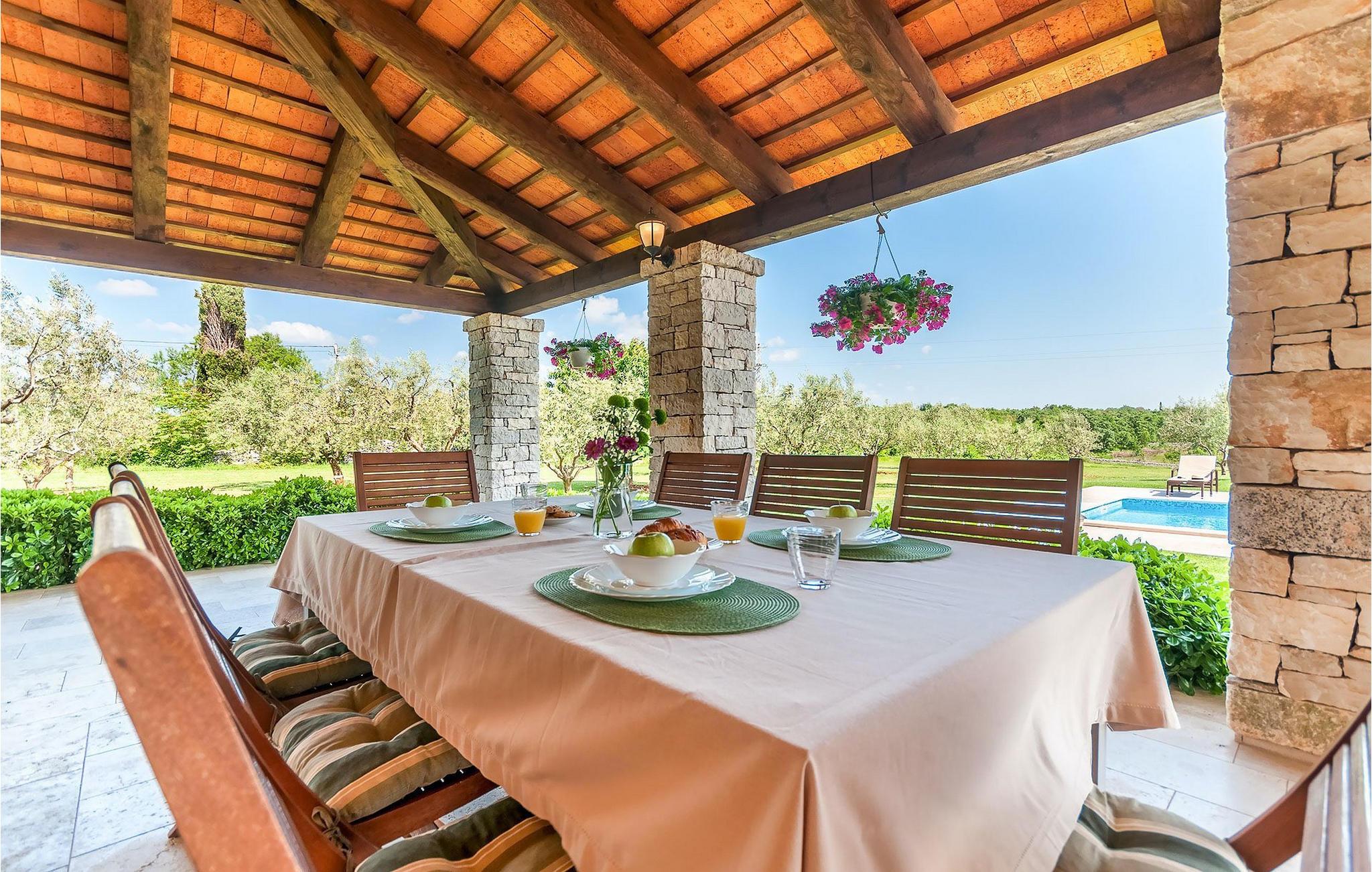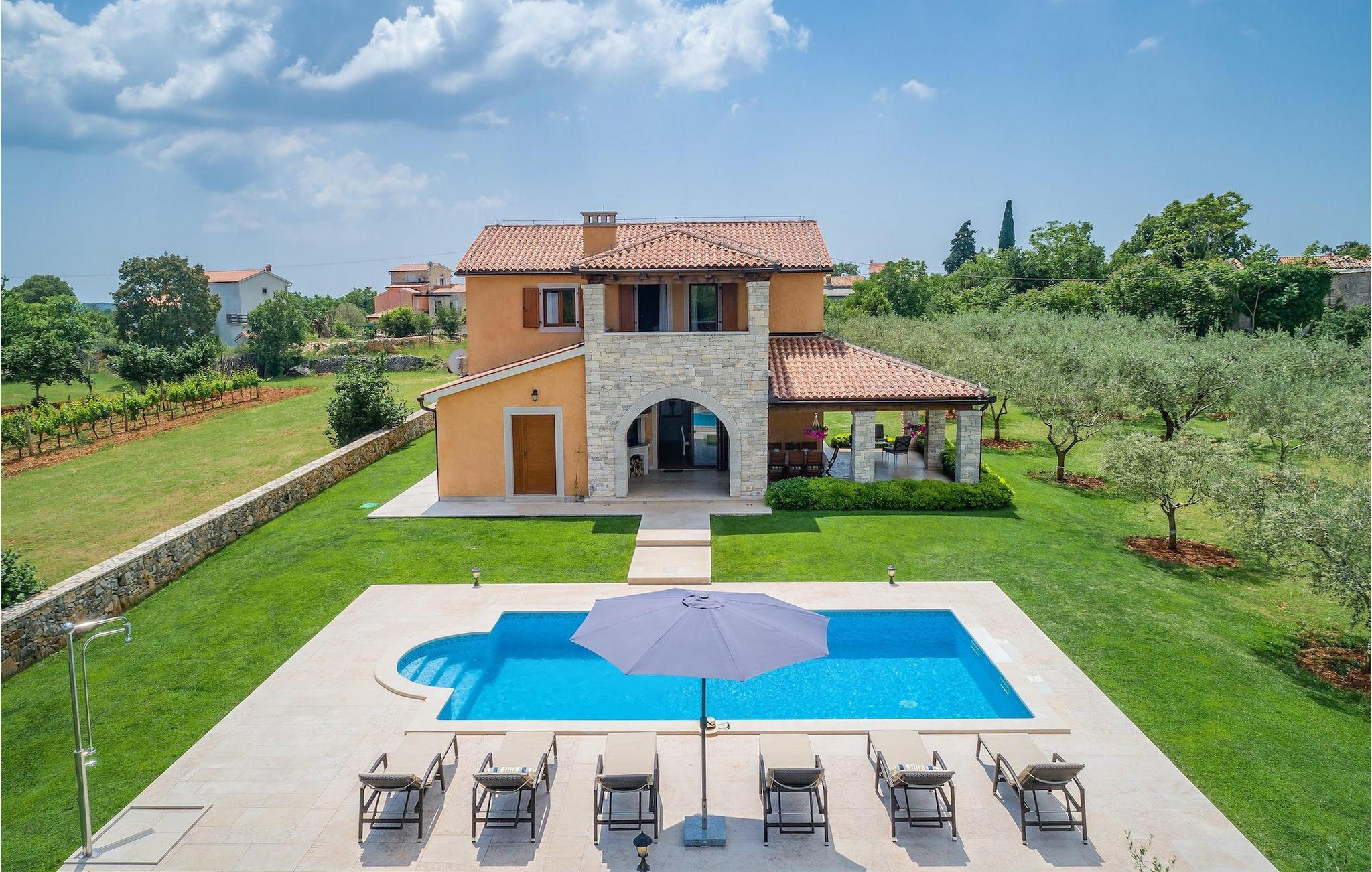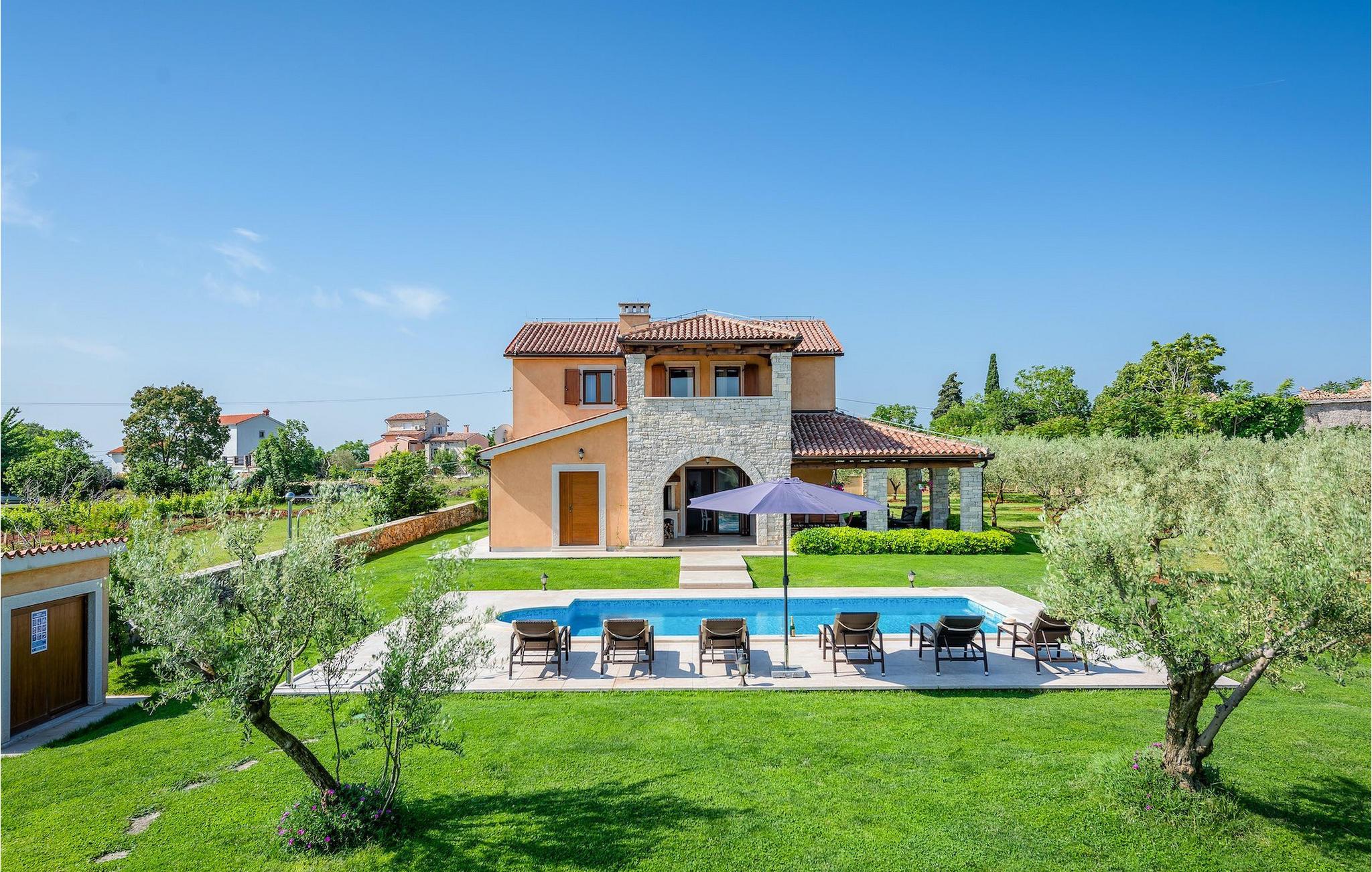 Wunderschönes Ferienhaus inmitten von Grün. Am Ende des kleinen Dorfes Filipana im Süden Istriens, einer Halbinsel am Mittelmeer. Das Ferienhaus bietet ein luxuriöses Unterkunftserlebnis mit viel Privatsphäre. Die natürlichen Baumaterialien und das Beleuchtungssystem des Haus wurden sorgsam geplant, um ein Höchstmaß an Komfort und ein angenehmes Aufenthaltserlebnis zu jeder Zeit zu bieten. Die Küche, ein WC, ein Twin-Schlafzimmer mit Badezimmer, ein Doppelschlafzimmer mit direkt zugänglichem Badezimmer, der Essbereich und das Wohnzimmer befinden sich im Erdgeschoss mit schönem Ausblick auf den Swimmingpool. In der ersten Etage befinden sich zwei Doppelschlafzimmer und zwei Badezimmer. Das Anwesen befindet sich auf einem weitläufigen Gelände mit zahlreichen Olivenbäumen, Wiesen und Wald, die für eine einzigartige Atmosphäre und vollkommene Privatsphäre für Gäste auf einem über 22 900 m2 großen Gelände sorgen. Der Bereich um den Pool herum ist mit Liegen aus natürlichen Materialien versehen. Das Ferienhaus ist ideal für Aktivitäten mit der Familie, romantische Aufenthalte und zum Entspannen.Dieses wunderschöne Ferienhaus befindet sich im kleinen Dorf Filipana im Süden der istrischen Halbinsel. Ein Urlaubsaufenthalt in diesem Ferienhaus bietet das perfekte Gleichgewicht zwischen Ruhe und privatem Genuss, abseits vom städtischen Trubel und von Touristenscharen, jedoch nicht weit von allen wichtigen Orten der Halbinsel.