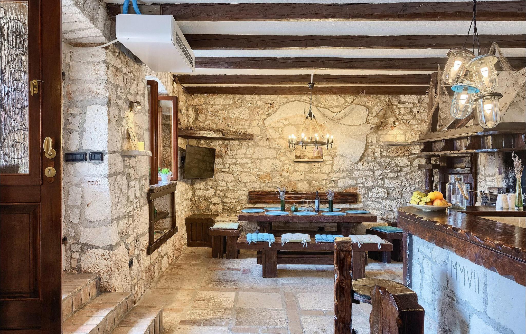 Im Erdgeschoss in der Villa befindet sich typische Konoba mit Essbereich, komplett ausgestattete Küche, Wohnzimmer mit Holzbalken und ein Badezimmer. In der oberen Etage befinden sich 3 Schlafzimmer und 2 Badezimmer. Eines der Schlafzimmer hat privates Badezimmer.