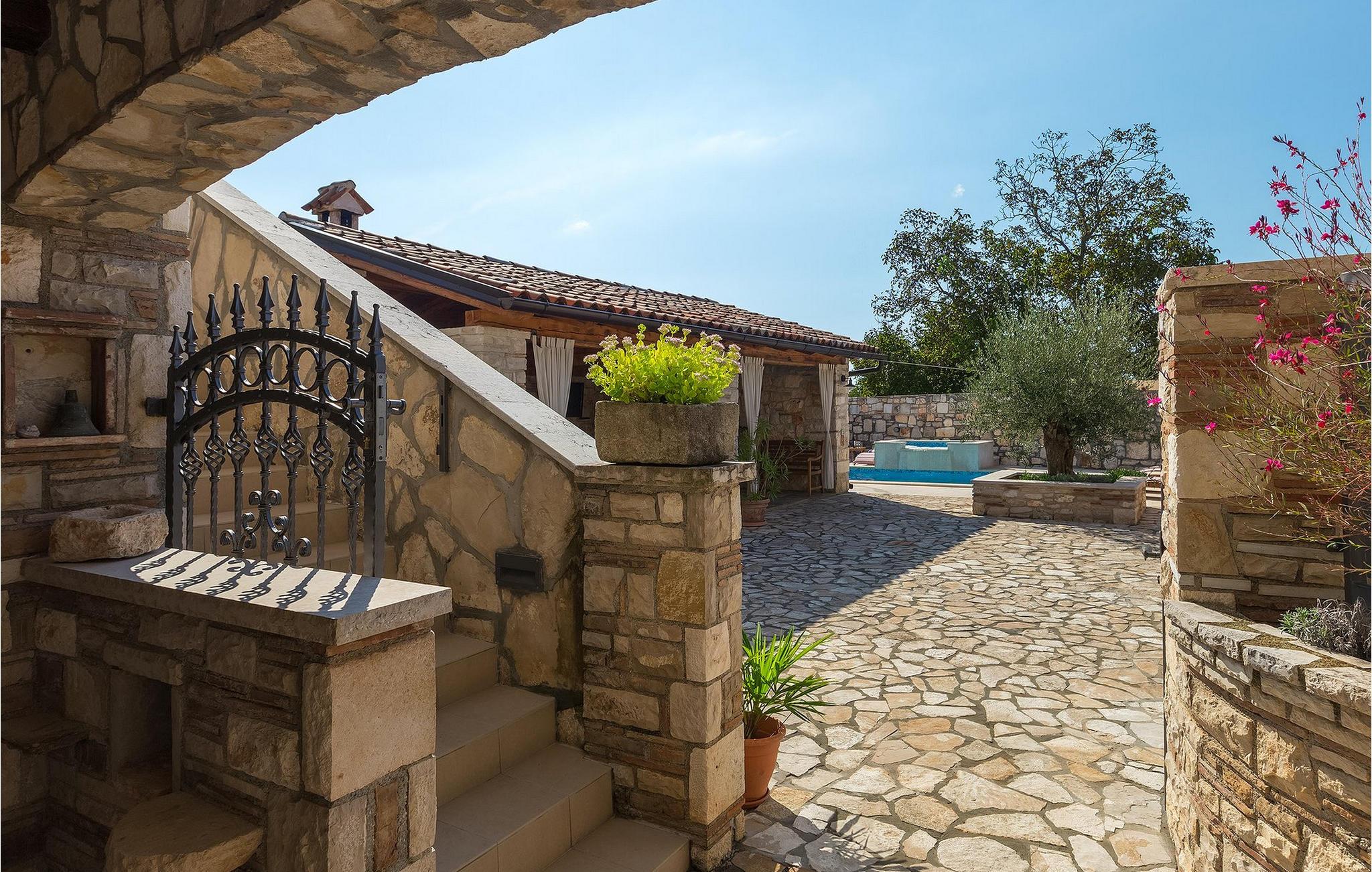 Die Villa hat einen schönen Garten mit Pool und Sprüdelbad, gemütlichen Sonnenliegen, Außenküche und Essbereich im Freien. Hier stehen Holzkohlegrill und traditioneller Holzfeuerofen zur Verfügung. Hier können Sie leckere Mahlzeiten für Ihre Familie zubereiten und sich mit istrischem Flair vertraut machen.