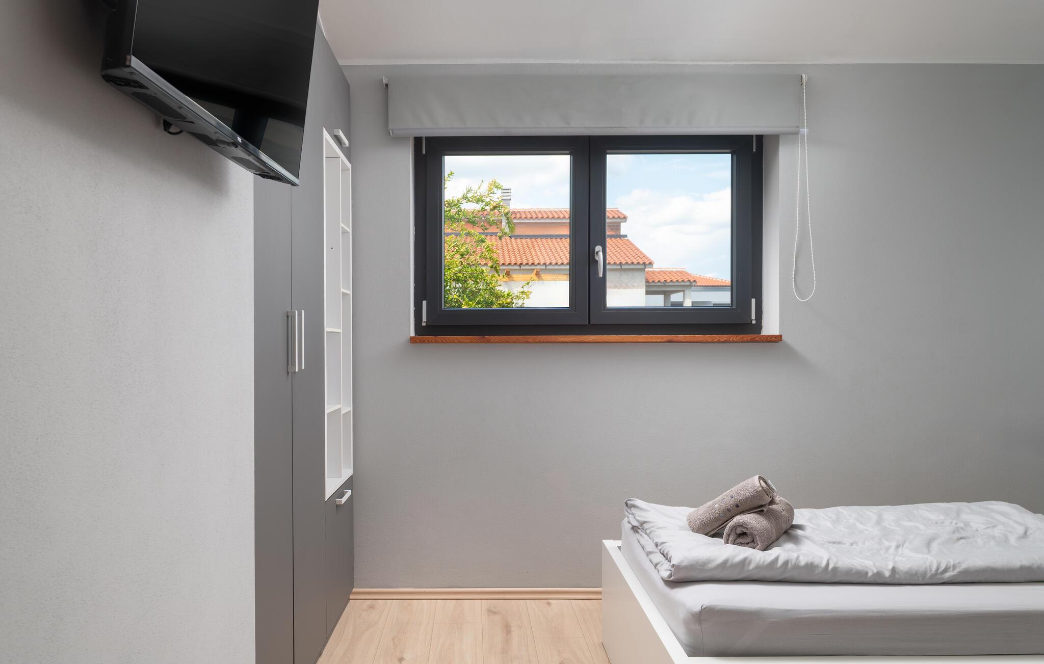Das Haus verfügt über drei klimatisierte Schlafzimmer mit jeweils eigenen Android TV. Zwei verfügen über ein Doppelbett und ein eigenes Badezimmer eines davon hat eine Panorama Schiebetüre mit Terrasse und Blick auf den Pool. Das dritte Schlafzimmer verfügt über zwei separate Einzelbetten. Im Flur befindet sich noch ein großes Bad mit Dusche WC, BD und Waschmaschine. Zwei zusätzliche Schlafmöglichkeiten befinden sich auf dem Schlafsofa im Wohnzimmer.