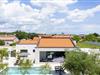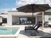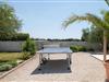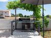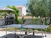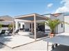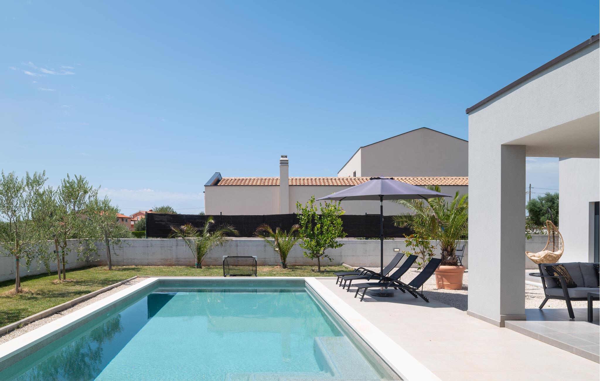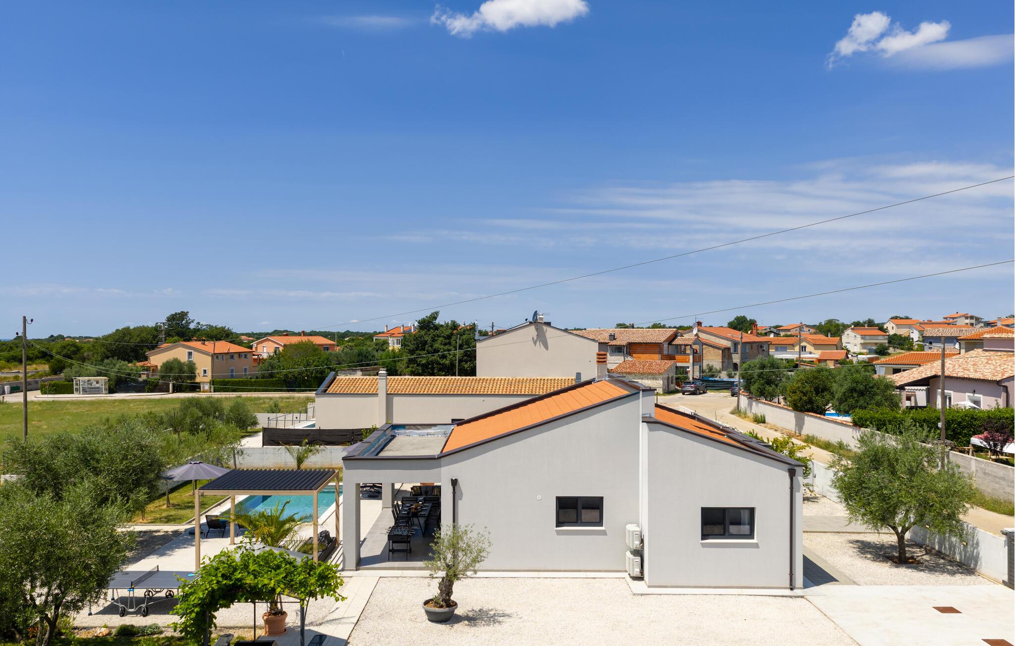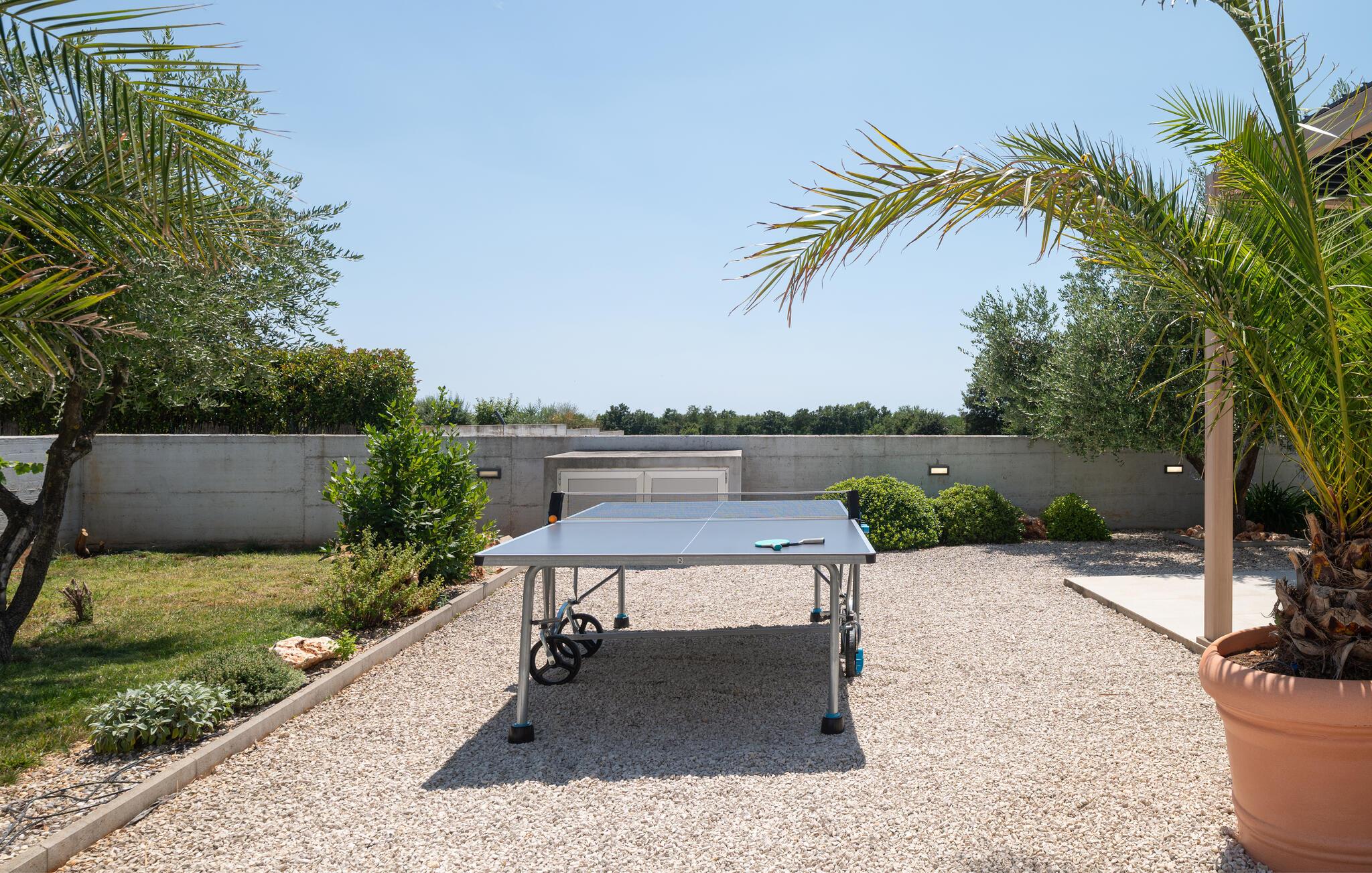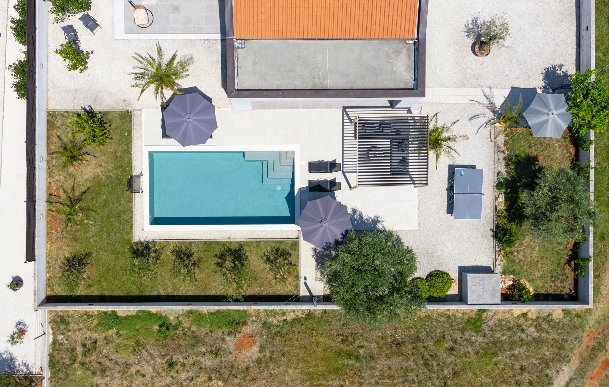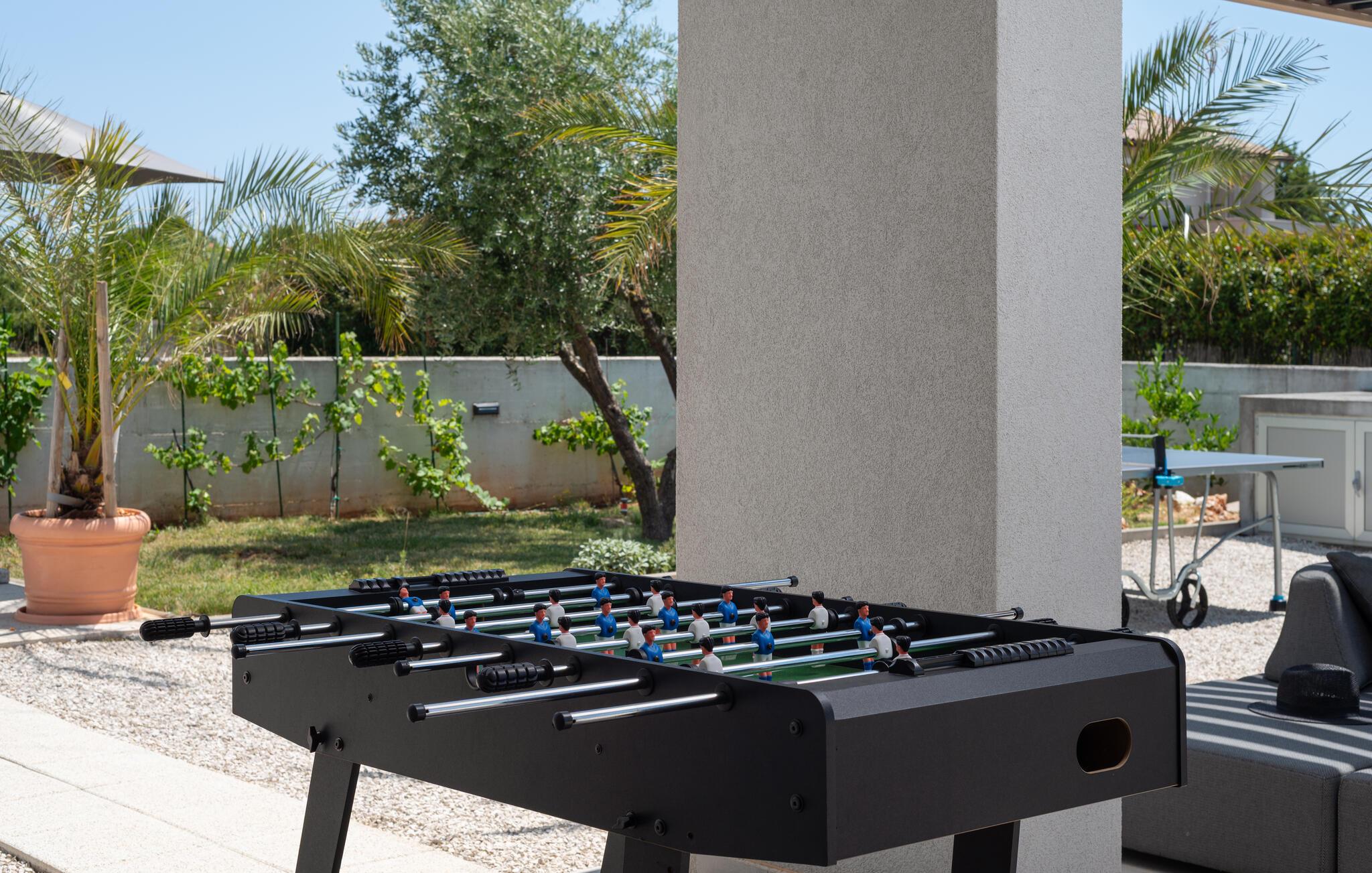 Über die riesige Panorama Schiebetüre gelangt man in den Außenbereich. Bei offener Türe verschmilzt der Raum mit der überdachten Terrasse, die einen Essplatz für 8 Personen und eine Loungeecke hat, wo man den wunderschönen Sonnenuntergang bei einem Glas Wein genießt, oder sich am Pool entspannt. Im ummauerten Garten befinden sich drei Parkplätze, Pool mit Außendusche, ein Gasgrill und diverse Spiele wie Fussball Kicker, Botscha, Federball, Kegel, zwei Wasserballtore, Karten und Brettspiele sind auch vorhanden.
