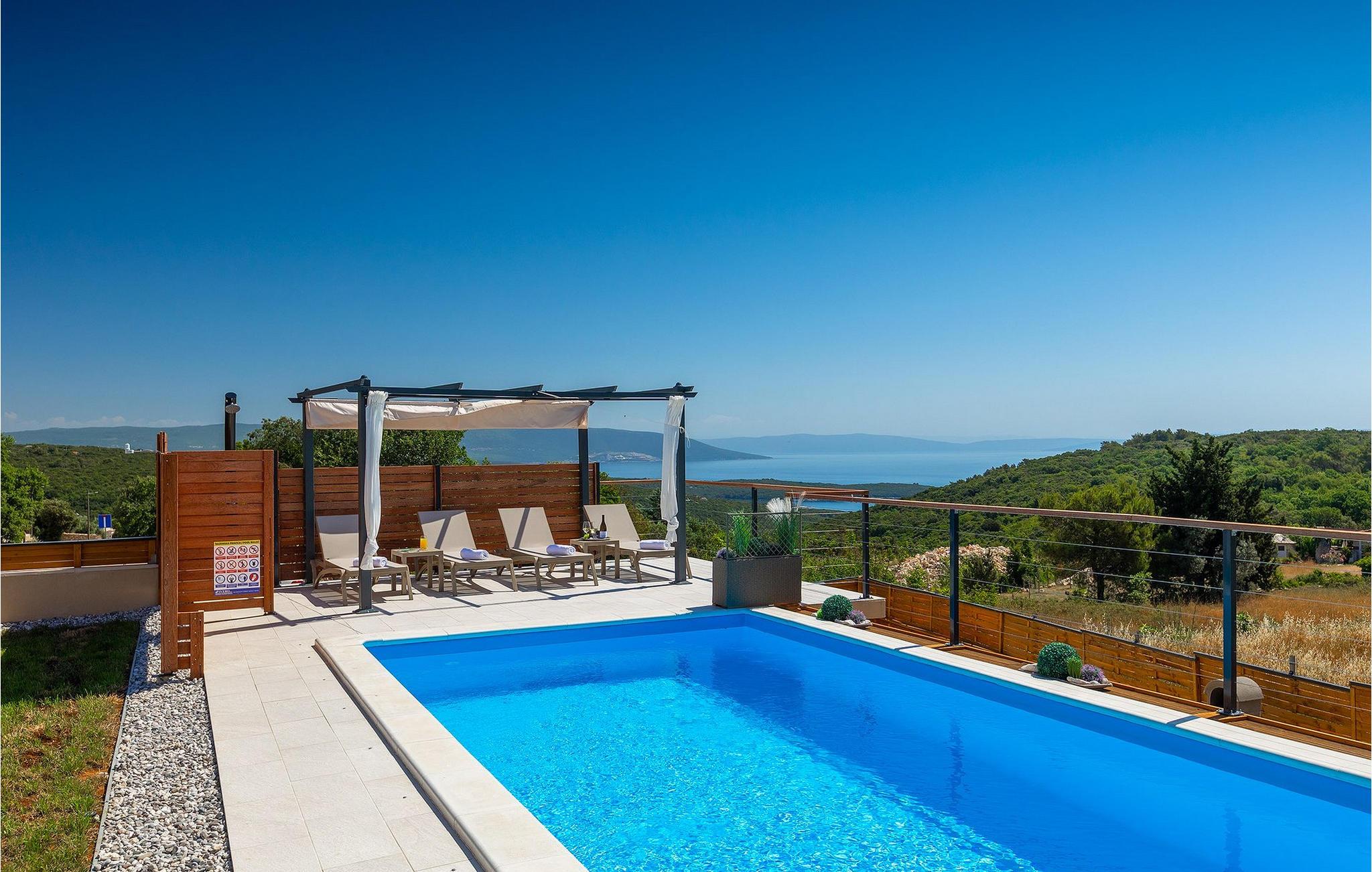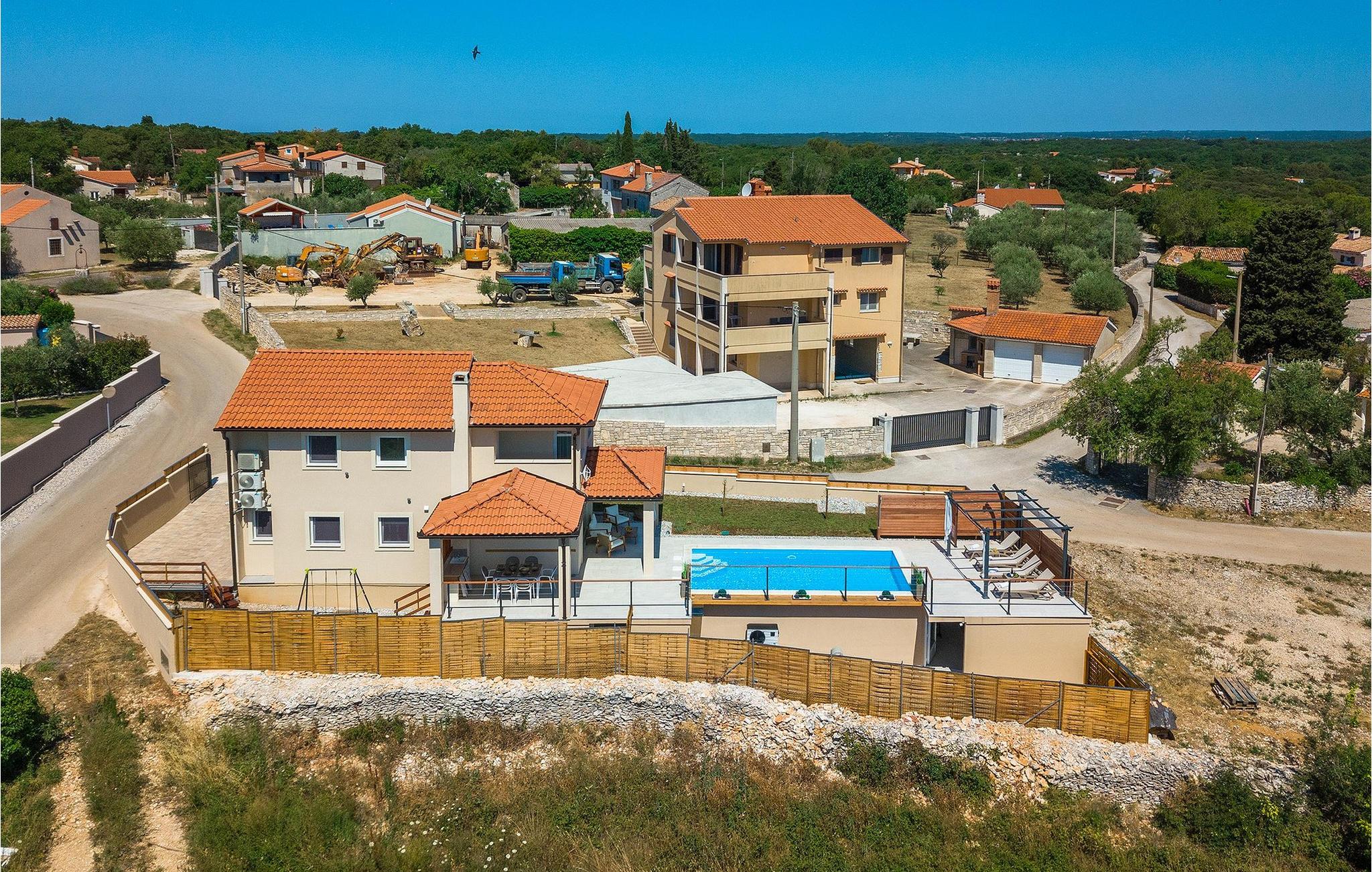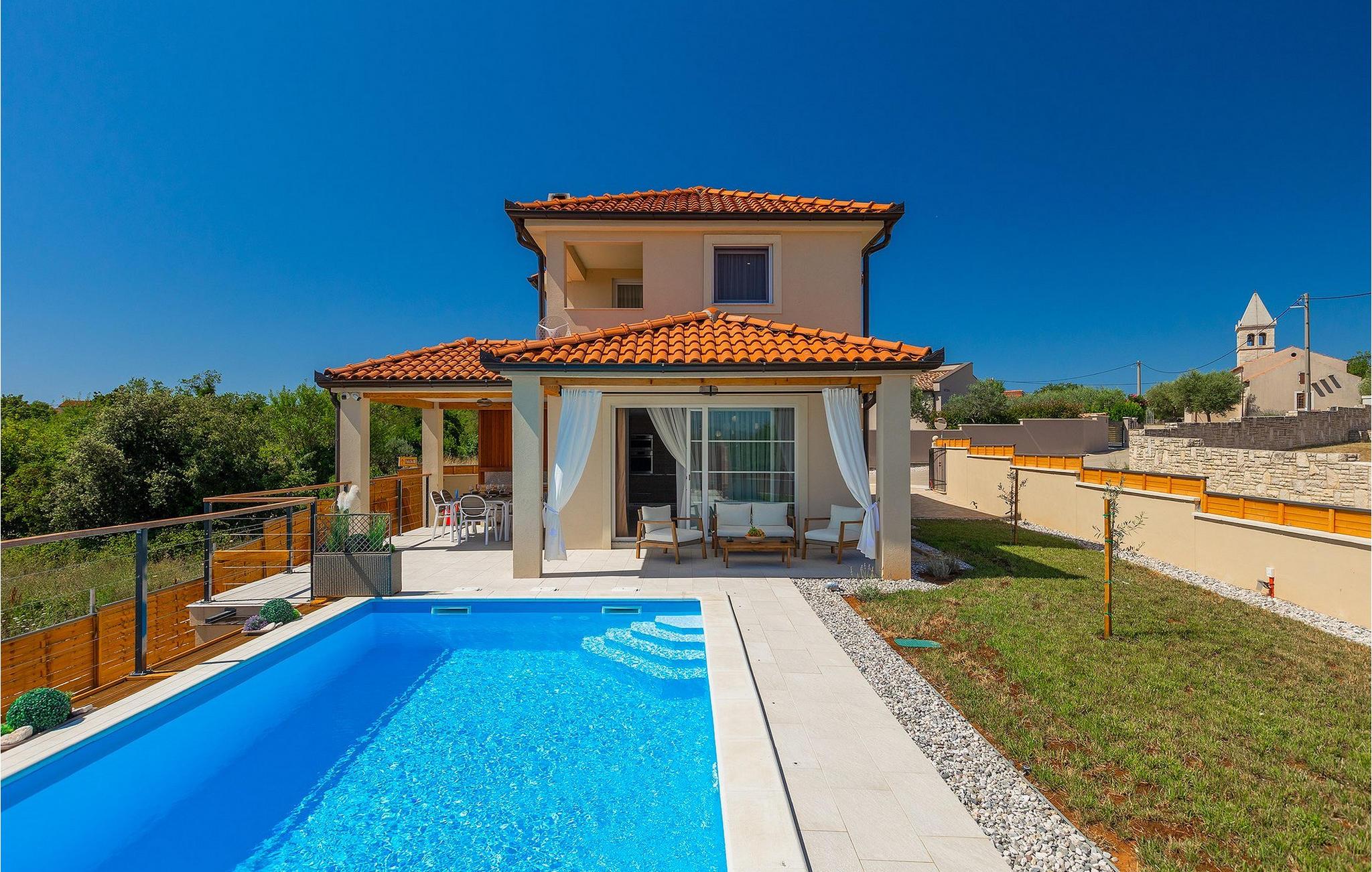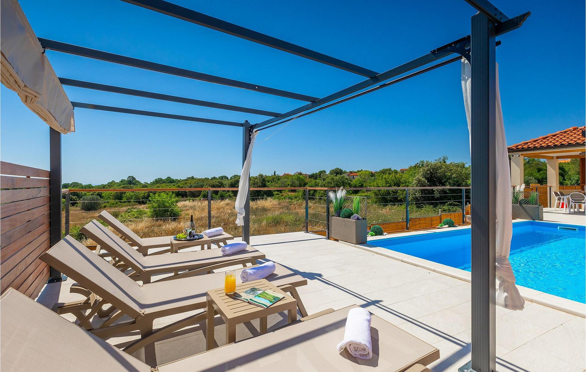 Die schöne Villa Veduta befindet sich im westlichen Teil von Istrien und ist ein ideales Haus für bis zu 6 Gäste. Die Villa besteht aus einem Innen- und einem umzäunten Außenbereich, einem privaten Pool und einer Terrasse mit herrlichem Blick auf die Küste und Natur. Genießen Sie die einzigartige Aussicht von der Terrasse aus, entfliehen Sie der Sommerhitze im privaten Pool oder genießen Sie einfach ein kühles Getränk, während Sie die Sonnenstrahlen auf den Liegestühlen fangen. Diese Villa bietet einen Grill wo sie Speisen vorbereiten können, eine Entspannungsecke im Schatten und einen Spielplatz mit Schaukel und Rutsche für Kinderspiele. Von der Terrasse aus hat man direkten Zugang zum Innenbereich, der aus einem geräumigen Wohnzimmer, einer voll ausgestatteten Küche und einem Esszimmer sowie einem Badezimmer besteht. Die Treppe führt in den ersten Stock des Hauses, wo sich 2 moderne Schlafzimmer mit Doppelbett und eigenem Badezimmer befinden, die klimatisiert sind und einen TV verfügen. Ein Freizeitraum mit Billard und Pikado sorgt für Spaß und Unterhaltung im Kreise Ihrer Liebsten. Buchen Sie die Villa Veduta und sorgen Sie für einen sorgenfreien Urlaub!Die Villa Veduta befindet sich in einer ruhigen Lage, aber in der Nähe der größeren Städten in dieser Region: Pula, Labin und Rabac. Pula ist die größte Stadt in Istrien und bietet eine große Auswahl von Bars, Restaurants und Sehenswürdigkeiten. Ein Besuch des berühmten Amphitheaters aus dem 1. Jahrhundert ist eine unvergessliche Erfahrung. Es befindet sich im Stadtzentrum und wir empfehlen eine Besichtigung, um mehr über das imposante Gebäude von großem historischen Wert zu erfahren. Hier finden zahlreiche Veranstaltungen statt, z. B. Konzerte, Filmvorführungen und Sportereignisse. Die Umgebung bietet zahlreiche Möglichkeiten zur Freizeitgestaltung: Radfahren, Reiten, Joggen, Wandern und vieles mehr. Naturliebhabern empfehlen wir einen Ausflug in den nahe gelegenen Nationalpark Brijuni oder zum Kap Kamenjak, wo Sie unberührte Naturschönheiten und natürliche Besonderheiten genießen können. Nicht weit entfernt liegen Labin und Rabac, die für ihre schönen Kieselstrände mit kristallklarem Meer bekannt sind. Machen Sie einen Spaziergang entlang der Küste und probieren Sie istrische Spezialitäten wie Nudeln mit Trüffeln oder Prosciutto, natürlich mit einem Glas des berühmten istrischen Malvasia. Diese mittelalterlichen Städte sind bekannt als die Stadt der Künstler, so dass Kunstliebhaber die Ateliers und Galerien mit Kunstwerken in den Steinstraßen besuchen können.