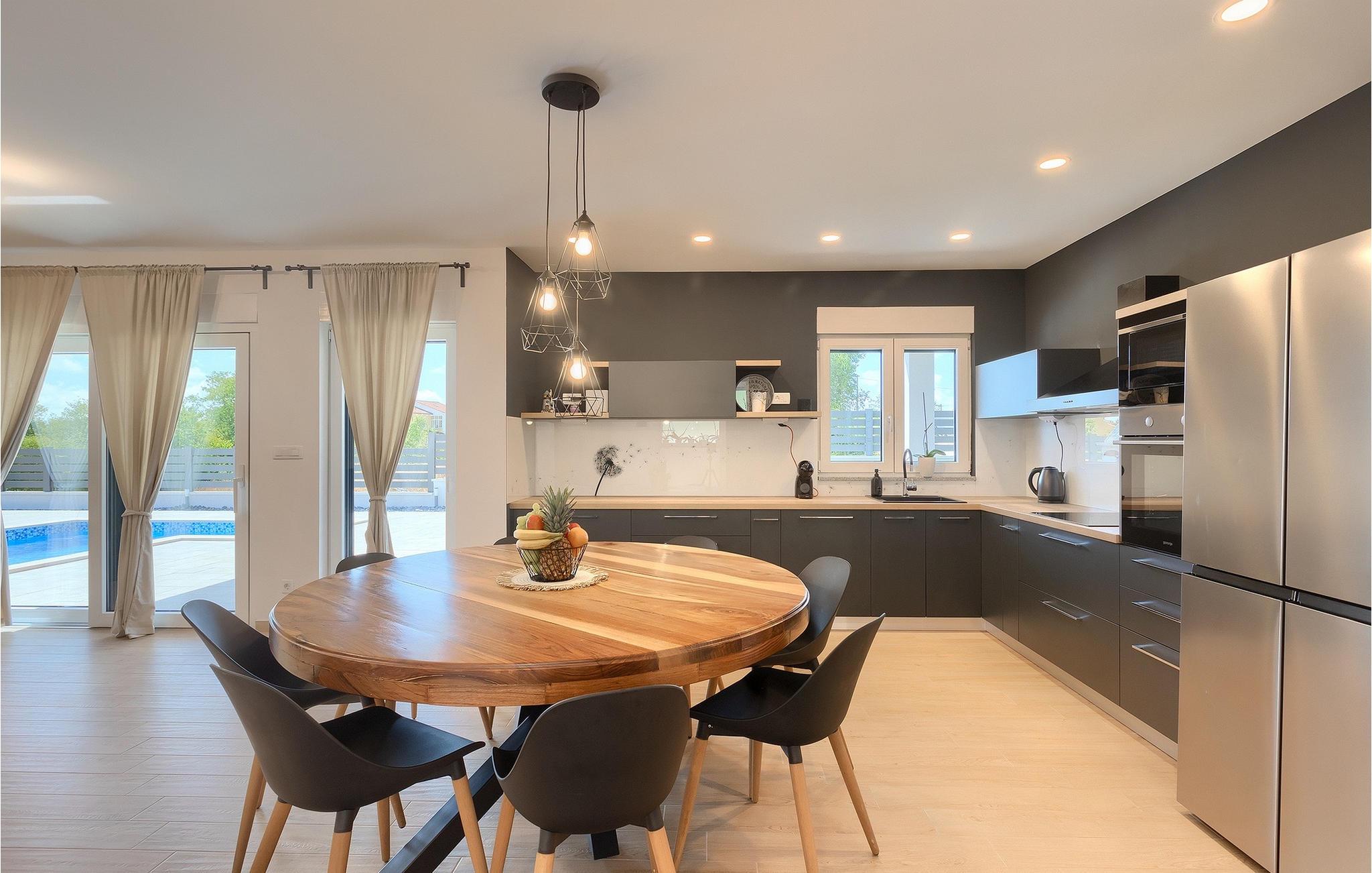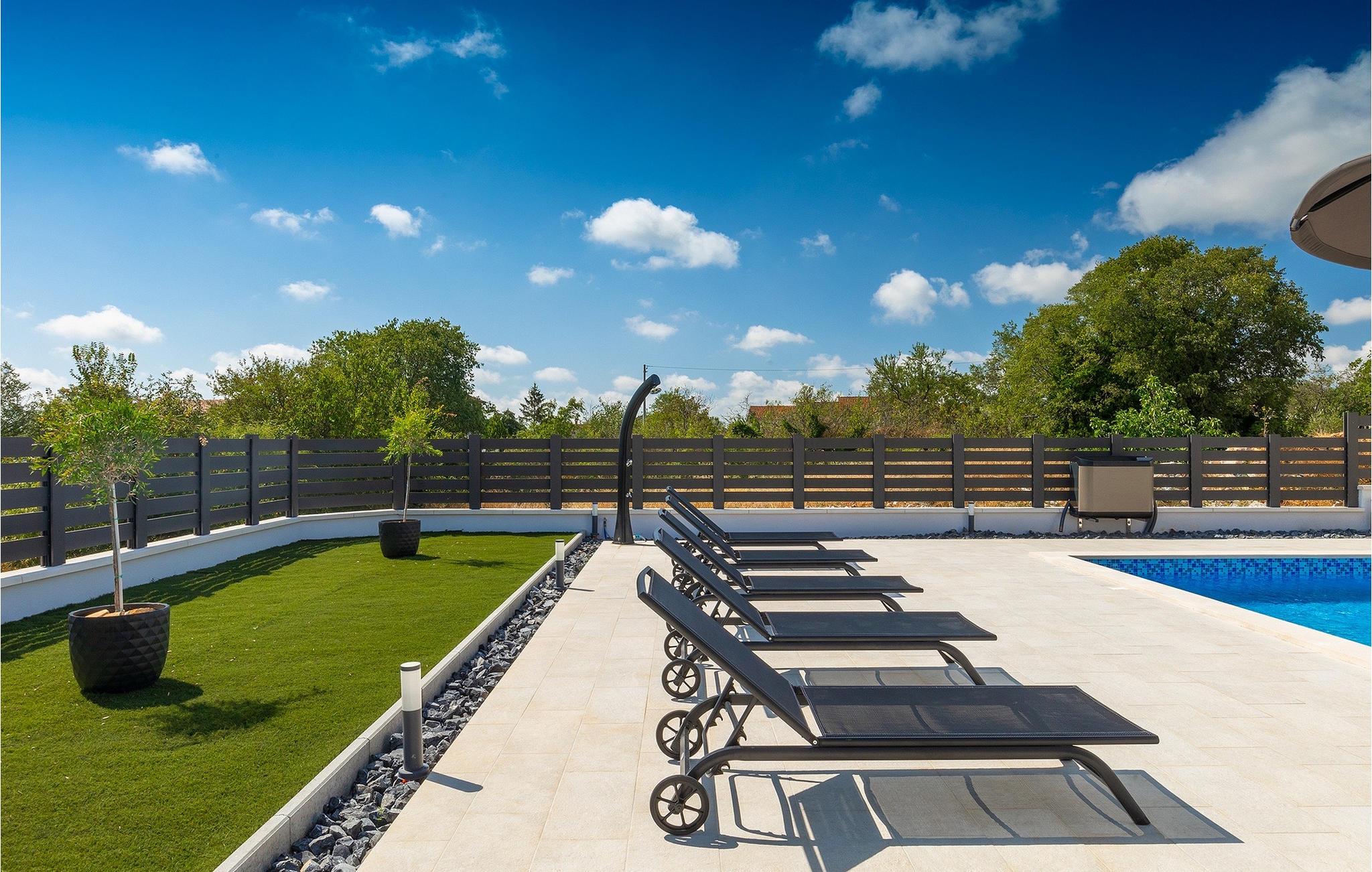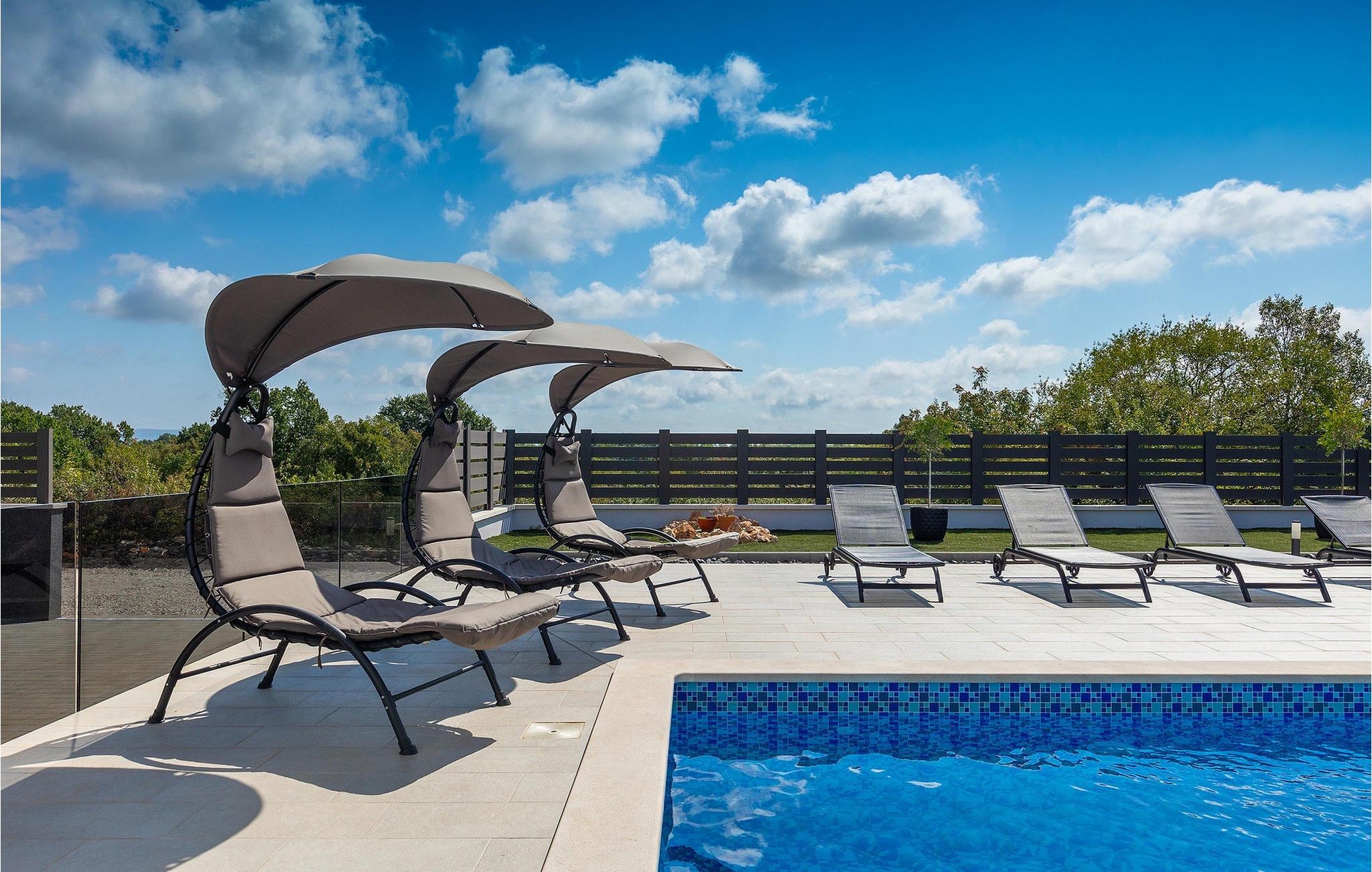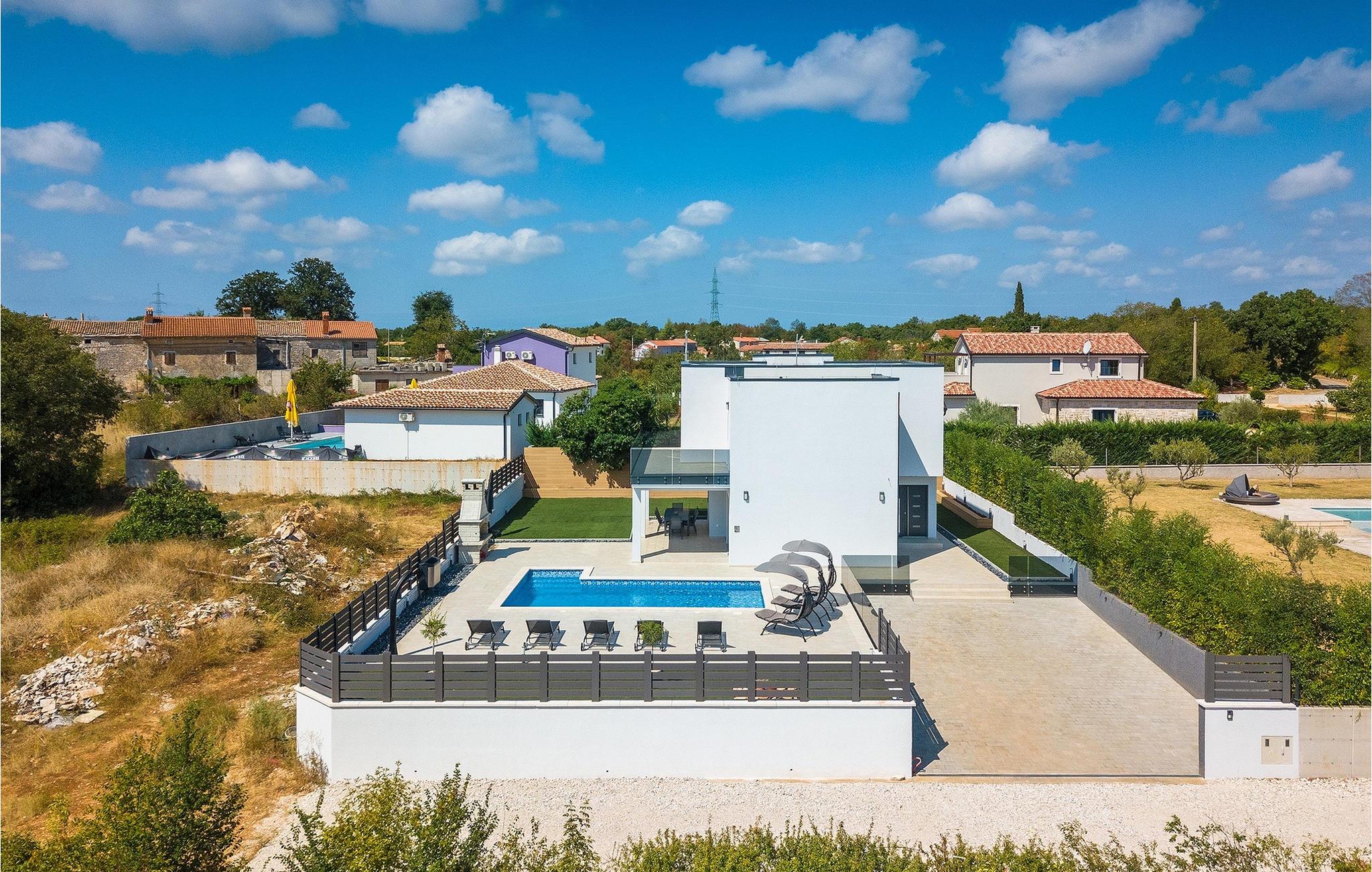Die Villa LuMaLu lädt Sie mit ihrer modernen Einrichtung, dem schönen Garten und dem privaten Pool zu einem Traumurlaub ein. Der Außenbereich der Villa besteht aus: einem privaten Pool, in dem Sie sich von der Sommerhitze erfrischen können, Liegestühlen am Pool, einer überdachten Terrasse mit einem Außentisch, der ideal ist, um einen Morgenkaffee zu trinken, während Sie den herrlichen Blick auf den Pool und die Natur, welche die Villa umgibt, genießen. Für die Liebhaber des Kochens gibt es auch einen Kohlegrill im Außenbereich, der Sie dazu einlädt, sich an der Zubereitung traditioneller istrischer Gerichte zu versuchen. Für Spaß und Erholung bietet diese Villa eine Reihe von Möglichkeiten: Badminton, Tischtennis oder Tischfußball. Vom Außenbereich der Villa gelangen Sie über die Terrasse in das Innere des Hauses, wo sich im Erdgeschoss ein modernes Wohnzimmer, eine voll ausgestattete Küche mit Esszimmer und ein badezimmer befinden. Die Treppe führt in den 1. Stock der Villa, wo sich 4 komfortable Schlafzimmer, einige mit Zugang zu einem Balkon mit einzigartigem Blick auf die Landschaft und den Pool, und 2 Bäder befinden. Buchen Sie die Villa LuMaLu und genießen Sie einen unvergesslichen Urlaub in Istrien mit Ihren Liebsten!