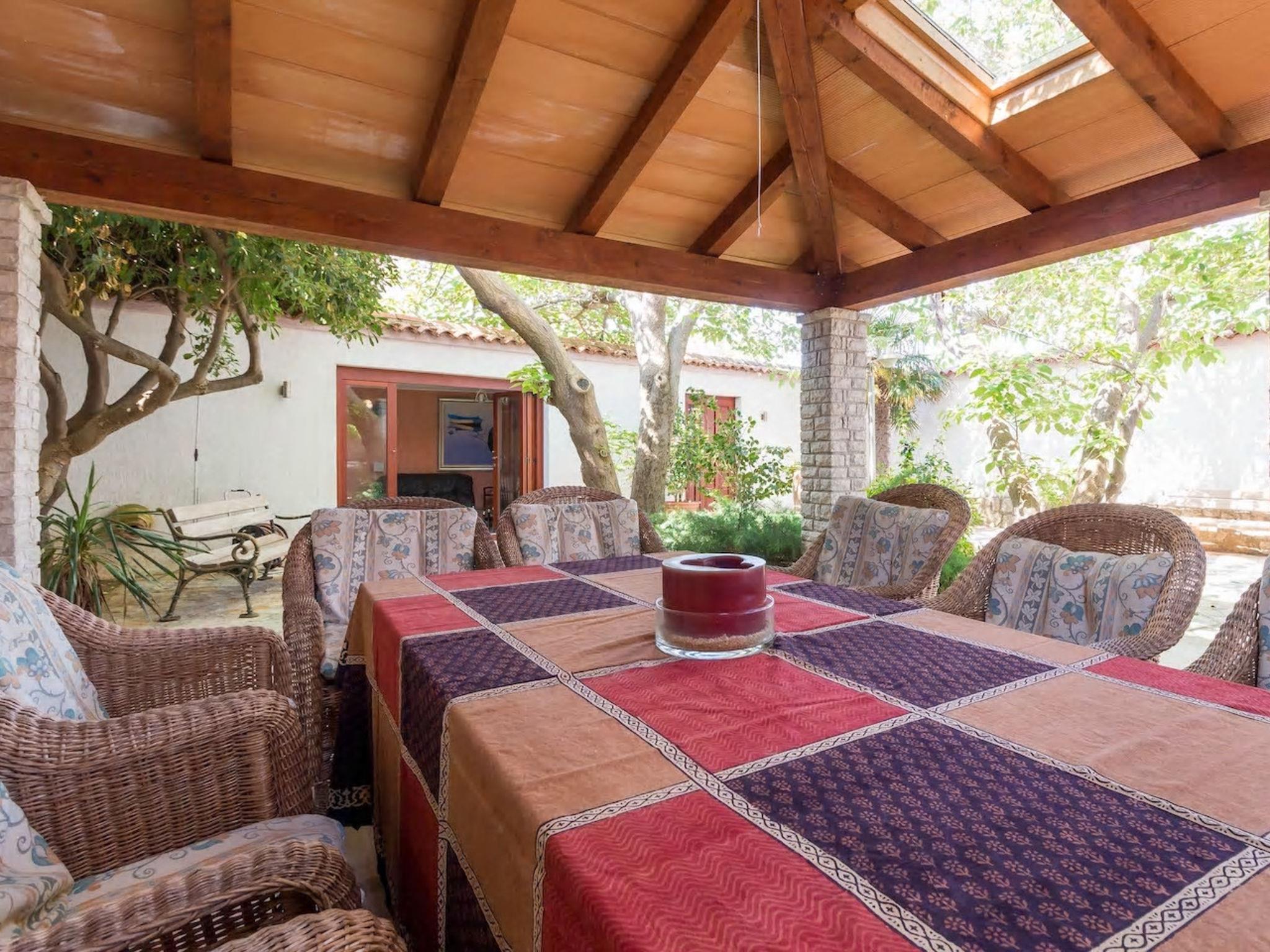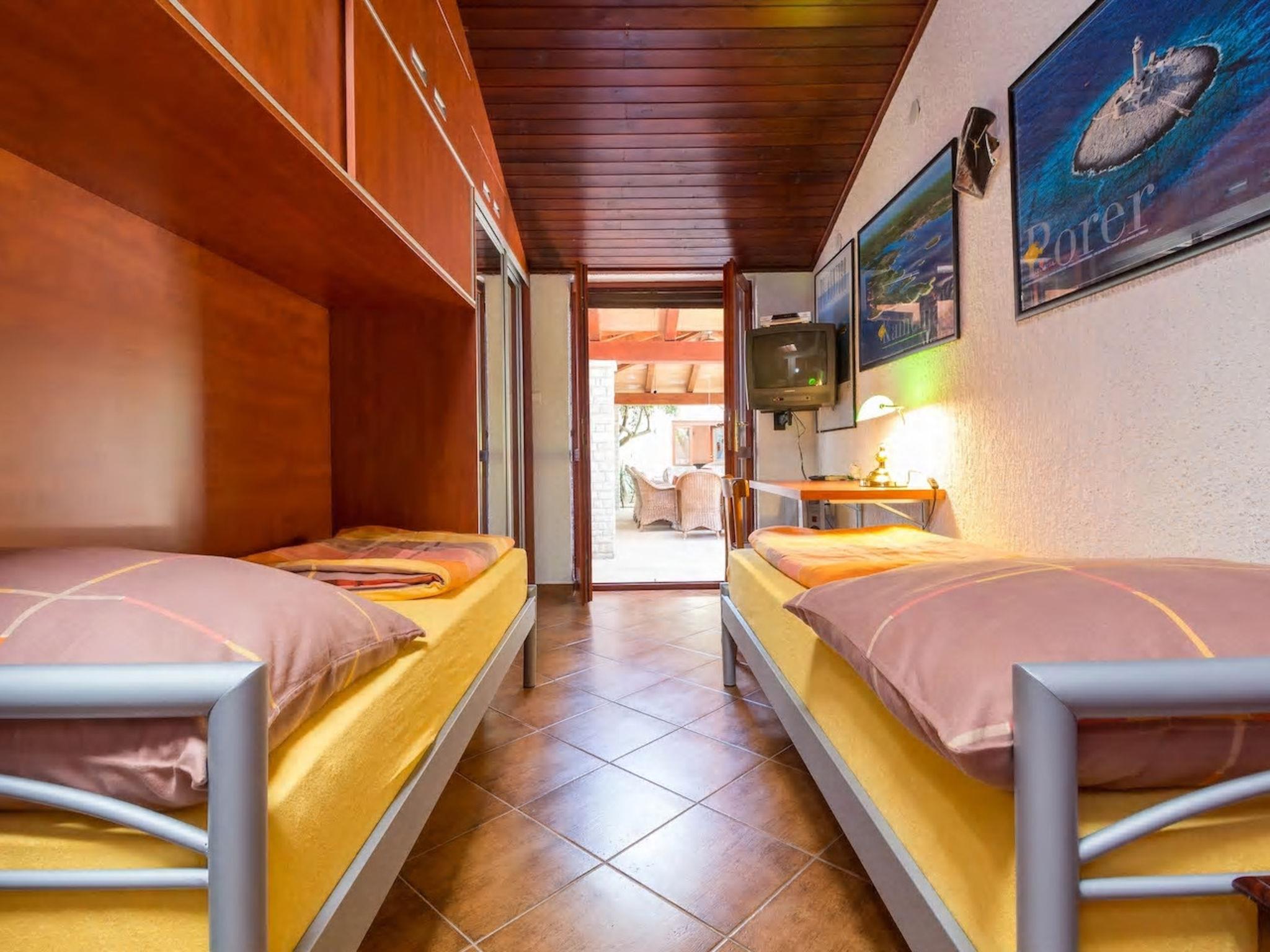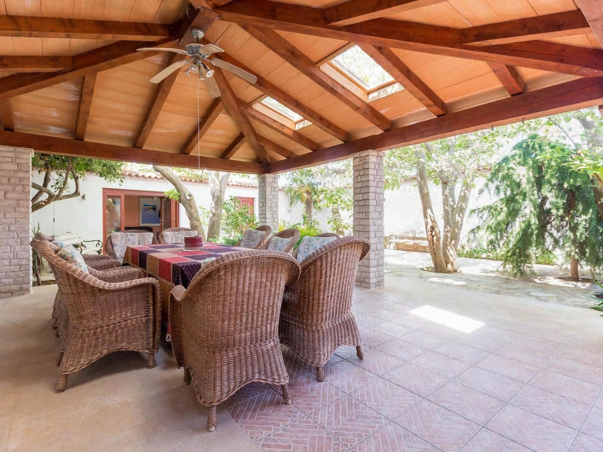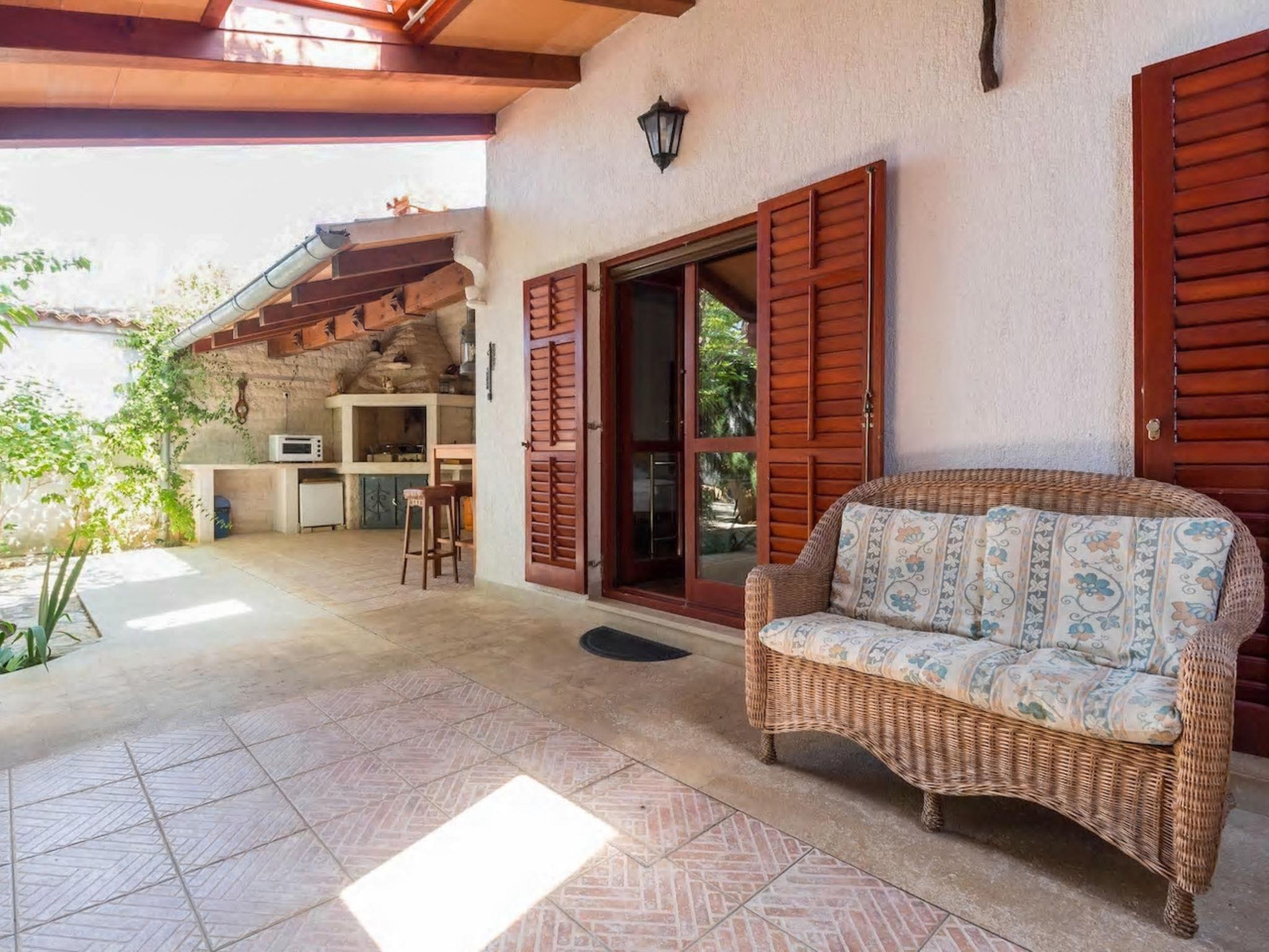 3-Zimmer-Haus 90 m2, im Erdgeschoss. Eingang mit Klimaanlage. 1 Zimmer 12 m2 mit 1 franz. Bett (160 cm, Länge 200 cm), Sat-TV. 1 Zimmer 10 m2 mit 2 Betten (90 cm, Länge 200 cm). Kochnische (2 Glaskeramikplatten, Wasserkocher, Tiefkühler, elektrische Kaffeemaschine). Dusche/WC. Keine Heizmöglichkeit. Terrasse 50 m2, überdacht. Terrassenmöbel, Liegestühle (4). Außenküche (2 Gaskochfelder, Kühlschrank, Gefrierschrank).
