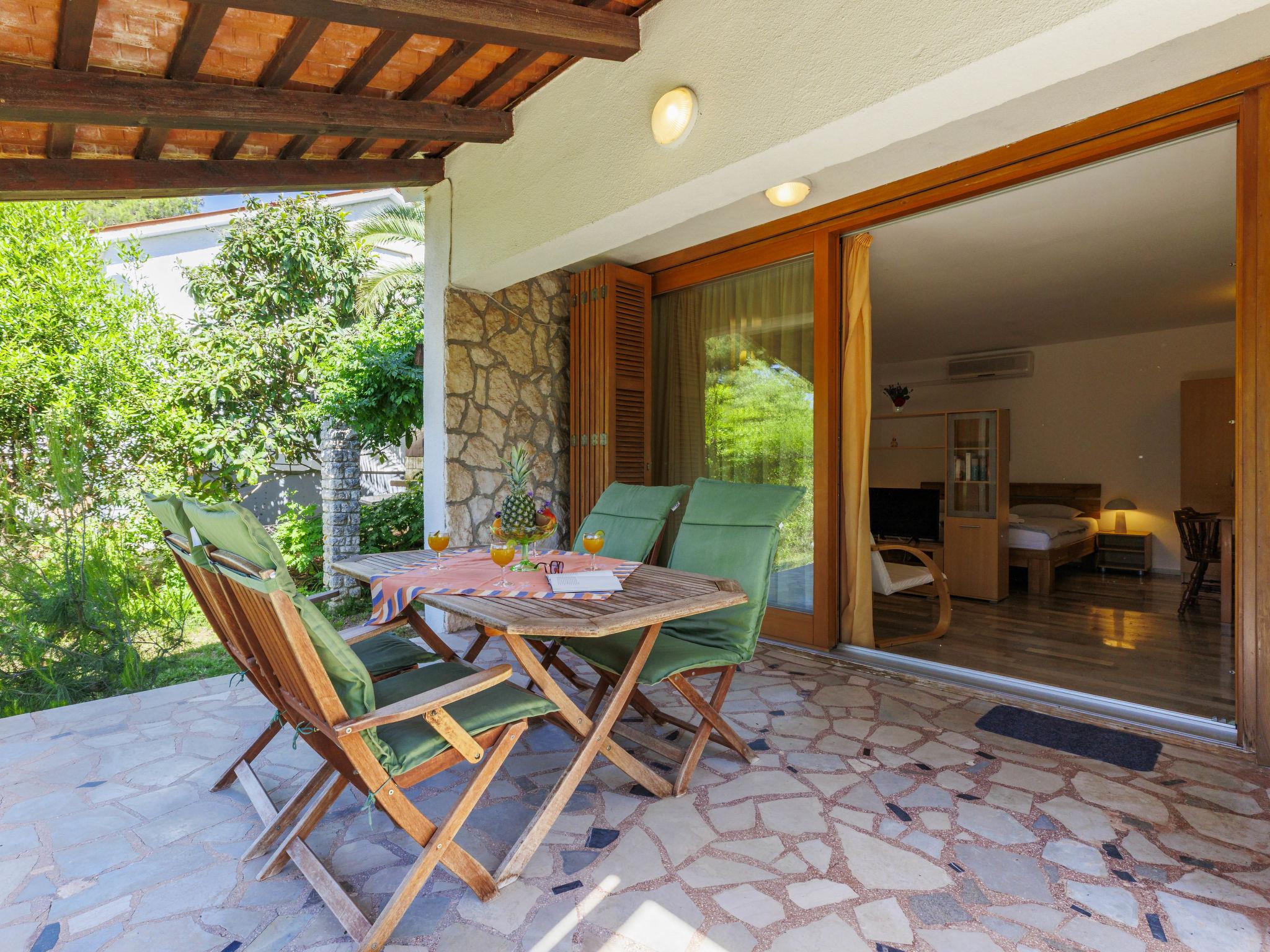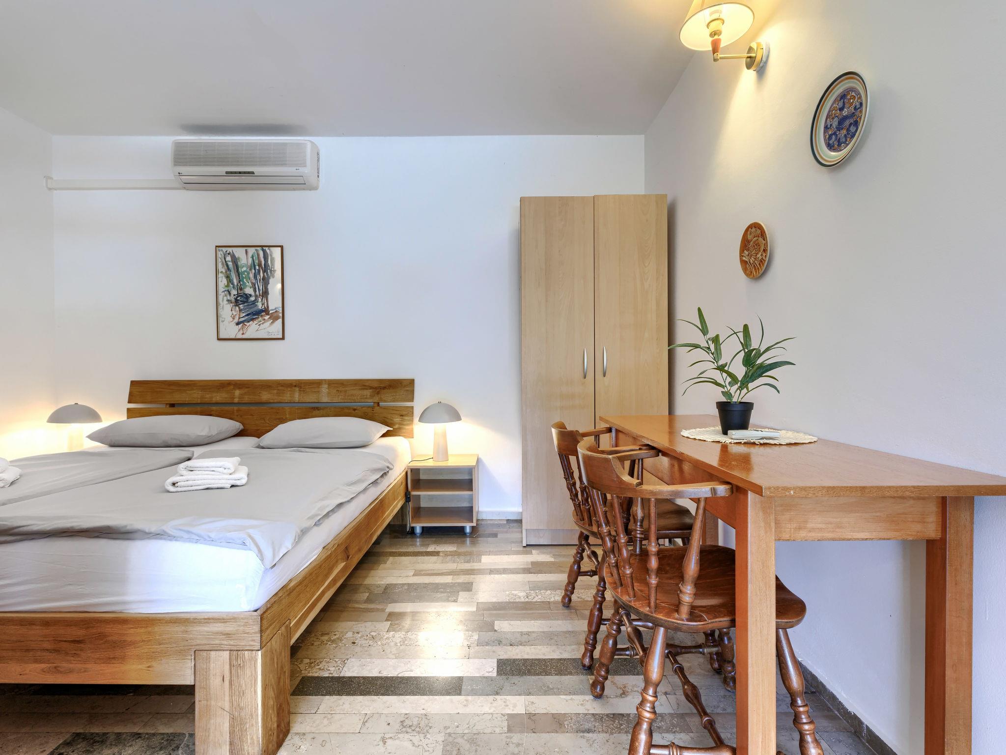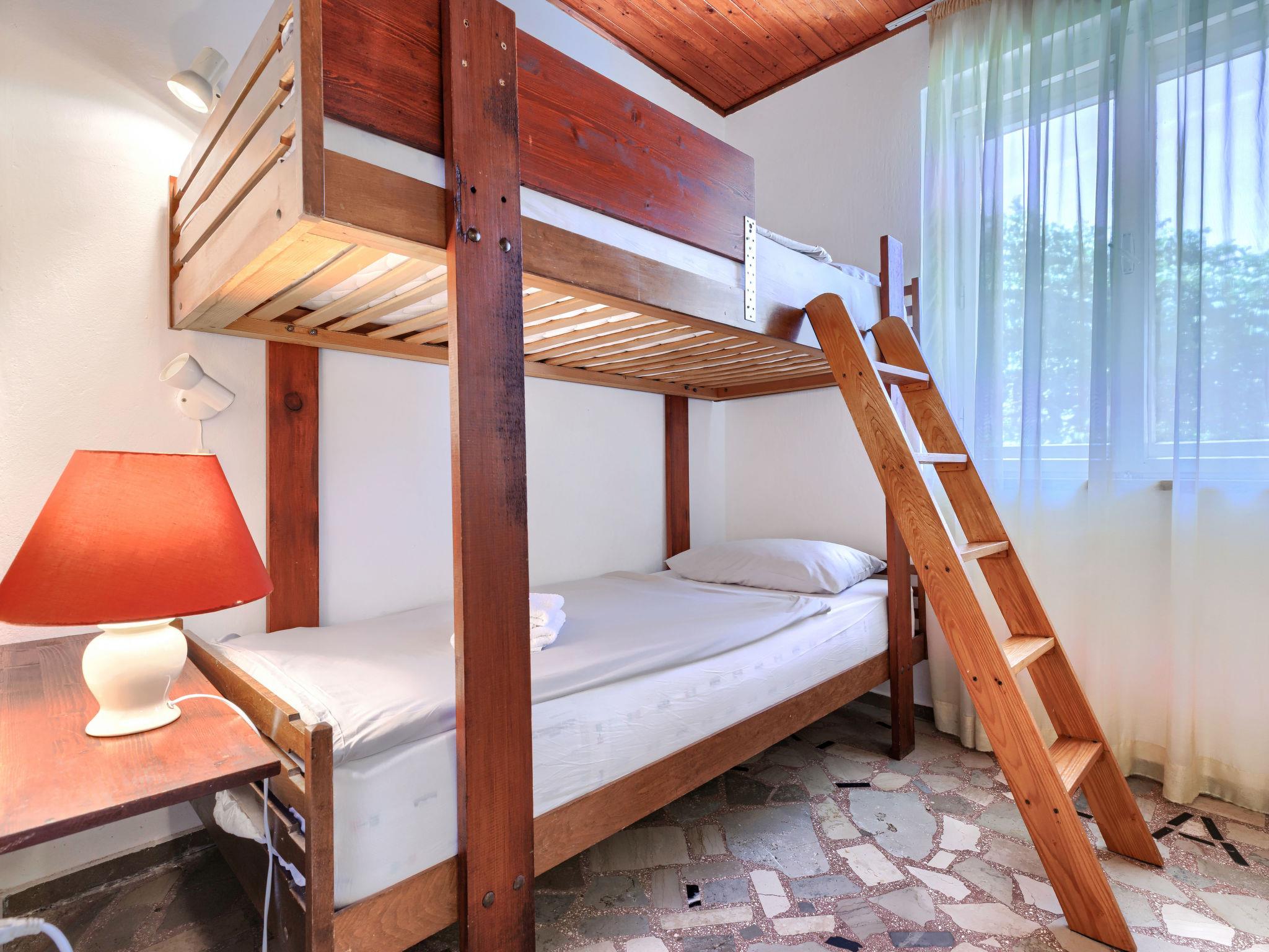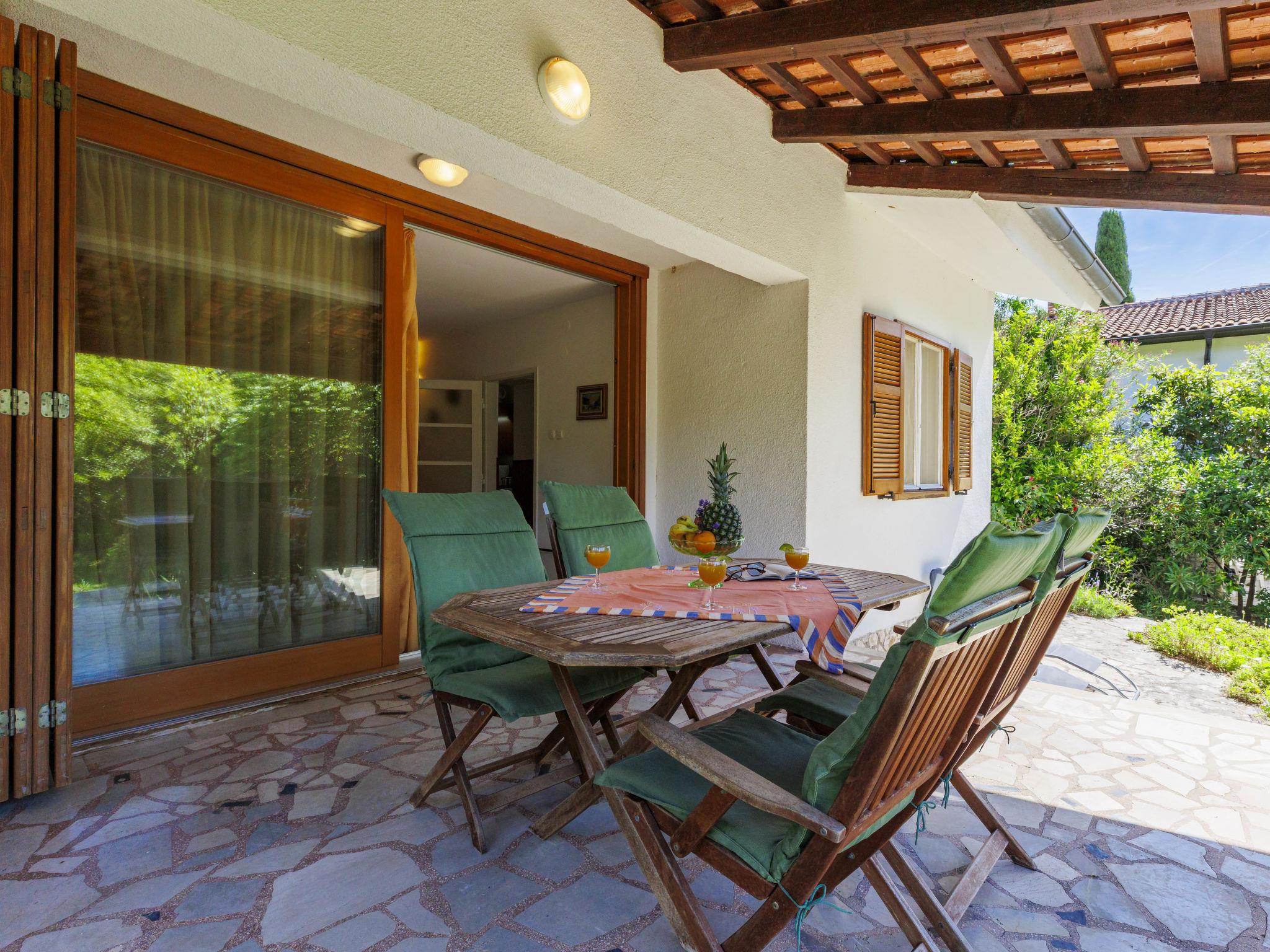 2-Zimmer-Haus 52 m2. Wohn-/Schlafzimmer mit 1 Doppelbett, Esstisch, TV und Klimaanlage. Ausgang zur Terrasse. 1 Zimmer mit 1 x 2 Etagenbetten. Kleine Küche (4 Kochplatten, Backofen, Toaster, Wasserkocher, Tiefkühler, elektrische Kaffeemaschine). Dusche/WC. E-Heizung, Klimaanlage (extra). Terrasse 16 m2, überdacht. Terrassenmöbel. Zur Verfügung: Safe. Internet (WLAN, gratis). Bitte beachten: Nichtraucher-Haus.