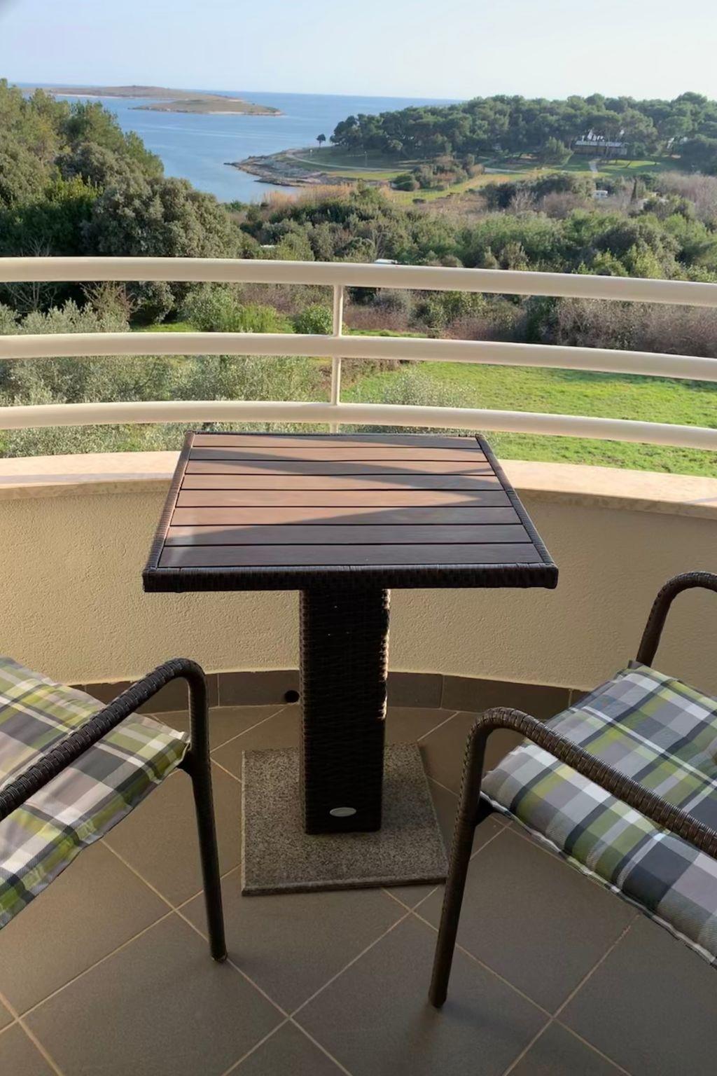 Über den Flur gelangt man zum Badezimmer mit Regendusche, WC, Waschbecken und Waschmaschine. Das Wohnzimmer mit dem wohl schönsten Ausblick in Premantura umfasst eine voll eingerichtete Küche mit großer Kühlschrank- Gefrierfachkombination, Herd, Cerankochfeld, Toaster, Mikrowelle etc. Im Wohnzimmer befindet sich neben der modernen Essecke auch eine Ausziehcouch (140cm). Da im Zuge der Adaptierung der Dachboden ausgebaut wurde gibt es sehr hohe Decken und ein tolles Raumgefühl. Auf dem Atrium welches über eine Treppe erreichbar ist, sind 2 weitere Einzelbetten verfügbar, die für Kinder gut geeignet sind (80x200). Das Wohnzimmer ist mit einem FlatscreenTV, Wifi, Klimaanlage (welche die ganze Wohnung kühlt/heizt) und Radio/CD/USB ausgestattet. Vom Wohnzimmer erreicht man den überdachten und geschützten Balkon auf dem man die Morgensonne, das Meeresrauschen und den herrlichen Blick genießen kann.