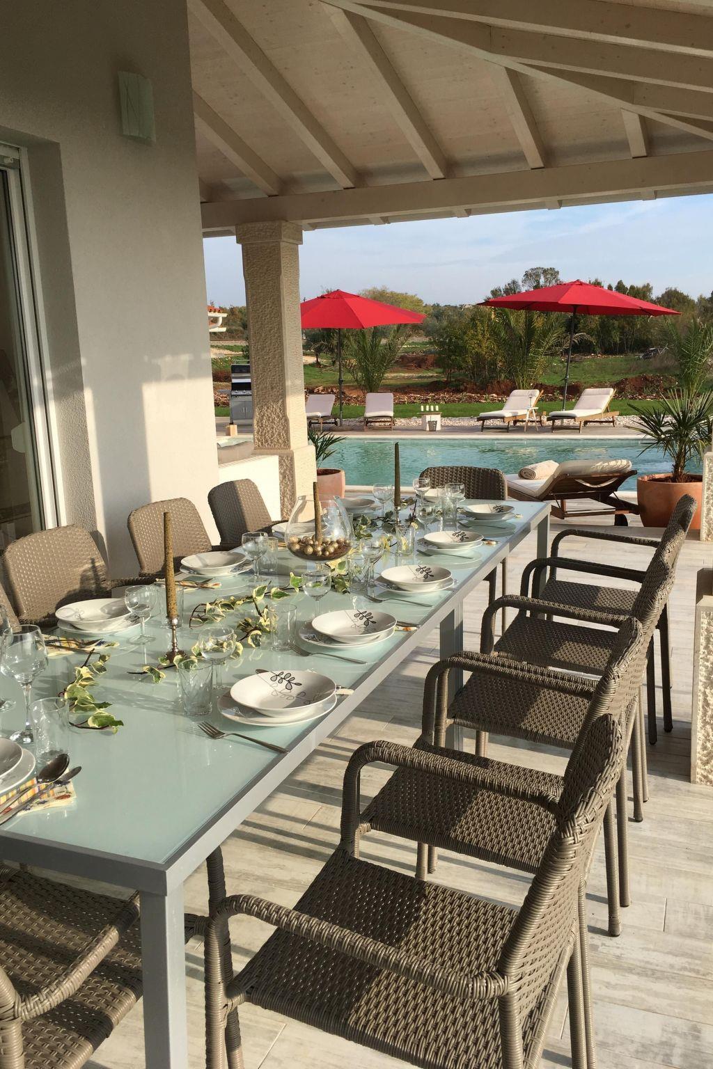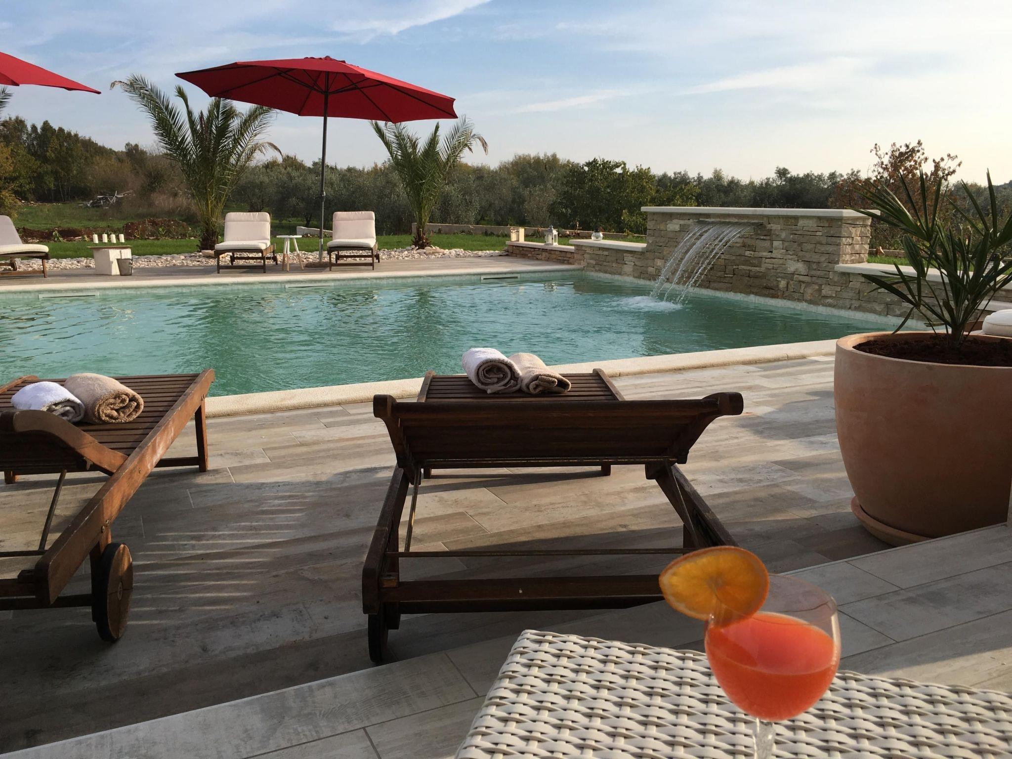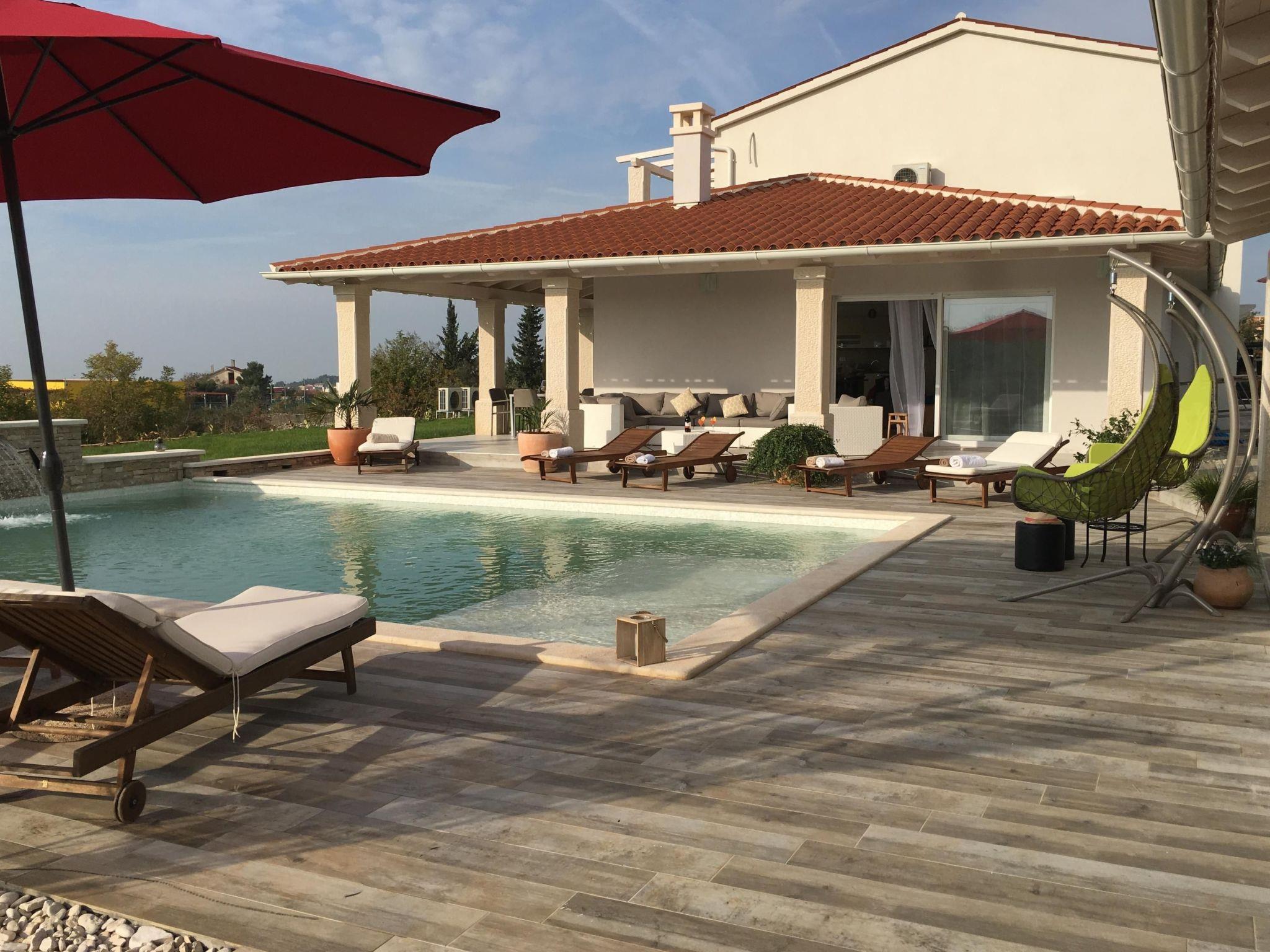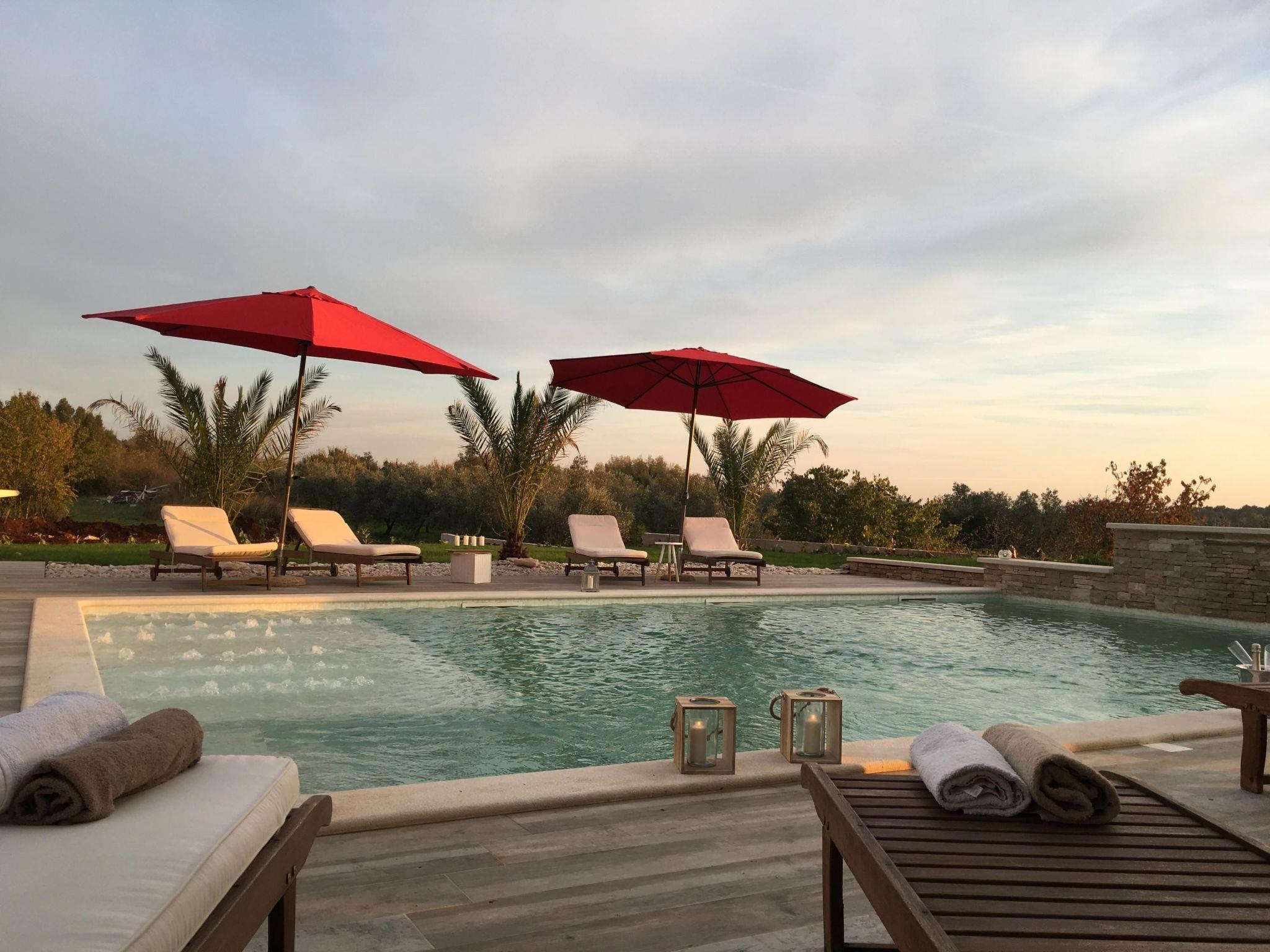 Diese zauberhafte, weiße Villa liegt in Vodjnan, an der Südspitze der istrischen Halbinsel, in der Nähe von Pula und bietet Ausblick auf das Meer und die Brioni Inseln.