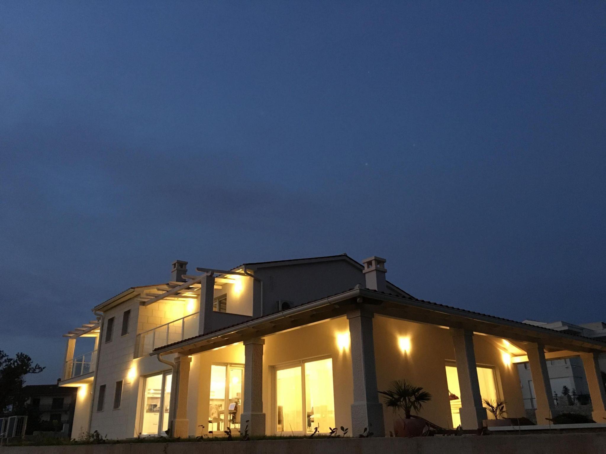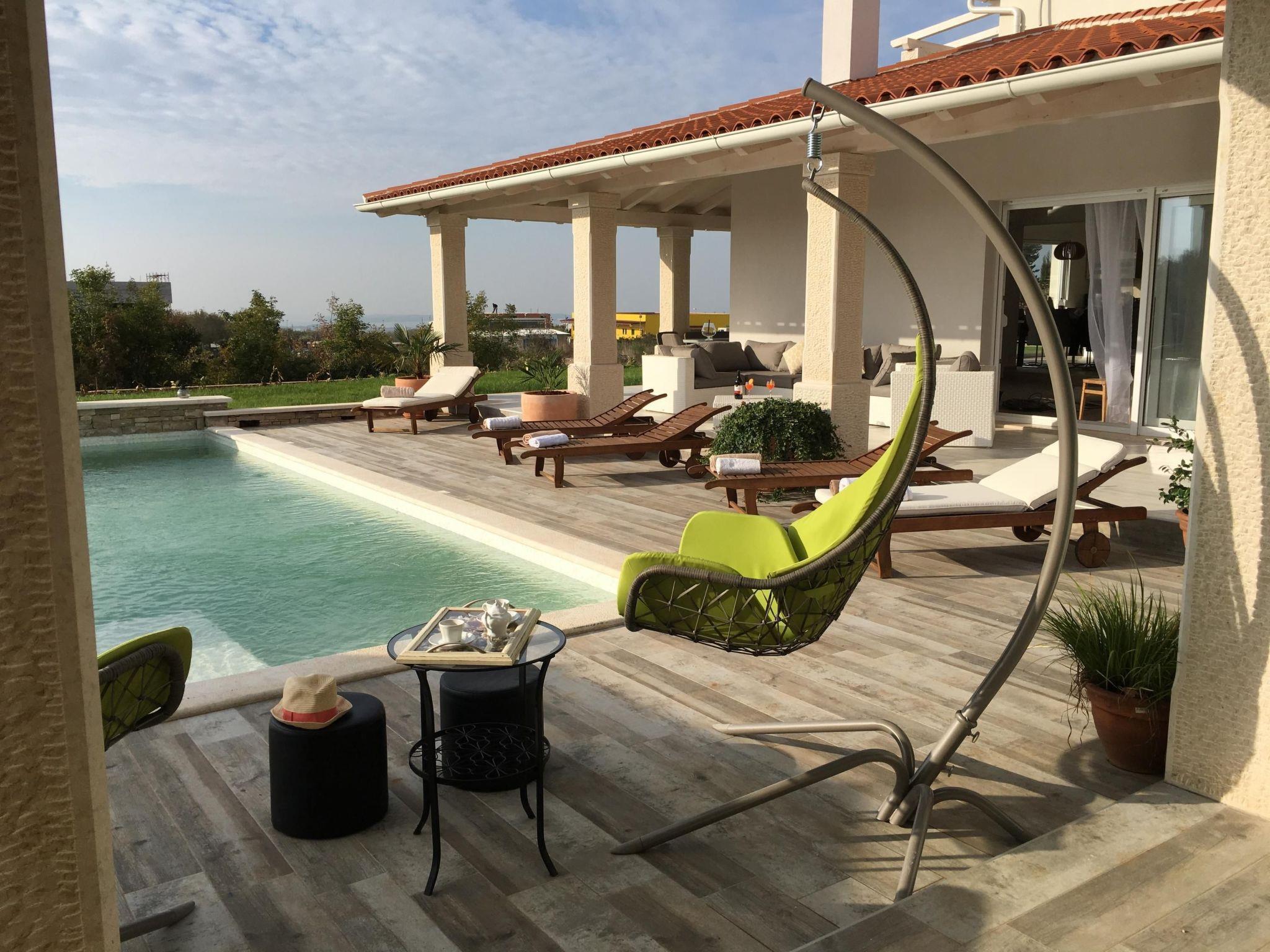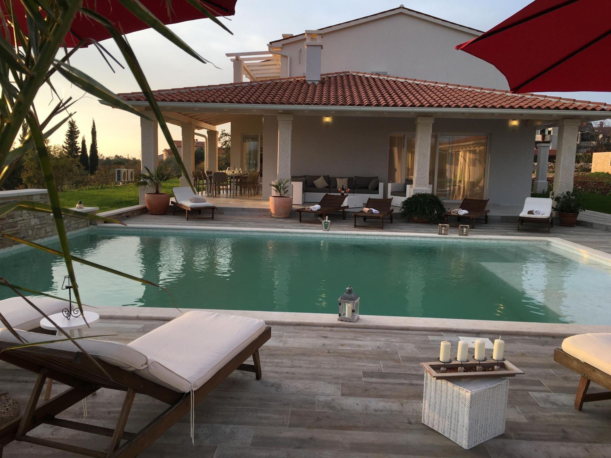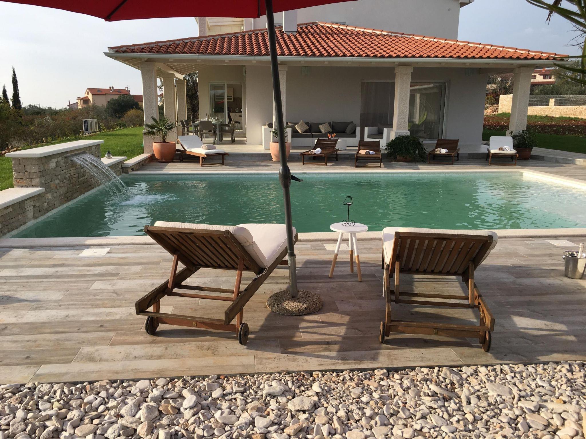 Sie wurde im Jahr 2016 neu, in einem modernen architektonischen Stil erbaut, wobei auf Komfort und ein wenig Luxus besonderer Wert gelegt wurde, damit sich auch besonders anspruchsvolle Gäste hier wohlfühlen. Die Wohnfläche von ca. 450m² ist in zwei Ebenen aufgeteilt. Auf der unteren Ebene der Villa liegen insgesamt drei Schlafzimmer, zwei mit Doppelbett und Duschbad en Suite und eines mit zwei Einzelbetten und einem nebenan liegenden Bad. Weitere vier Schlafzimmer mit Doppelbett und Bad en Suite, sowie eigenem Balkon, liegen im Obergeschoss, das über eine Treppe erreichbar ist. Alle Schlafzimmer verfügen über eine Klimaanlage mit Heizfunktion und sehr gute Video- und Audiogeräte. Der Wohnbereich, der mit eleganten Lederpolstermöbeln und einem Flachbildfernseher versehen ist, ist von der Küche durch große Glasvitrinen abgetrennt, sodass der ganze Raum angenehm lichtdurchflutet ist. Der moderne Küchenblock ist komplett ausgestattet und verfügt unter anderem über einen Geschirrspüler, eine Mikrowelle und eine Kaffeemaschine. Davor steht eine Theke, die perfekt ist für das Frühstück oder eine schnelle Mahlzeit. Ein großer Esstisch mit Stühlen vervollständigt die Einrichtung. Auch der Wohn- und Kochbereich sind klimatisiert (warm/kalt). Eine kostenfreie WLAN-Internetverbindung guter Qualität ist sowohl in der Villa, als auch in den Außenbereichen verfügbar. Bettwäsche und Handtücher werden vom Vermieter gestellt. Ein Sofa im Wohnbereich ist zu einem Doppelbett ausziehbar. Auf Wunsch können auch Zusatzbetten in den geräumigen Schlafzimmern aufgestellt werden, sodass insgesamt bis zu achtzehn Personen in der Villa Platz finden.