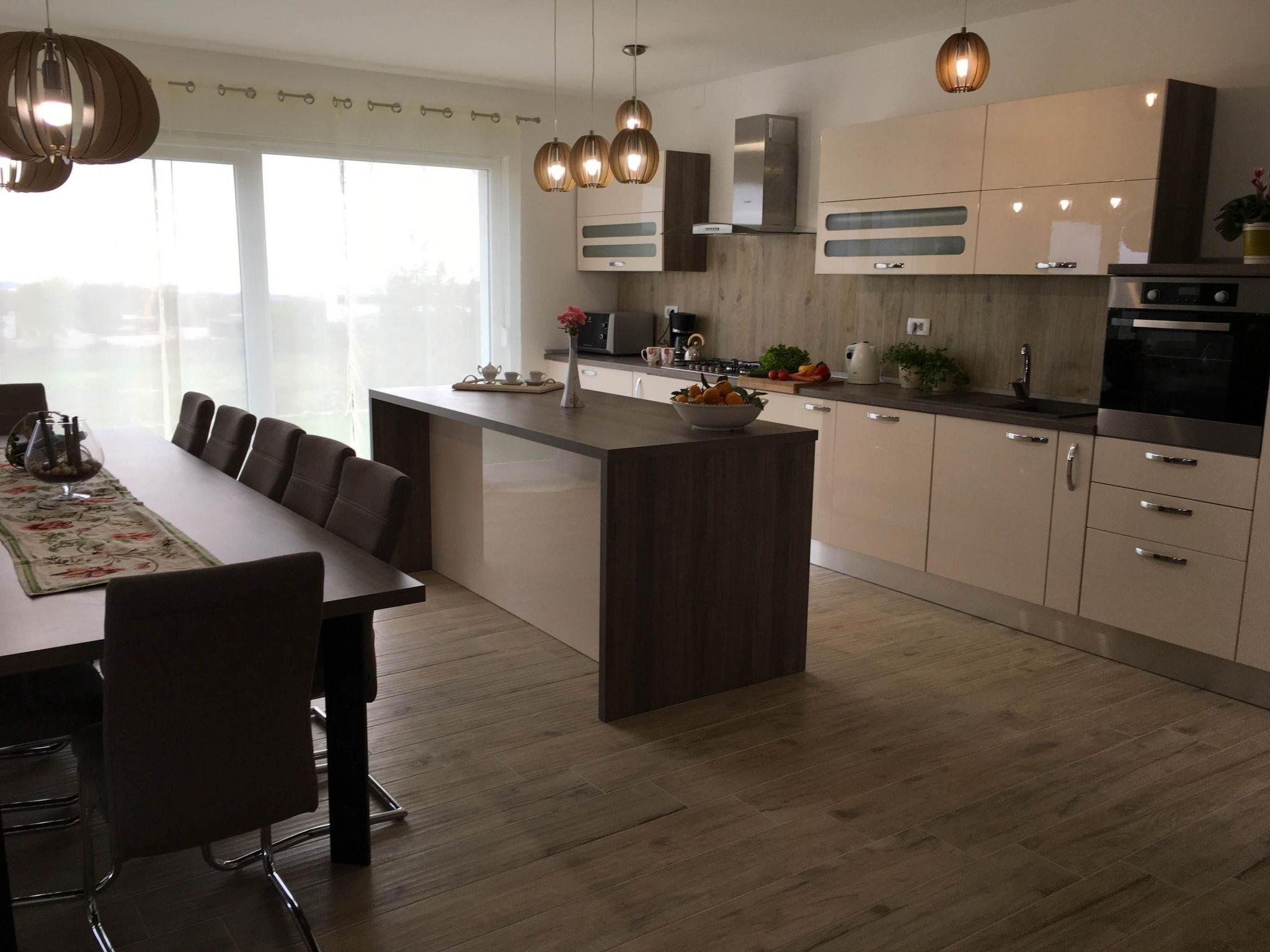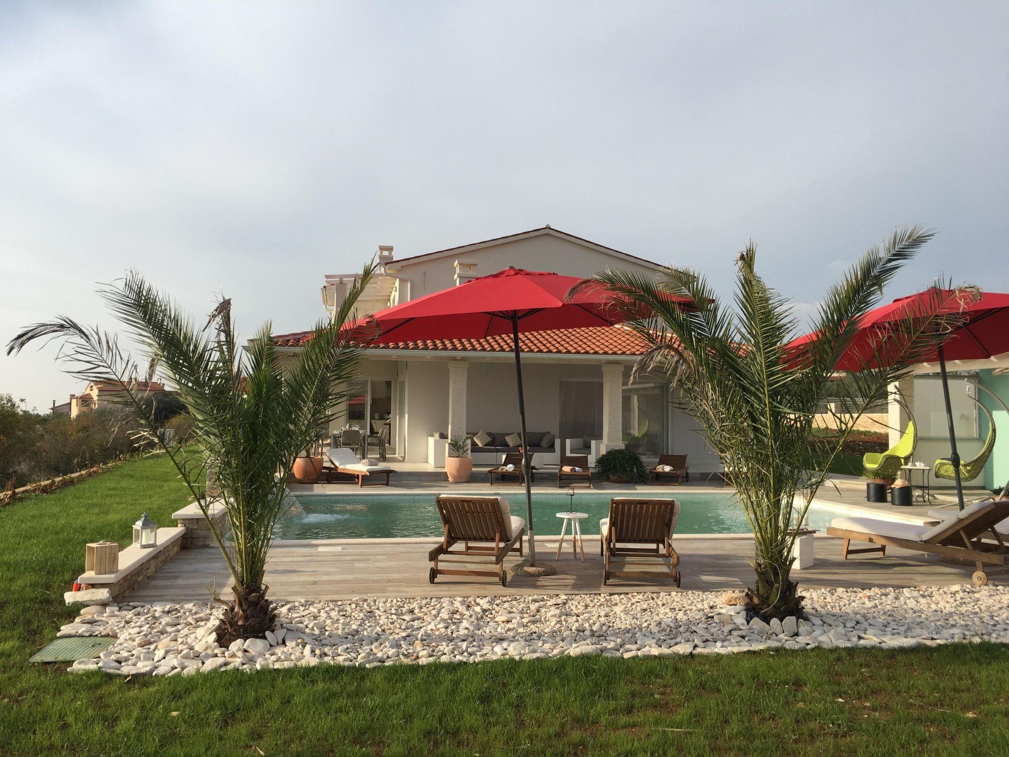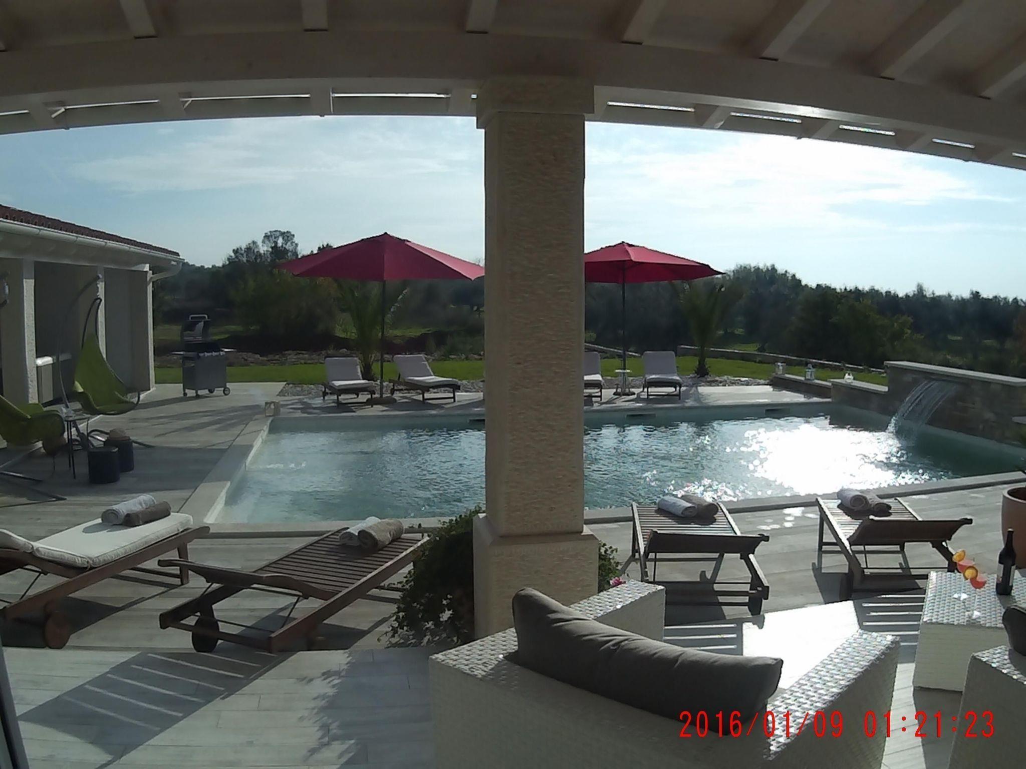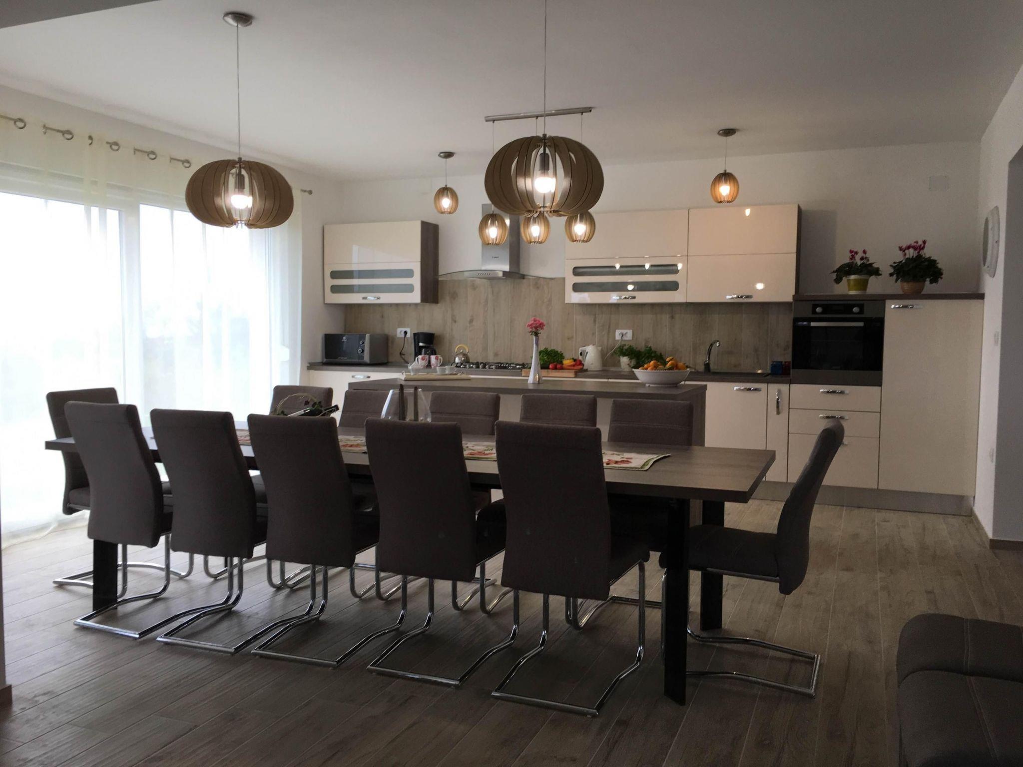 Sie wurde im Jahr 2016 neu, in einem modernen architektonischen Stil erbaut, wobei auf Komfort und ein wenig Luxus besonderer Wert gelegt wurde, damit sich auch besonders anspruchsvolle Gäste hier wohlfühlen. Die Wohnfläche von ca. 450m² ist in zwei Ebenen aufgeteilt. Auf der unteren Ebene der Villa liegen insgesamt drei Schlafzimmer, zwei mit Doppelbett und Duschbad en Suite und eines mit zwei Einzelbetten und einem nebenan liegenden Bad. Weitere vier Schlafzimmer mit Doppelbett und Bad en Suite, sowie eigenem Balkon, liegen im Obergeschoss, das über eine Treppe erreichbar ist. Alle Schlafzimmer verfügen über eine Klimaanlage mit Heizfunktion und sehr gute Video- und Audiogeräte. Der Wohnbereich, der mit eleganten Lederpolstermöbeln und einem Flachbildfernseher versehen ist, ist von der Küche durch große Glasvitrinen abgetrennt, sodass der ganze Raum angenehm lichtdurchflutet ist. Der moderne Küchenblock ist komplett ausgestattet und verfügt unter anderem über einen Geschirrspüler, eine Mikrowelle und eine Kaffeemaschine. Davor steht eine Theke, die perfekt ist für das Frühstück oder eine schnelle Mahlzeit. Ein großer Esstisch mit Stühlen vervollständigt die Einrichtung. Auch der Wohn- und Kochbereich sind klimatisiert (warm/kalt). Eine kostenfreie WLAN-Internetverbindung guter Qualität ist sowohl in der Villa, als auch in den Außenbereichen verfügbar. Bettwäsche und Handtücher werden vom Vermieter gestellt. Ein Sofa im Wohnbereich ist zu einem Doppelbett ausziehbar. Auf Wunsch können auch Zusatzbetten in den geräumigen Schlafzimmern aufgestellt werden, sodass insgesamt bis zu achtzehn Personen in der Villa Platz finden.