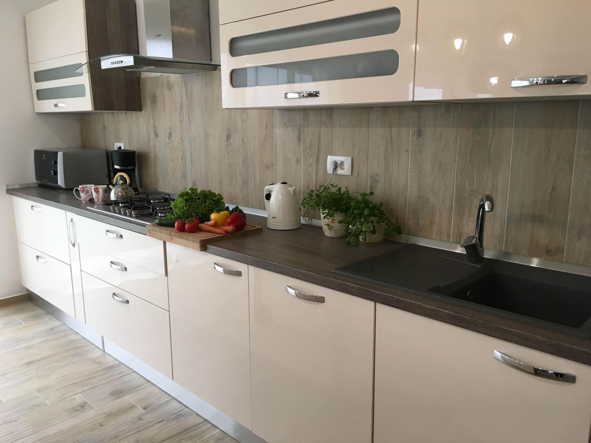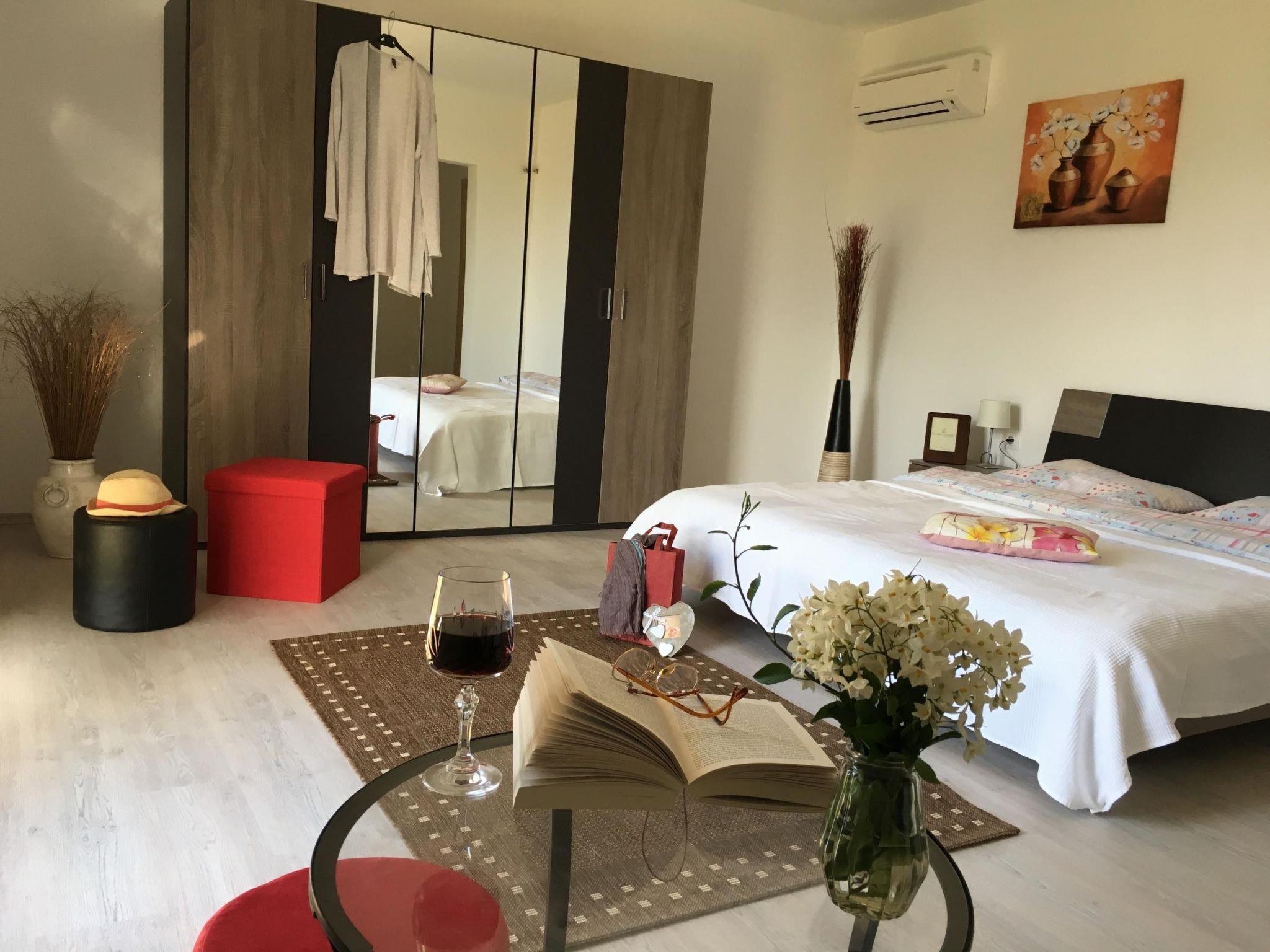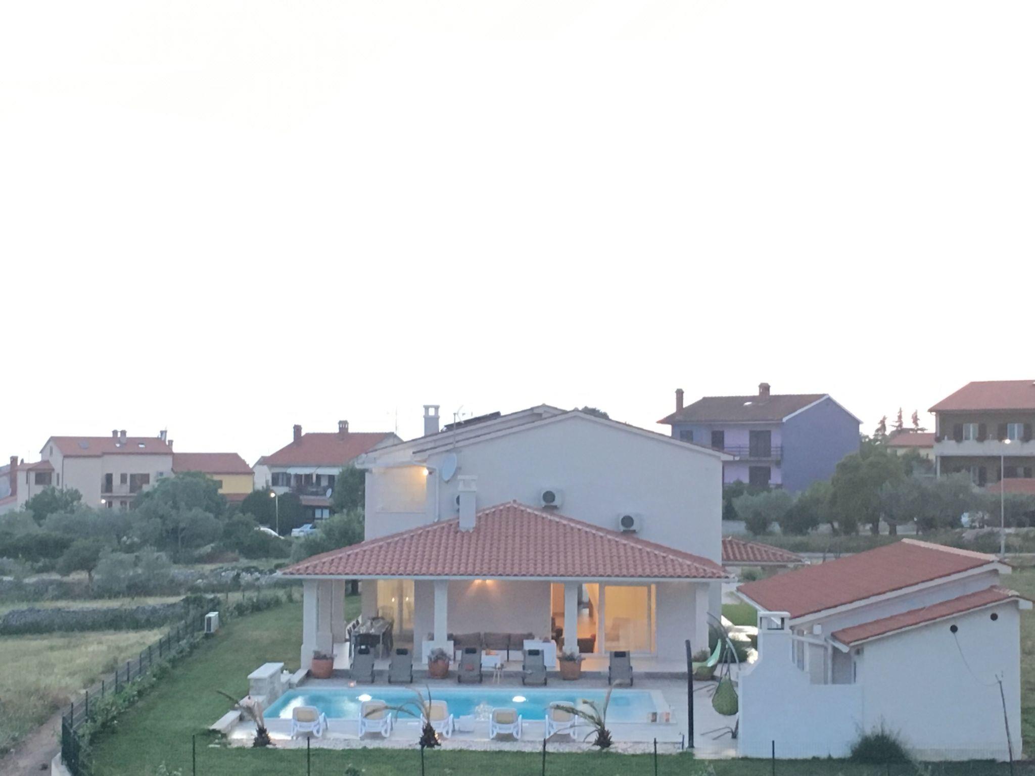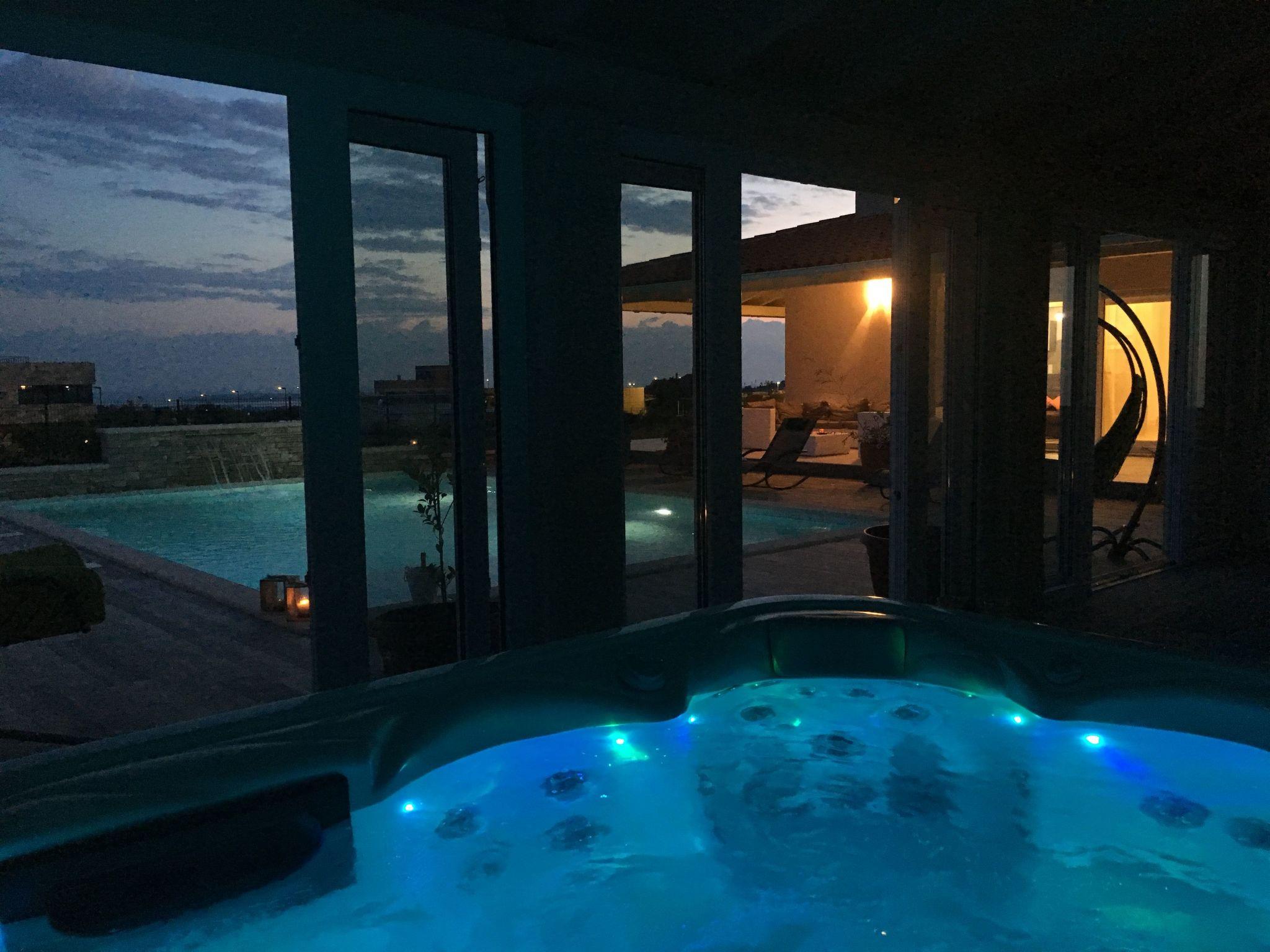 Sie wurde im Jahr 2016 neu, in einem modernen architektonischen Stil erbaut, wobei auf Komfort und ein wenig Luxus besonderer Wert gelegt wurde, damit sich auch besonders anspruchsvolle Gäste hier wohlfühlen. Die Wohnfläche von ca. 450m² ist in zwei Ebenen aufgeteilt. Auf der unteren Ebene der Villa liegen insgesamt drei Schlafzimmer, zwei mit Doppelbett und Duschbad en Suite und eines mit zwei Einzelbetten und einem nebenan liegenden Bad. Weitere vier Schlafzimmer mit Doppelbett und Bad en Suite, sowie eigenem Balkon, liegen im Obergeschoss, das über eine Treppe erreichbar ist. Alle Schlafzimmer verfügen über eine Klimaanlage mit Heizfunktion und sehr gute Video- und Audiogeräte. Der Wohnbereich, der mit eleganten Lederpolstermöbeln und einem Flachbildfernseher versehen ist, ist von der Küche durch große Glasvitrinen abgetrennt, sodass der ganze Raum angenehm lichtdurchflutet ist. Der moderne Küchenblock ist komplett ausgestattet und verfügt unter anderem über einen Geschirrspüler, eine Mikrowelle und eine Kaffeemaschine. Davor steht eine Theke, die perfekt ist für das Frühstück oder eine schnelle Mahlzeit. Ein großer Esstisch mit Stühlen vervollständigt die Einrichtung. Auch der Wohn- und Kochbereich sind klimatisiert (warm/kalt). Eine kostenfreie WLAN-Internetverbindung guter Qualität ist sowohl in der Villa, als auch in den Außenbereichen verfügbar. Bettwäsche und Handtücher werden vom Vermieter gestellt. Ein Sofa im Wohnbereich ist zu einem Doppelbett ausziehbar. Auf Wunsch können auch Zusatzbetten in den geräumigen Schlafzimmern aufgestellt werden, sodass insgesamt bis zu achtzehn Personen in der Villa Platz finden.